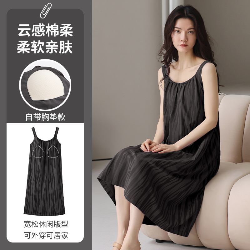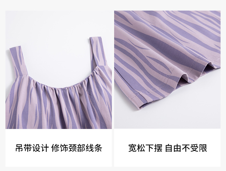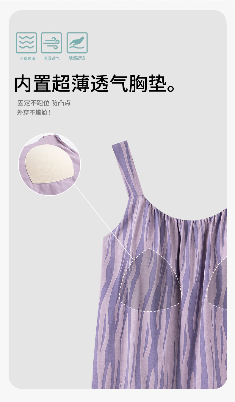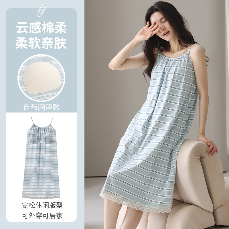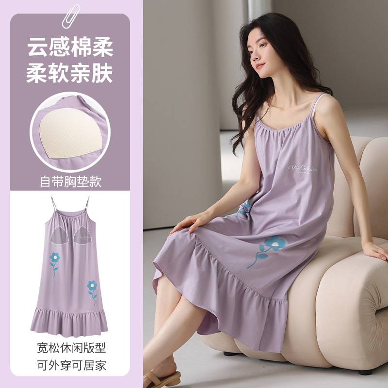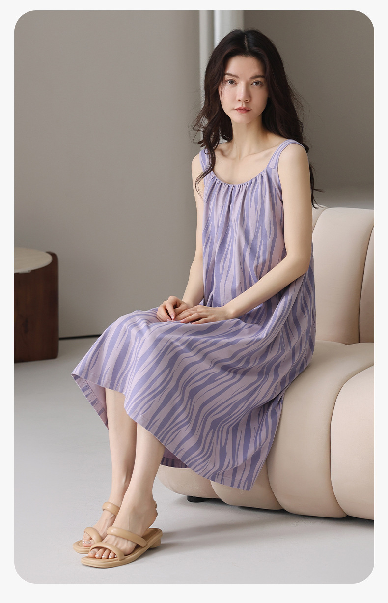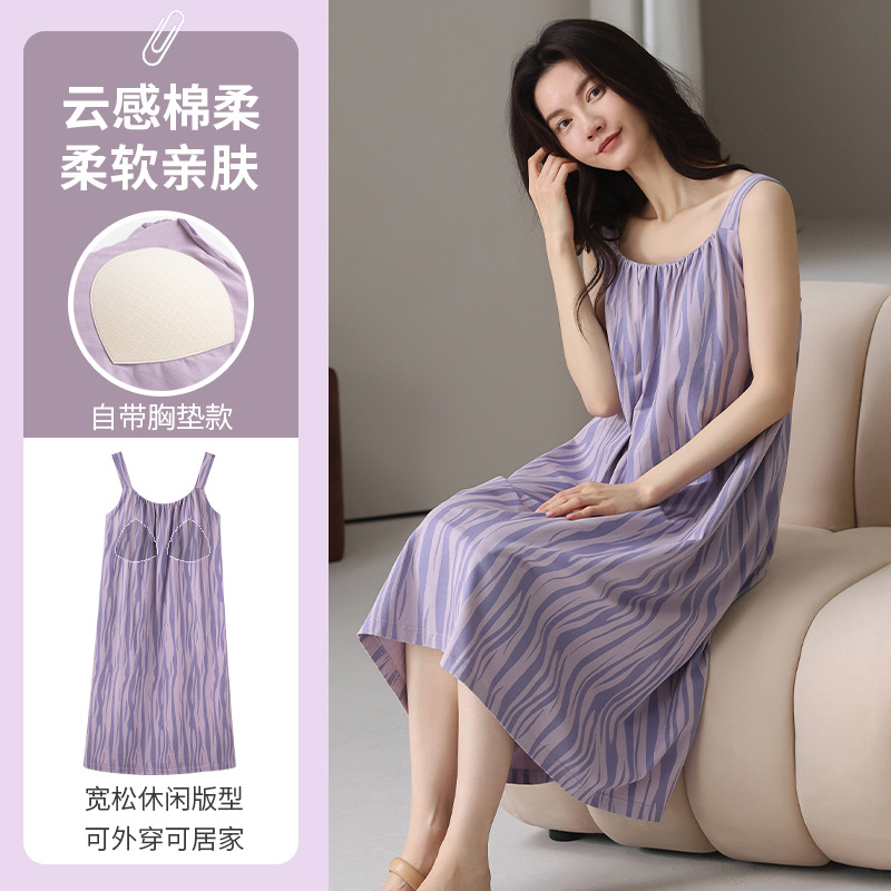 여성용 여름 순면 2025 서스펜더 스트라이프 보라색 얇은 스타일의 가슴 패드가 있는 잠옷은 고급 홈웨어 외부에 착용할 수 있습니다.스토어 가기