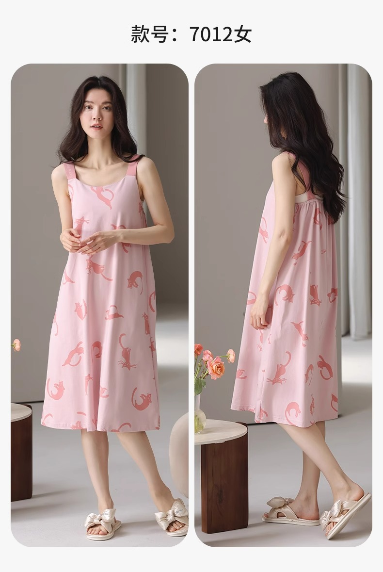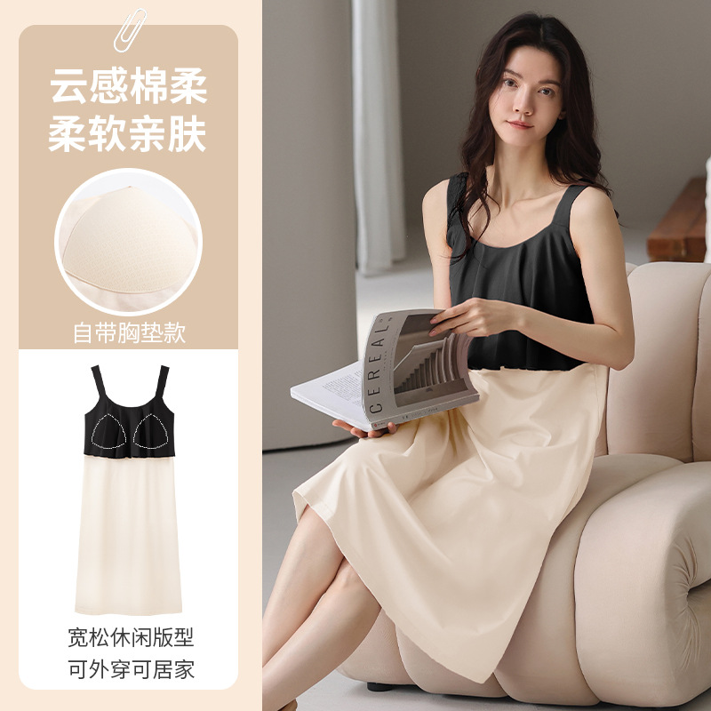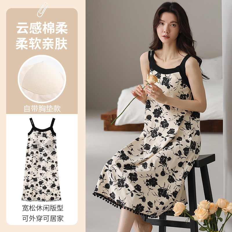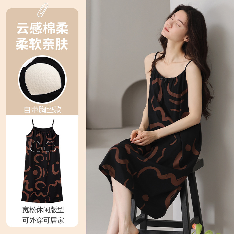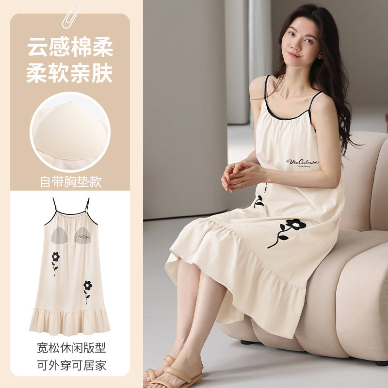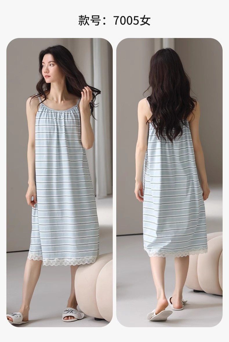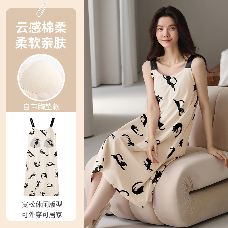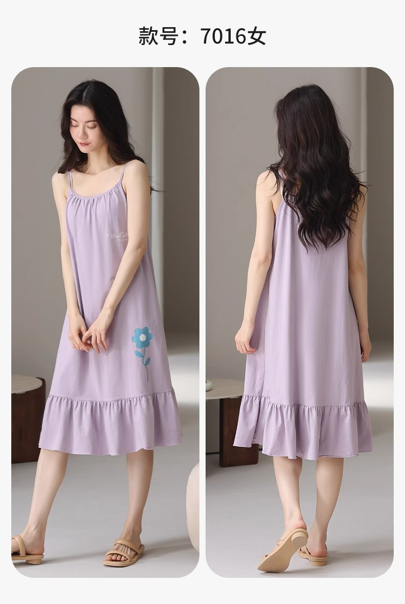 여성용 여름 순면 2025 서스펜더 스트라이프 보라색 얇은 스타일의 가슴 패드가 있는 잠옷은 고급 홈웨어 외부에 착용할 수 있습니다.스토어 가기