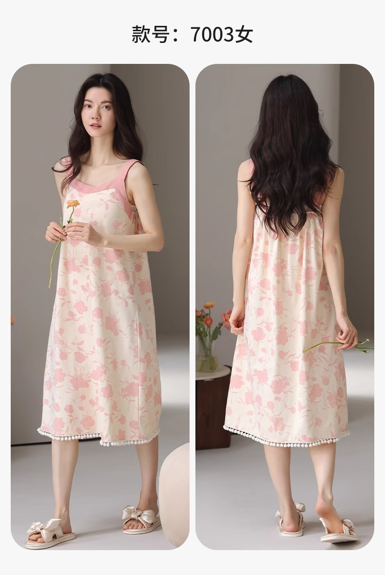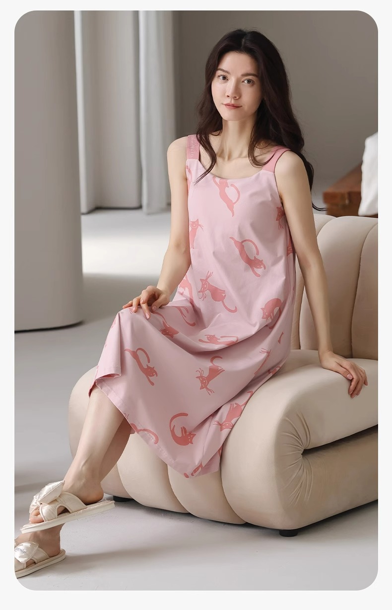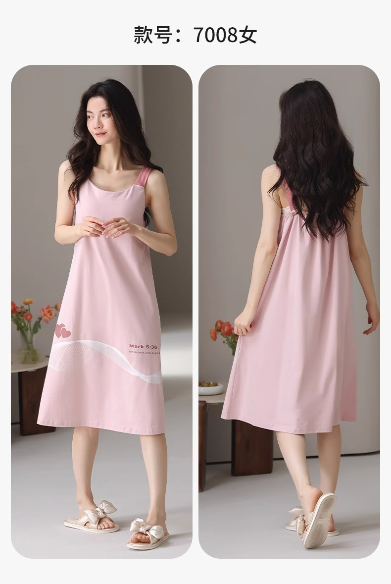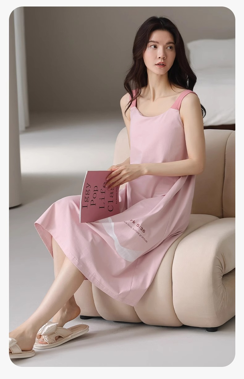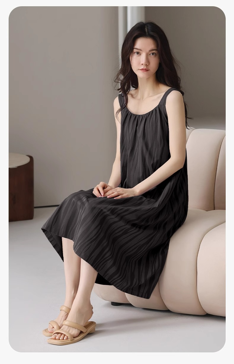 여성용 여름 순면 2025 서스펜더 스트라이프 보라색 얇은 스타일의 가슴 패드가 있는 잠옷은 고급 홈웨어 외부에 착용할 수 있습니다.스토어 가기