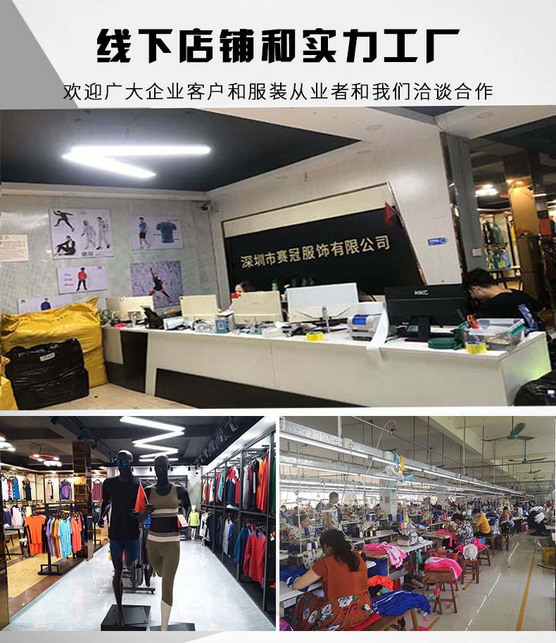 深圳市赛冠体育服饰有限公司创建于二0一0年,座落于广东省深圳市宝安区的美丽之乡-西乡。旗下制衣、绣花、印花制作三条流水线100多人,面积2500平米,设备有:自动裁床10条,电脑平车200台,电脑四线车300台,冚车150台,五线车100台,拉橡巾车50台,订四合扣车20台,钮门车20台,订扣车20台;员工稳定在500多人,年生产能力每间厂300万件,是一家生产规模较大的运动服装生产基地,本公司集开发、设计、生产、销售为一体的具有现代风格的专业运动服公司。公司拥有一流的运动服销售,设计专业团队人才;并引进国内外的设计、裁剪、生产、整烫等设备。