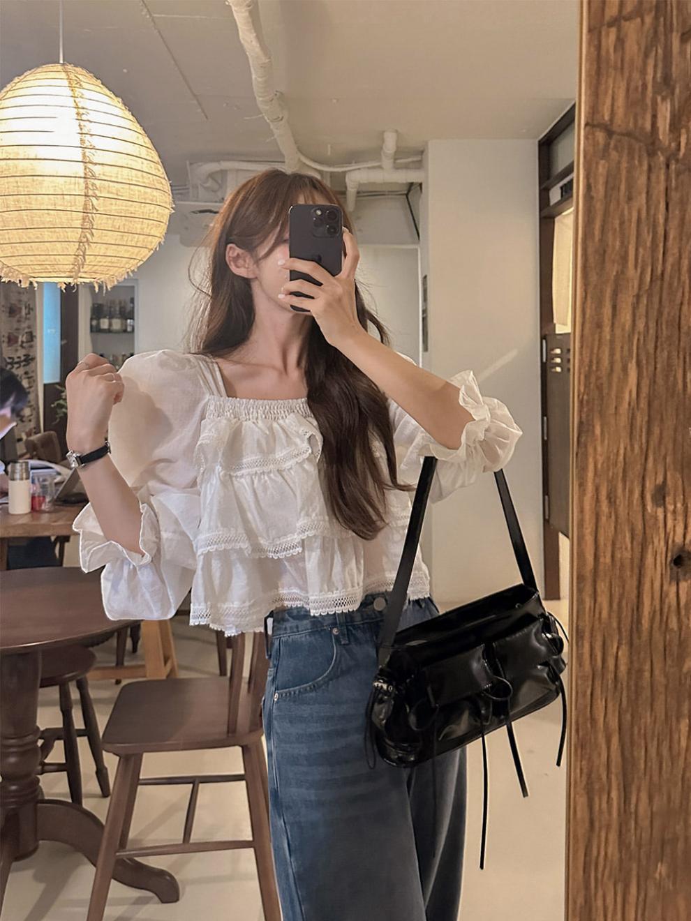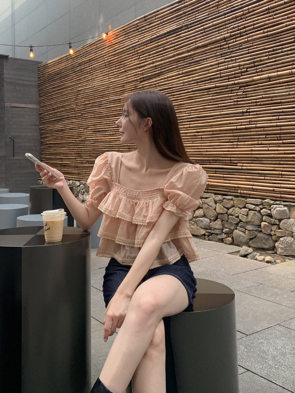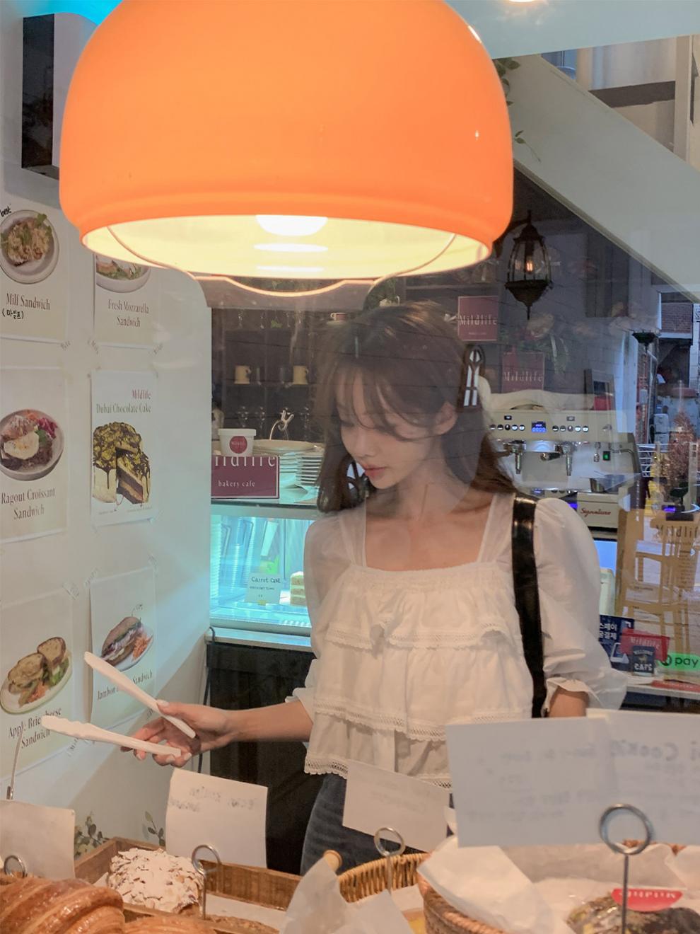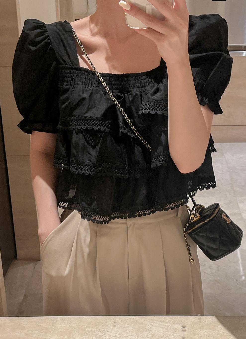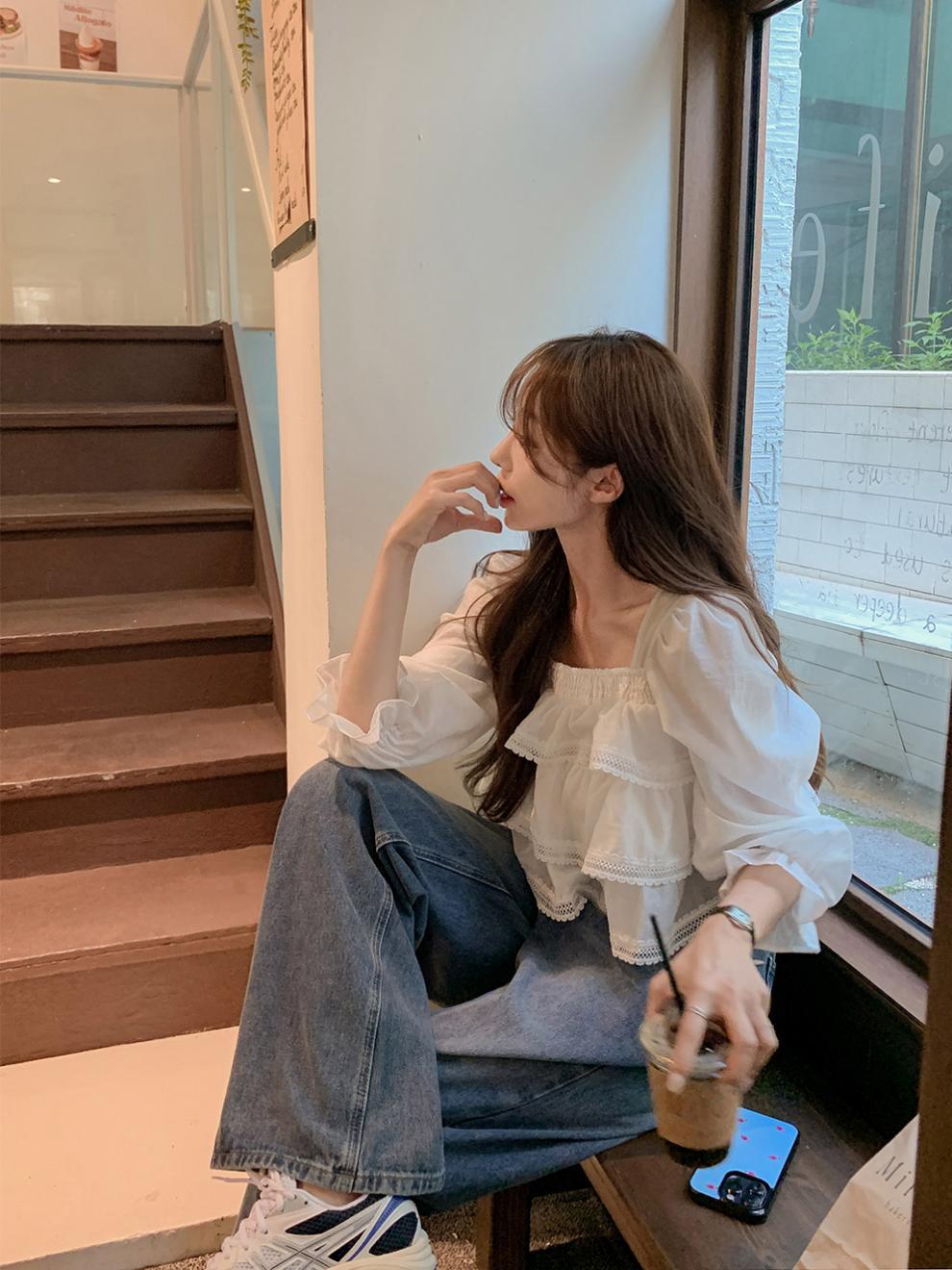 한국 여성 하이 엔드 중공업 스위트 레이스 쉬폰 셔츠 한국식 세련된 패션 디자인 센스 걸스토어 가기