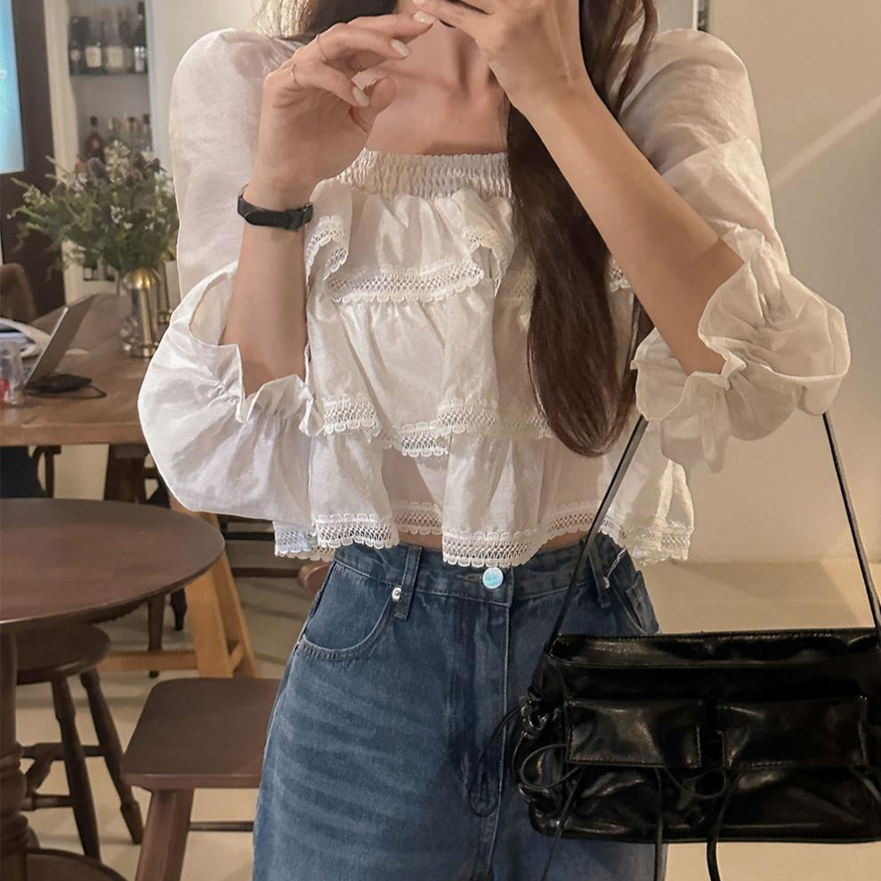 한국 여성 하이 엔드 중공업 스위트 레이스 쉬폰 셔츠 한국식 세련된 패션 디자인 센스 걸