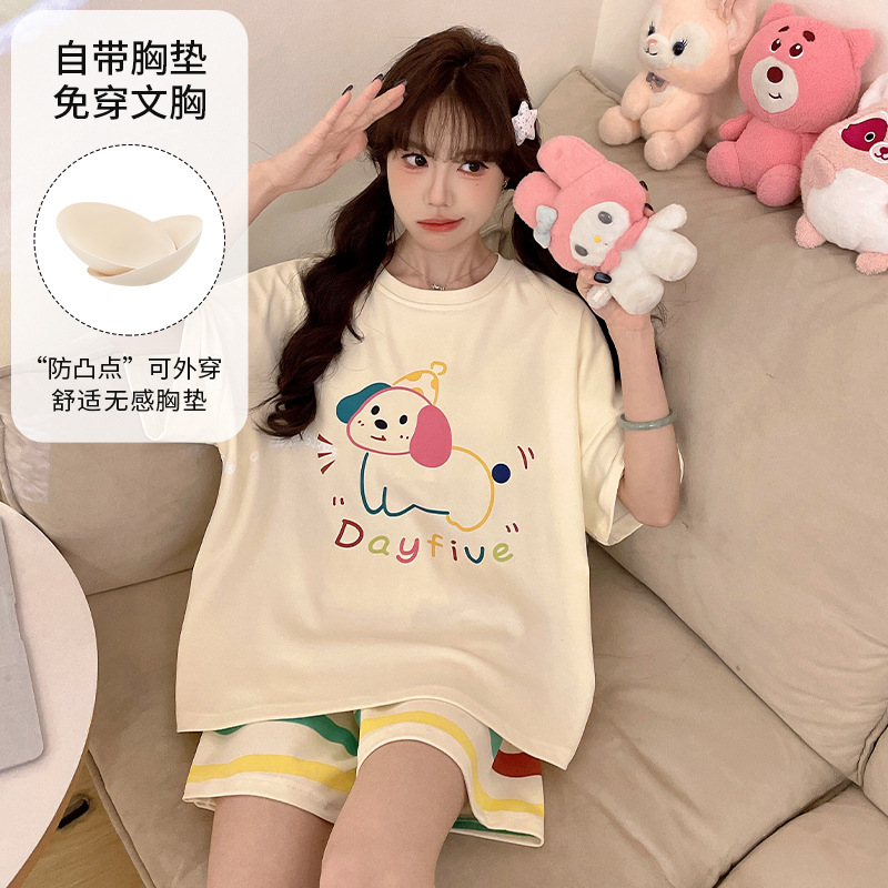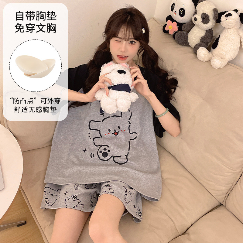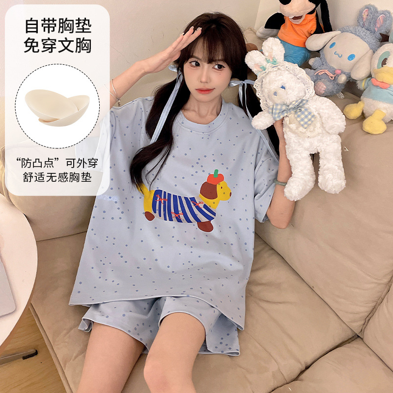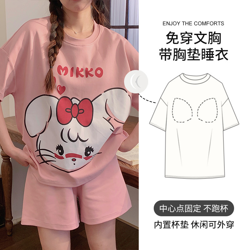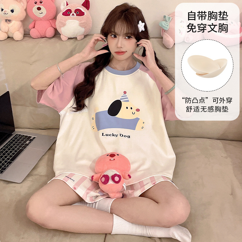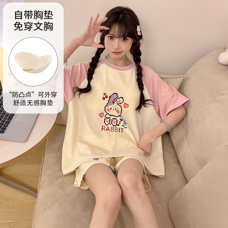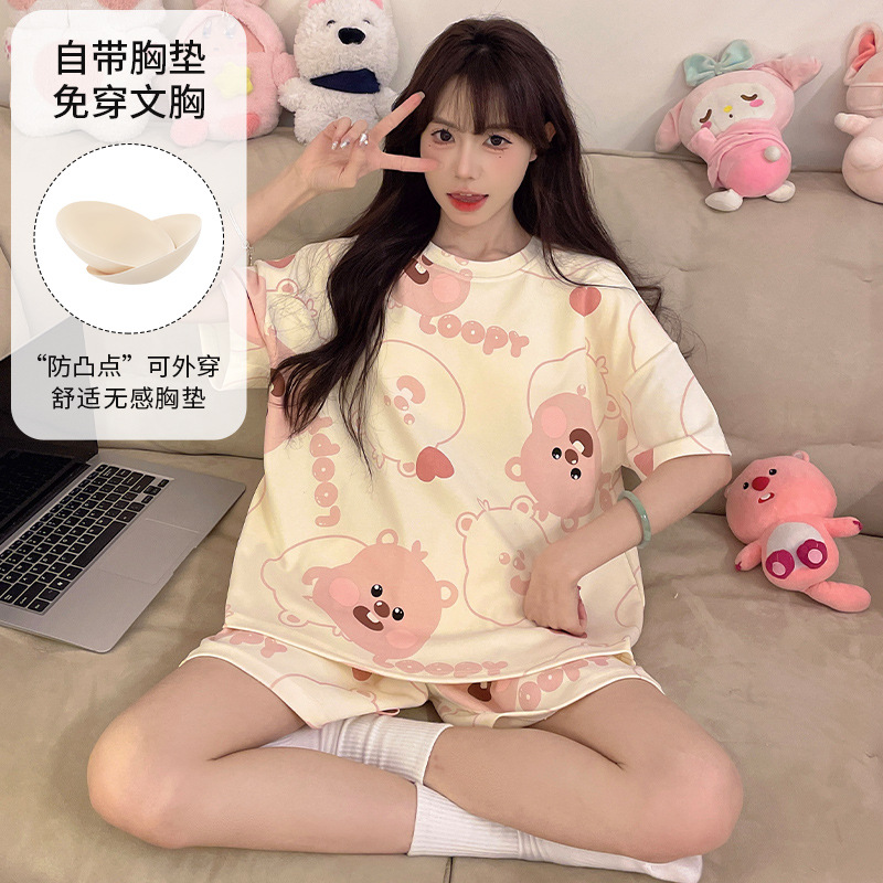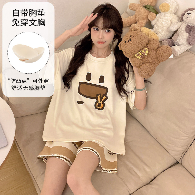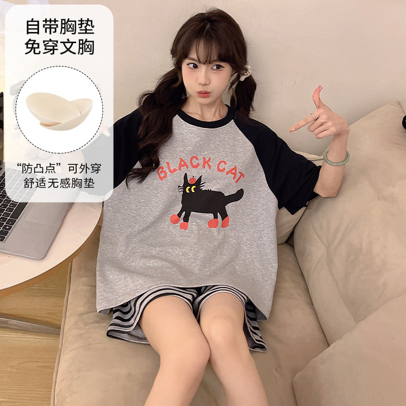 2025 봄과 여름 새로운 스타일 파자마 가슴 패드 여성의 만화 귀여운 고양이 학생 홈 옷 세트 짧은 소매