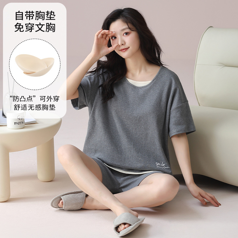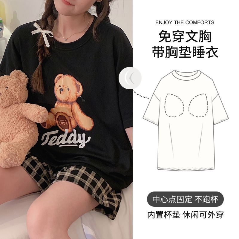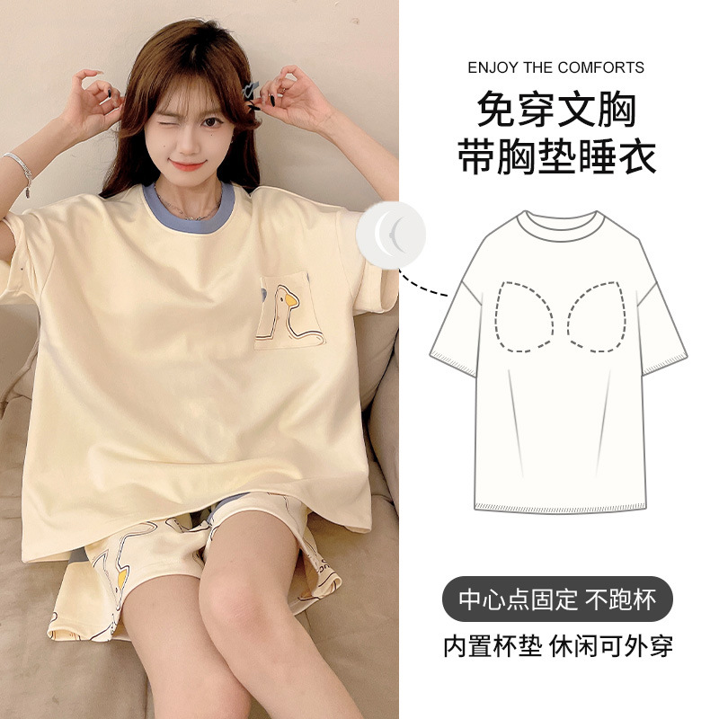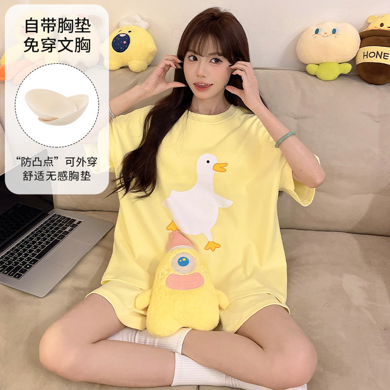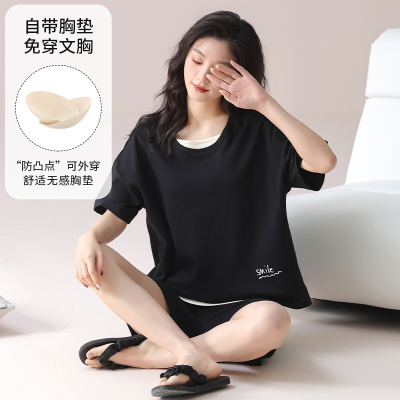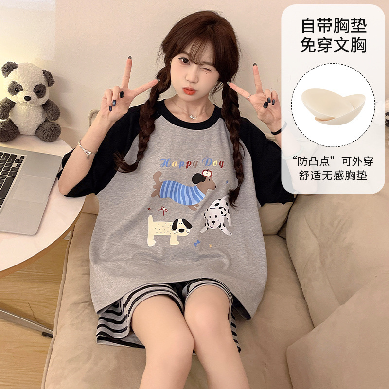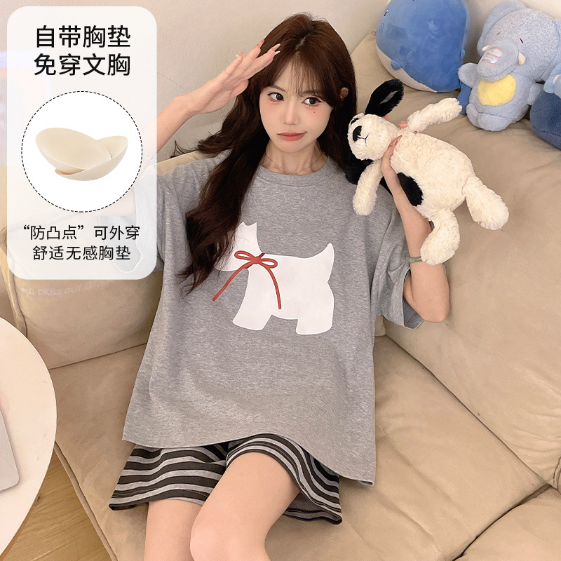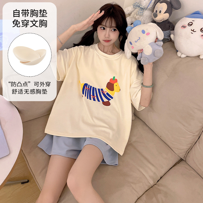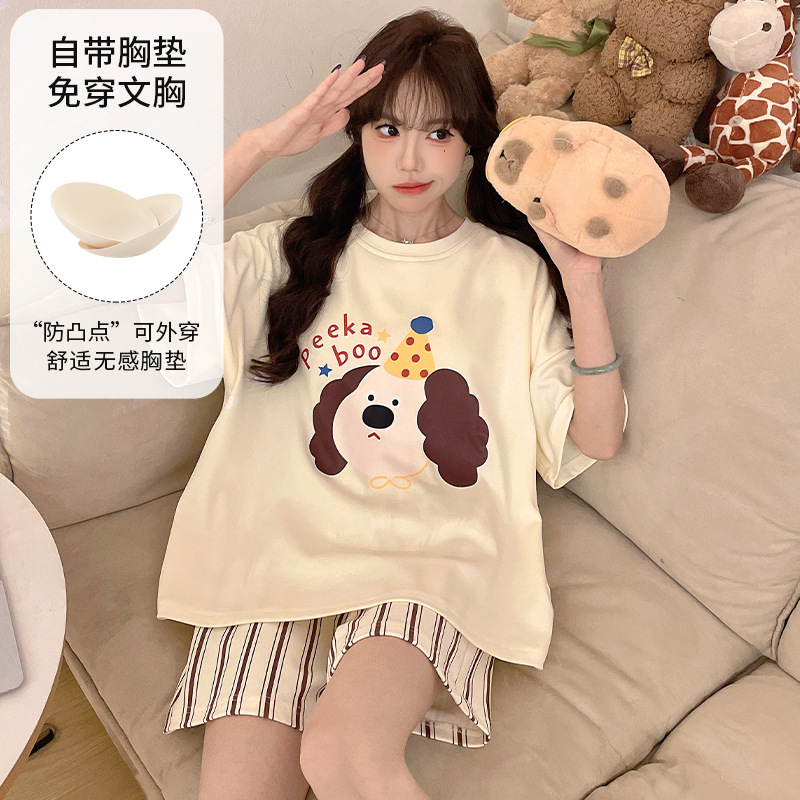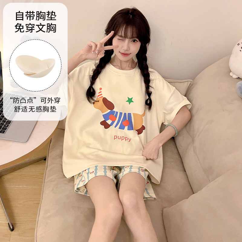 2025 봄과 여름 새로운 스타일 파자마 가슴 패드 여성의 만화 귀여운 고양이 학생 홈 옷 세트 짧은 소매