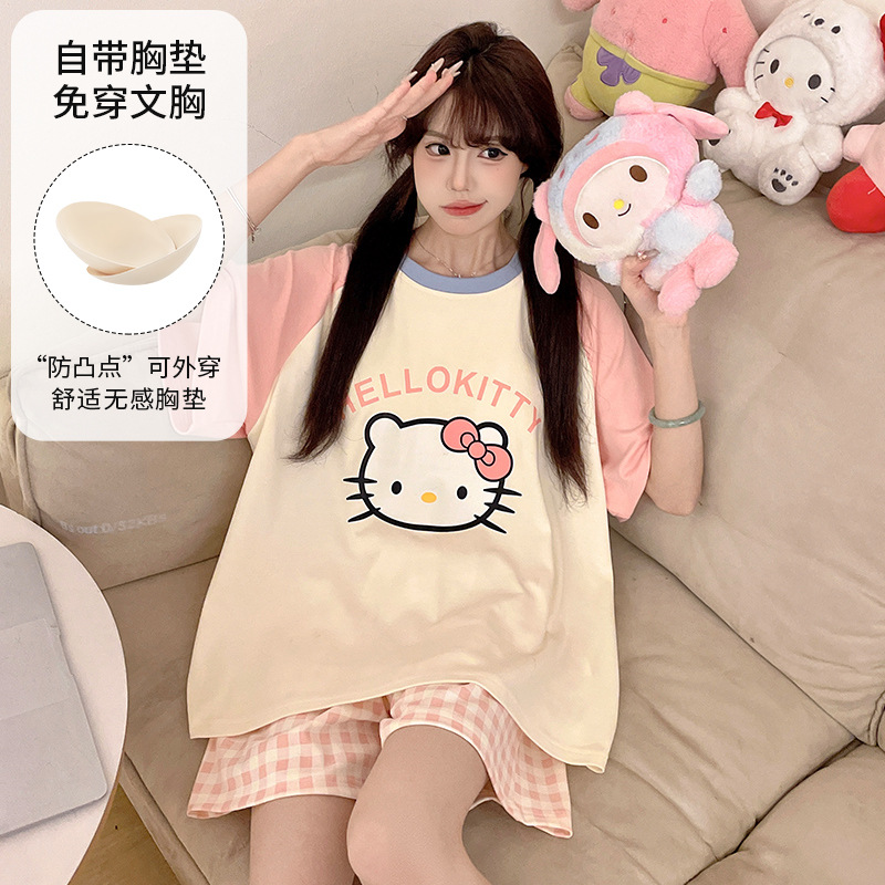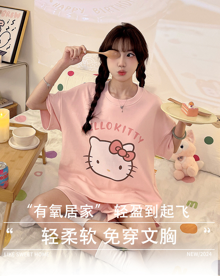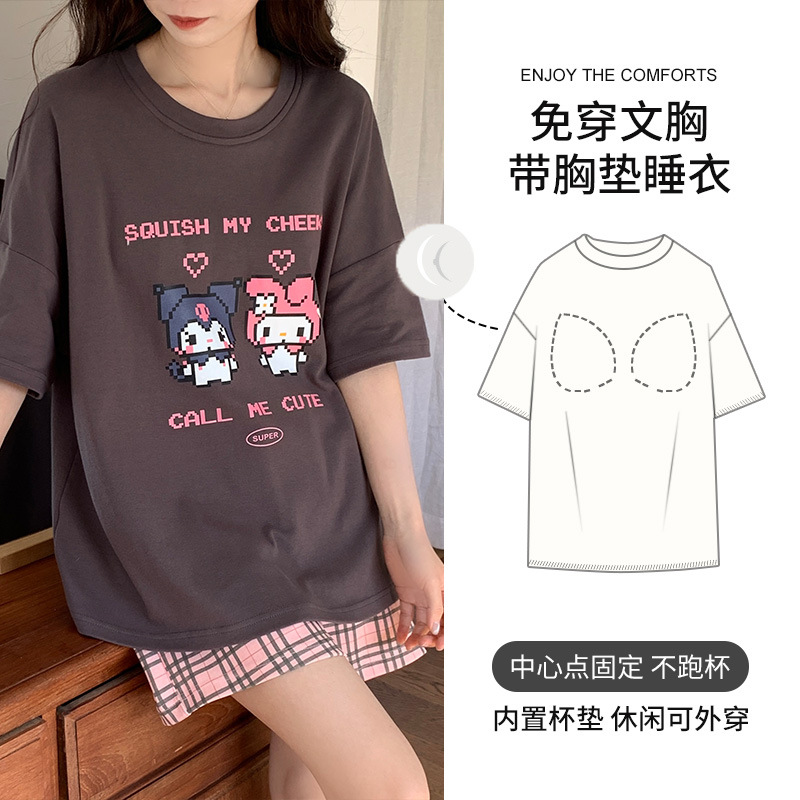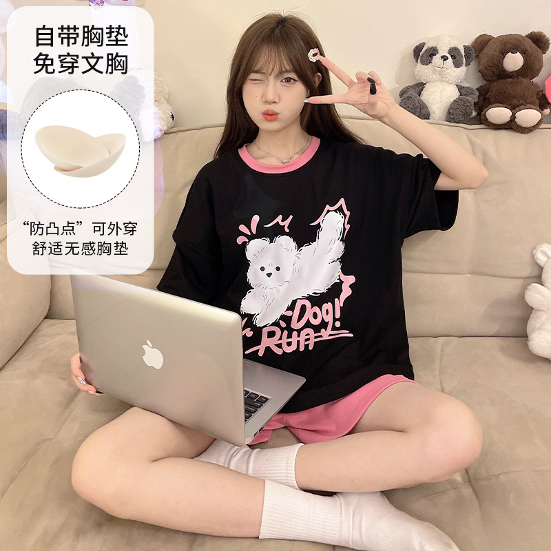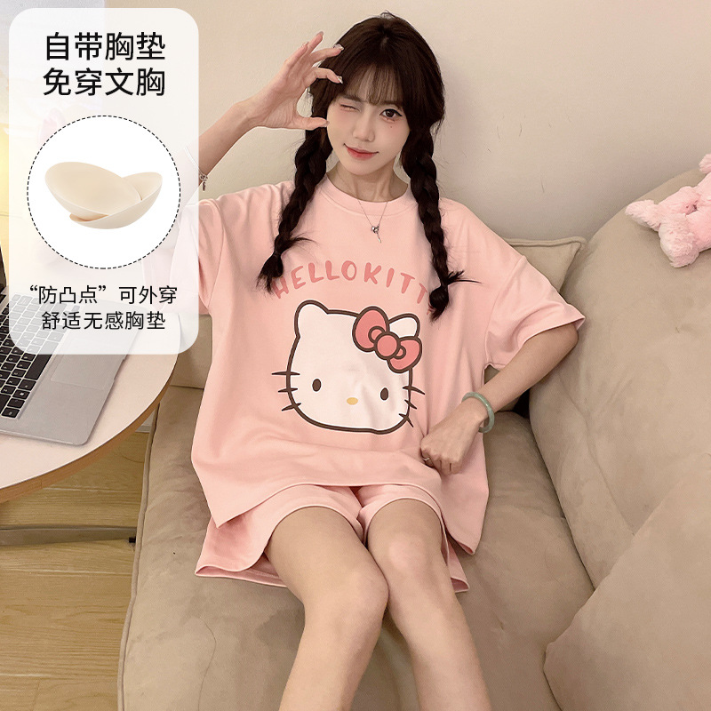 2025 봄과 여름 새로운 스타일 파자마 가슴 패드 여성의 만화 귀여운 고양이 학생 홈 옷 세트 짧은 소매스토어 가기