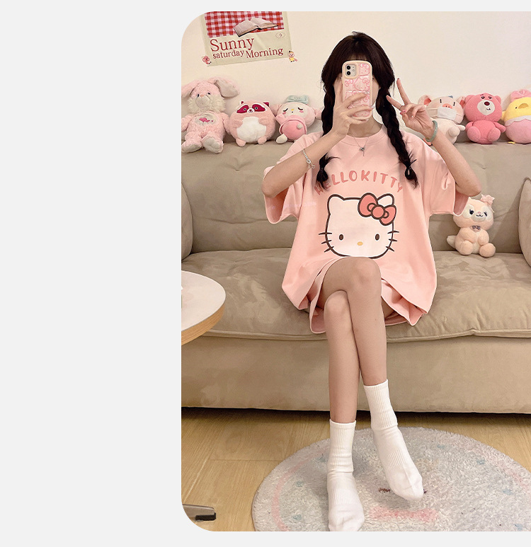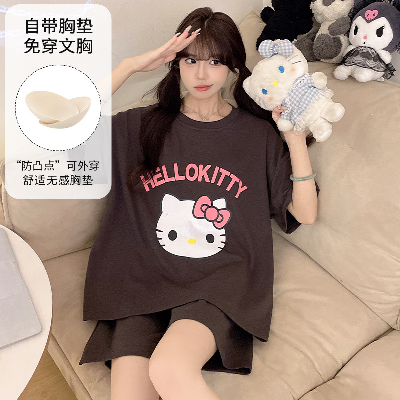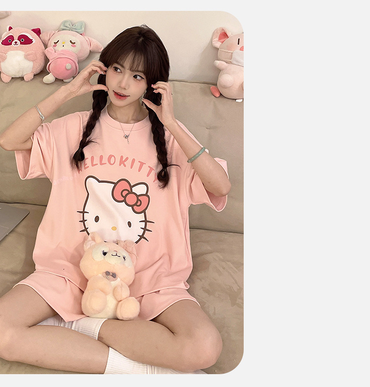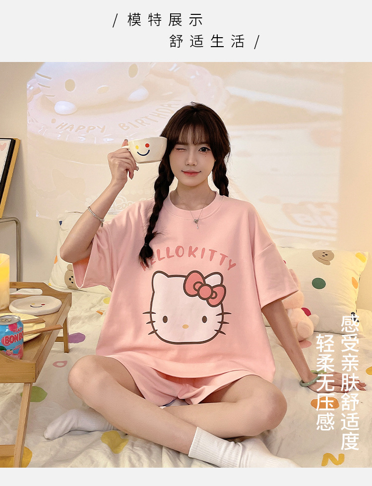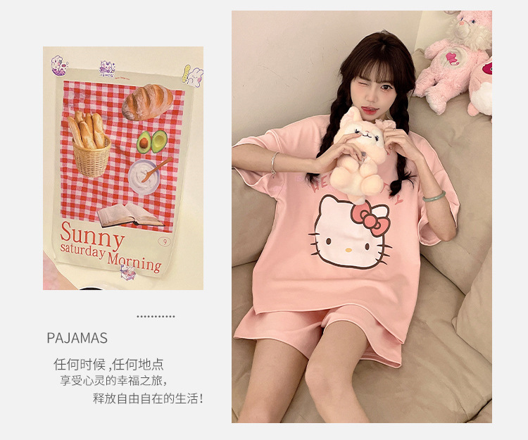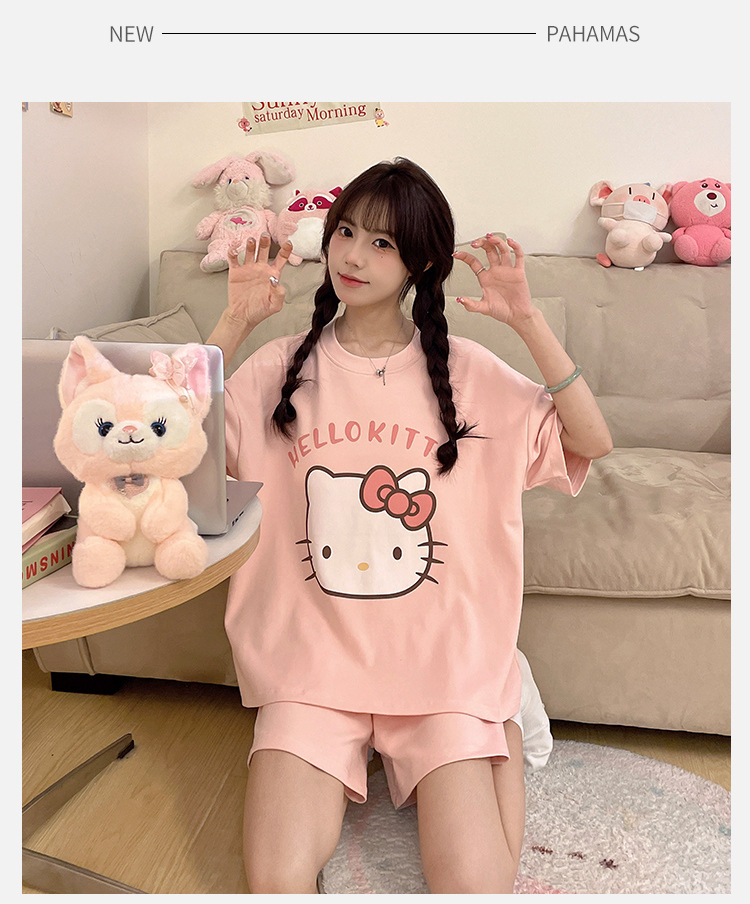 2025 봄과 여름 새로운 스타일 파자마 가슴 패드 여성의 만화 귀여운 고양이 학생 홈 옷 세트 짧은 소매스토어 가기