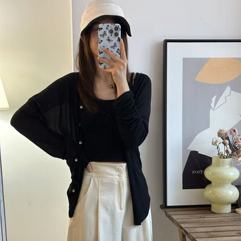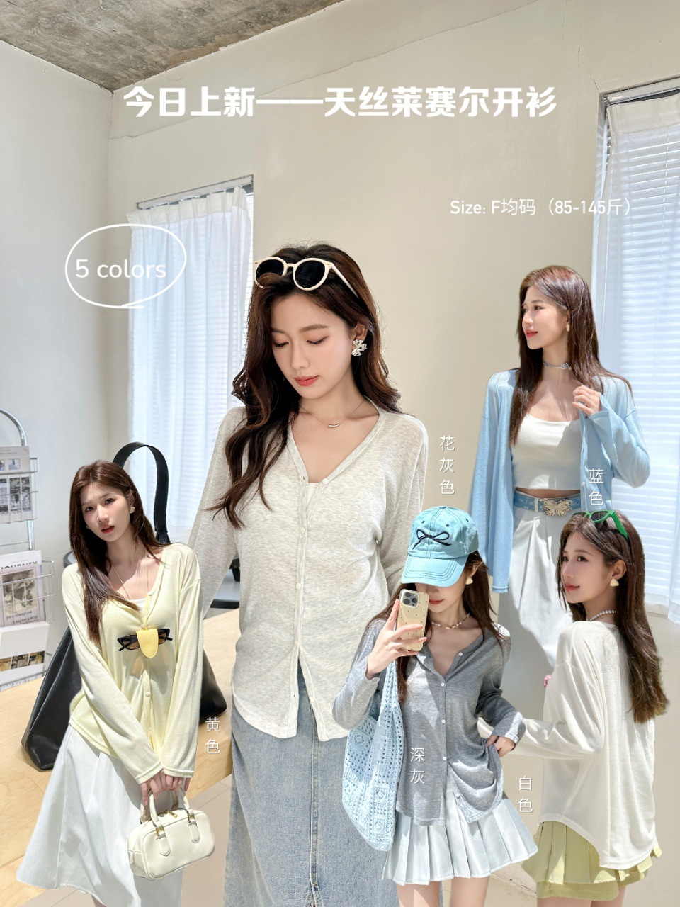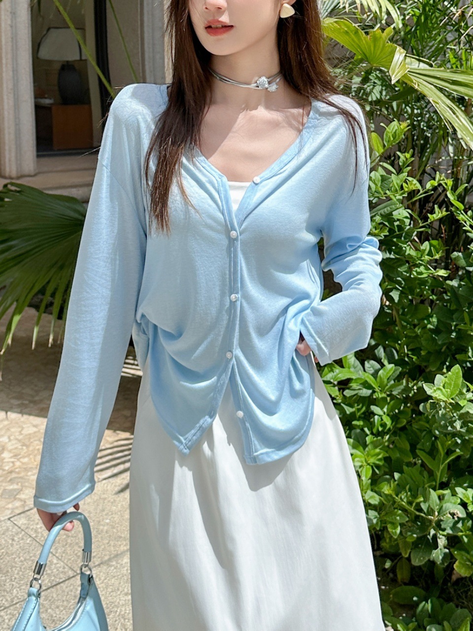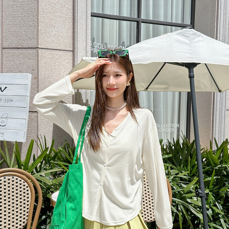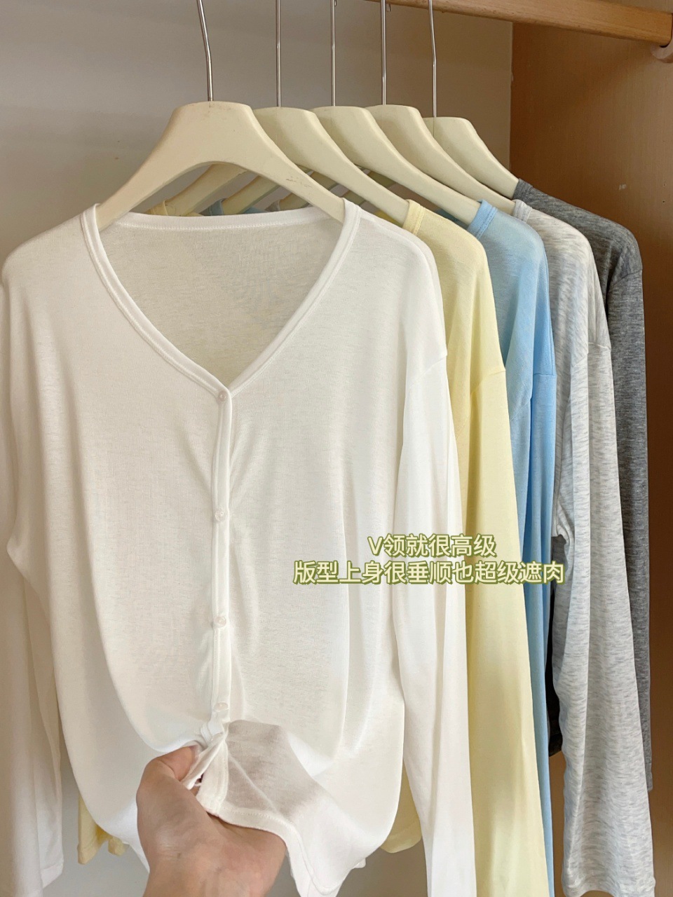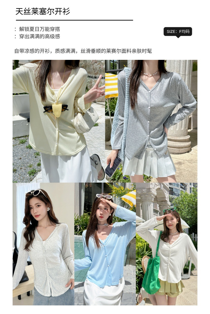 여름 얇은 텐셀 카디건 태양 보호 의류 여성 한국식 느슨한 게으른 스타일 V 넥 니트 에어컨 셔츠 코트 티셔츠