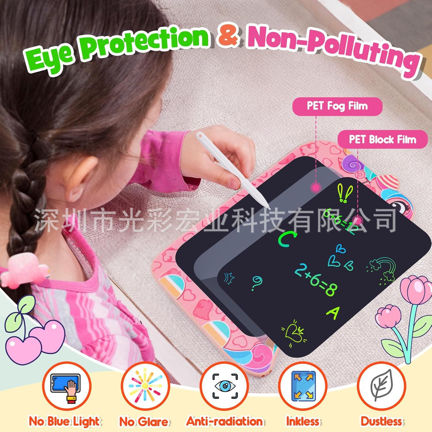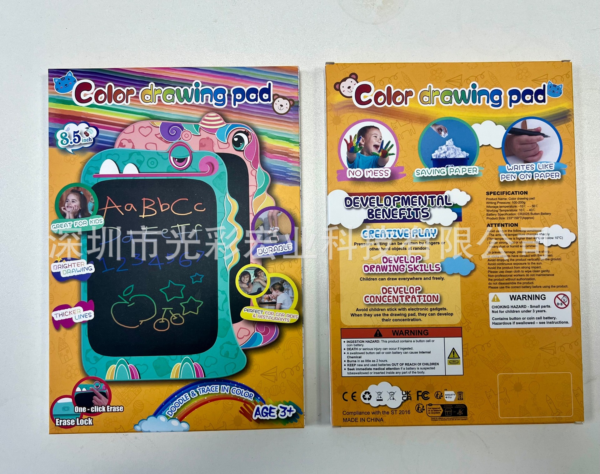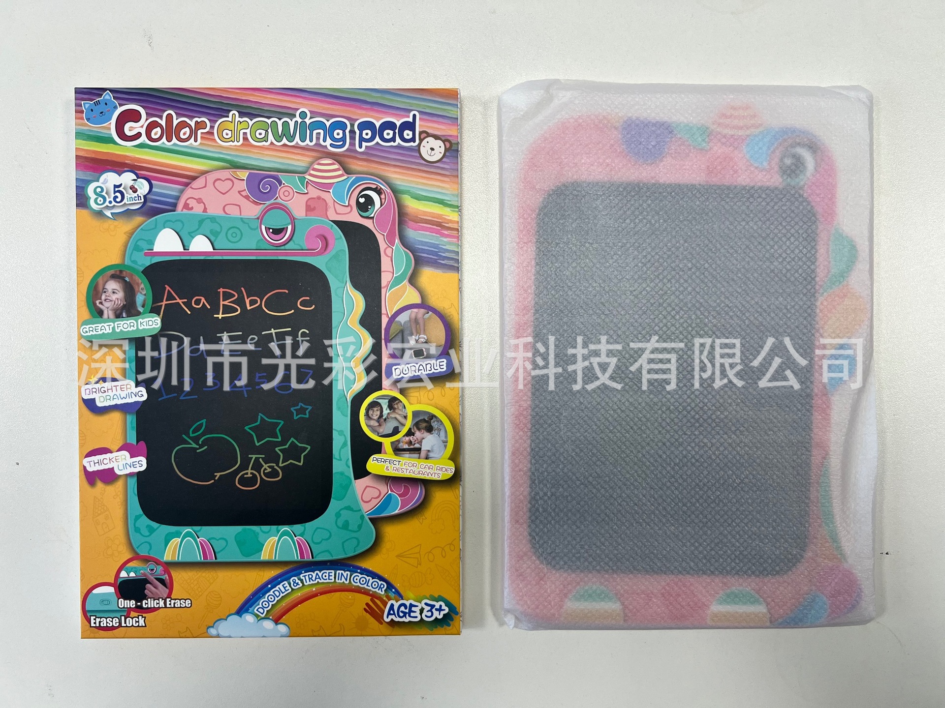 深圳市光彩宏业科技有限公司是一家专业的数码音视频产品的生产商。近10年来主要研发生产儿童液晶手写板系列,为日、欧美线下商超,亚马逊TOP卖家提供定制产品。公司成立于2009年,注册资金100万元,生产面积一千多平米。拥有国家高新技术企业证书,通过ISO、SEDEX,国内京东自营,名创优品等专业审厂认证。是一家集研发、生产、销售于一体的生产性企业,月生产能力达30万台。