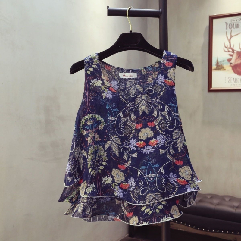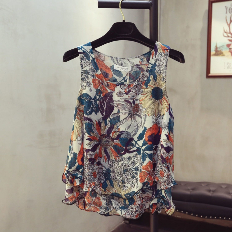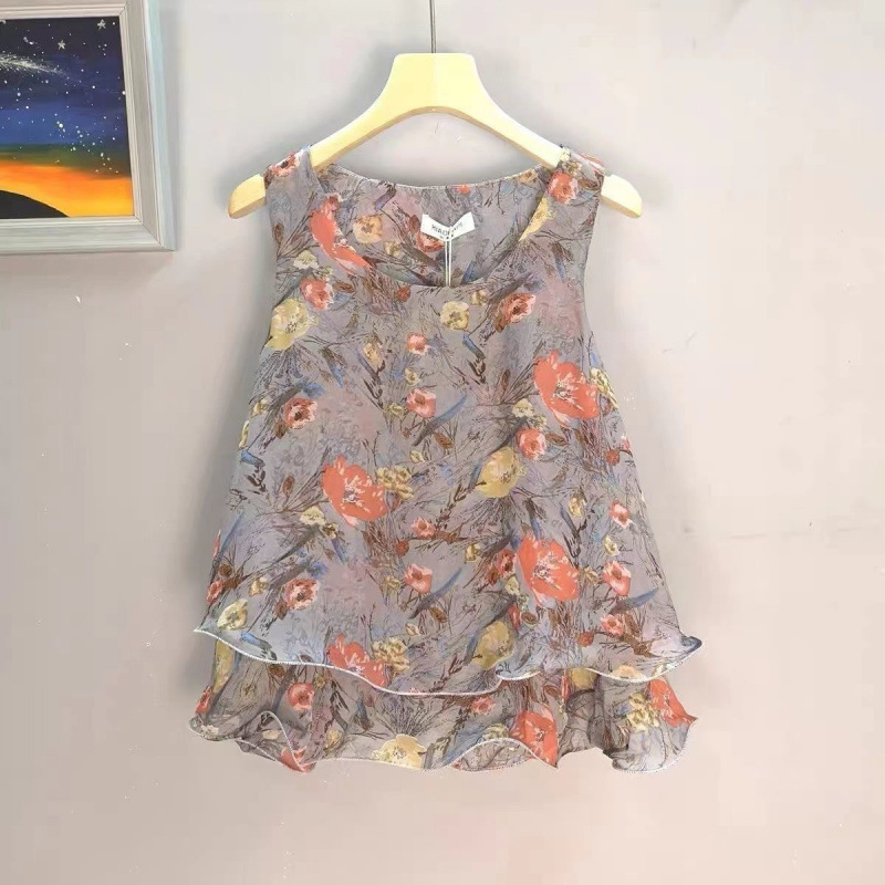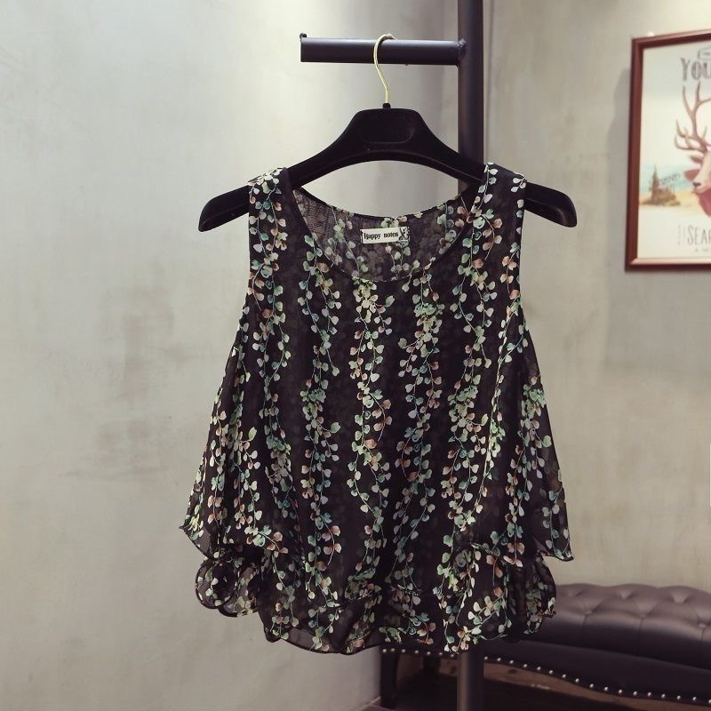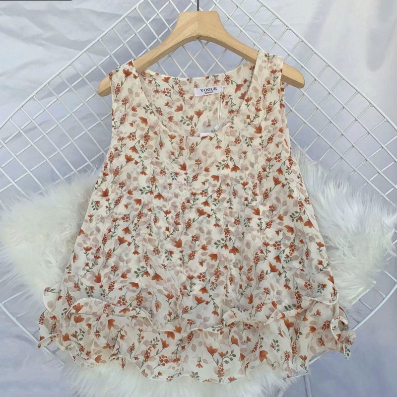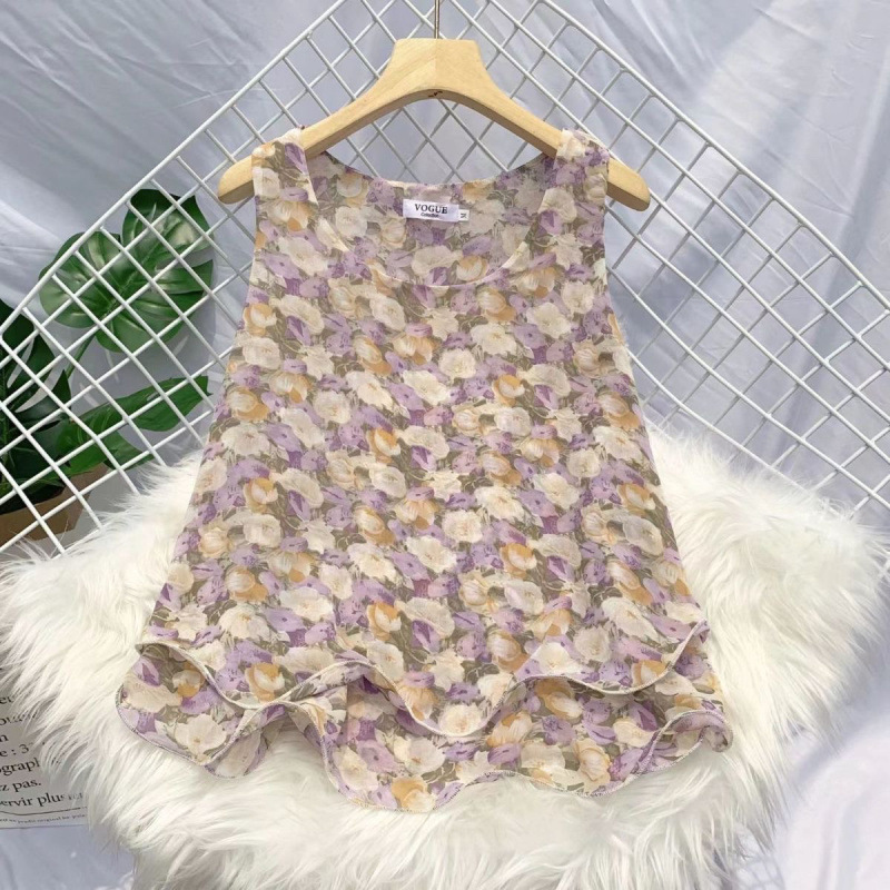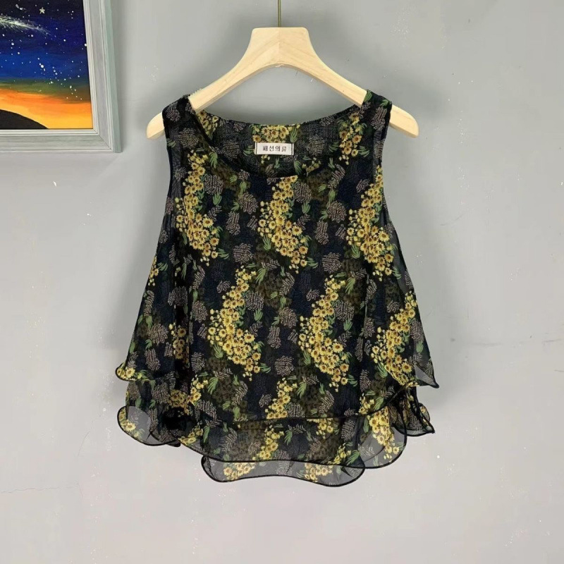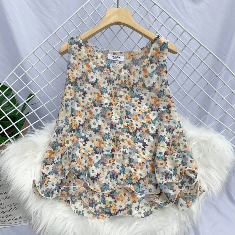 탱크탑 2024 여름 신작 한국 스타일 작은 꽃무늬 민소매 쉬폰 셔츠 러플 짧은 바닥 탑 여성용