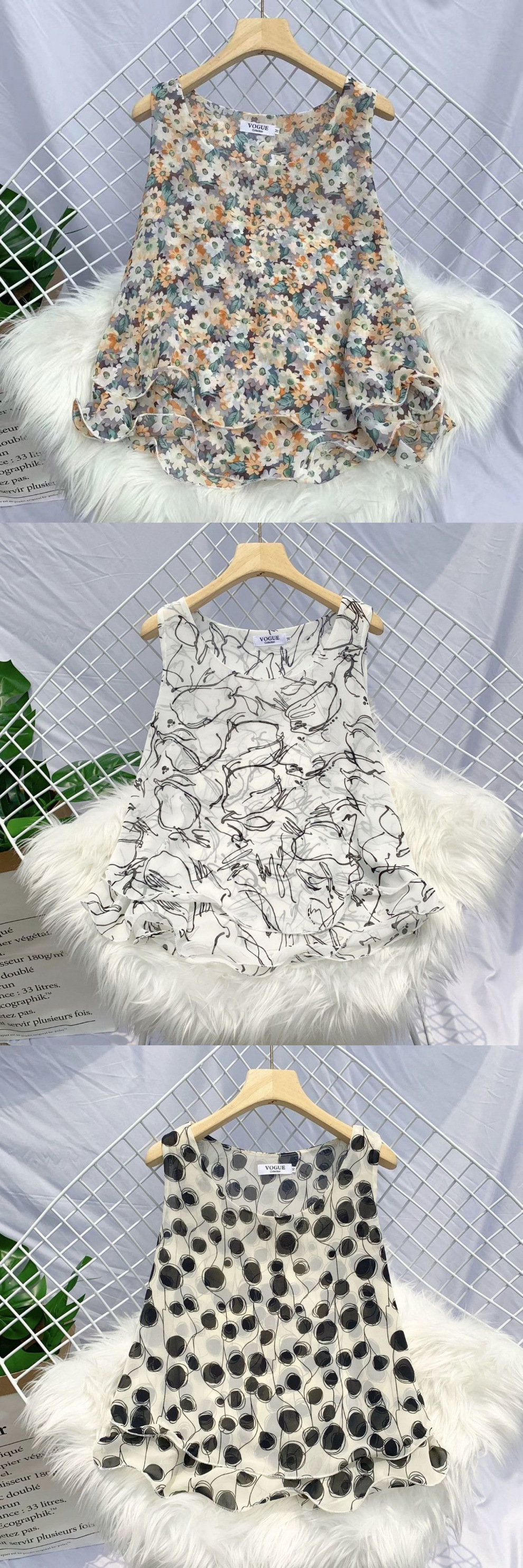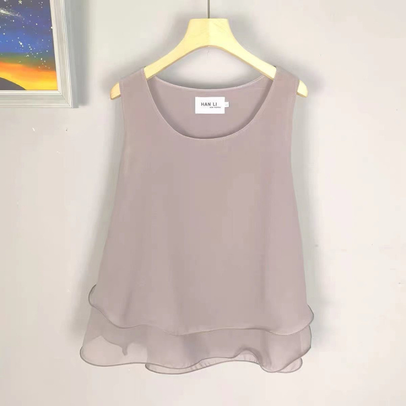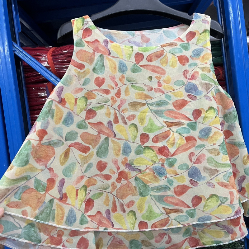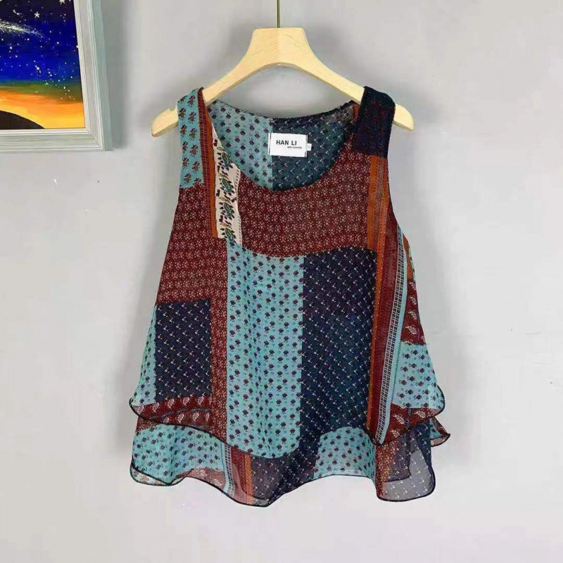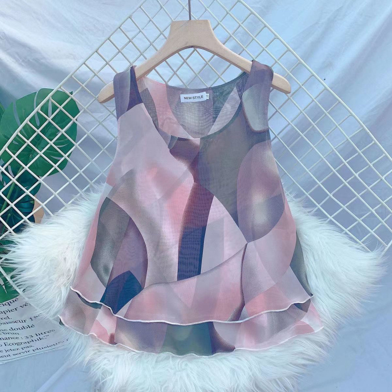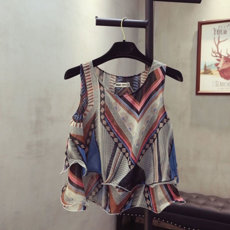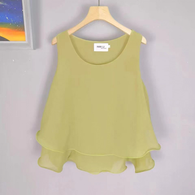 탱크탑 2024 여름 신작 한국 스타일 작은 꽃무늬 민소매 쉬폰 셔츠 러플 짧은 바닥 탑 여성용