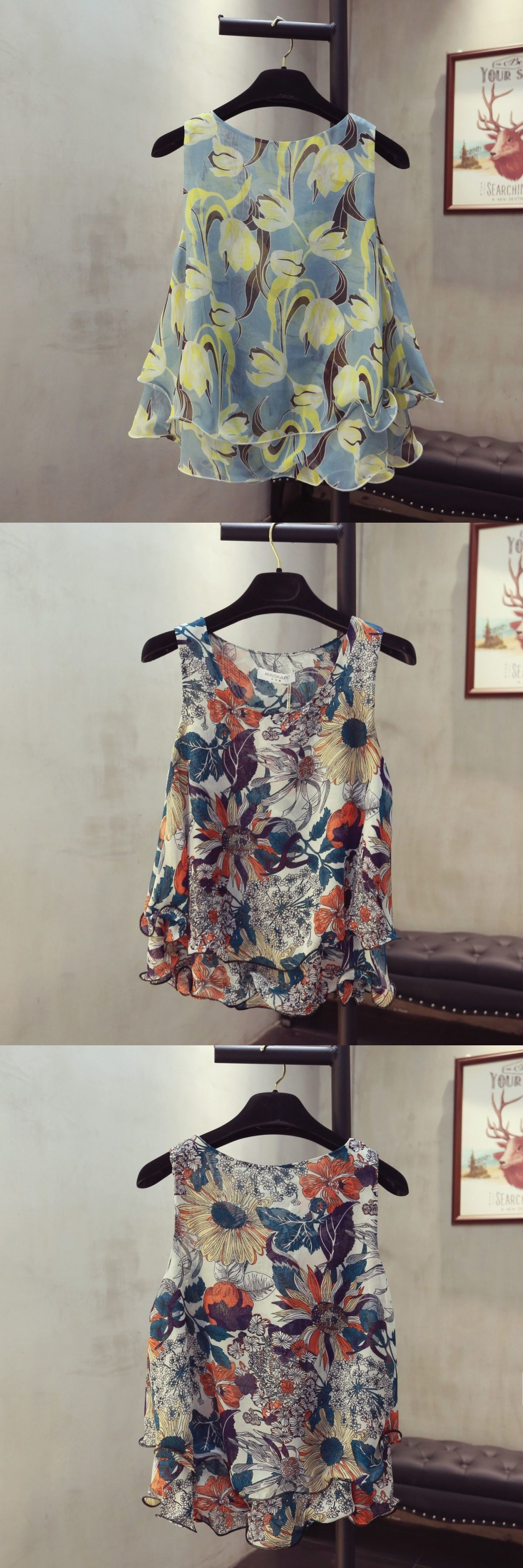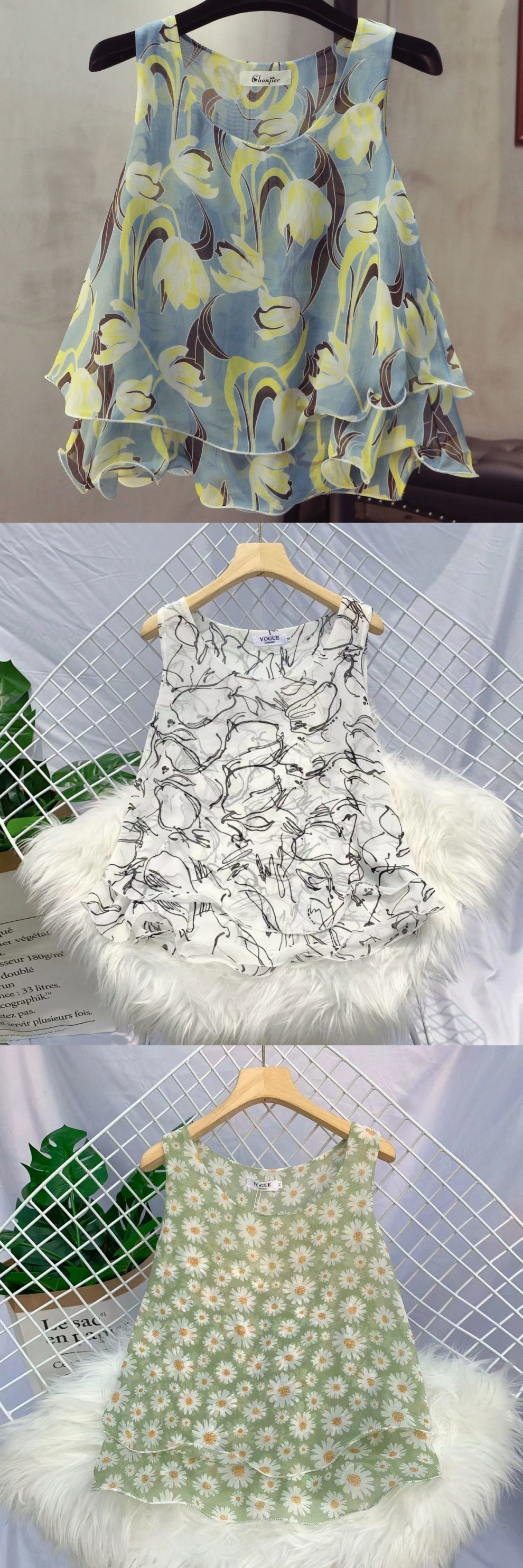 탱크탑 2024 여름 신작 한국 스타일 작은 꽃무늬 민소매 쉬폰 셔츠 러플 짧은 바닥 탑 여성용스토어 가기