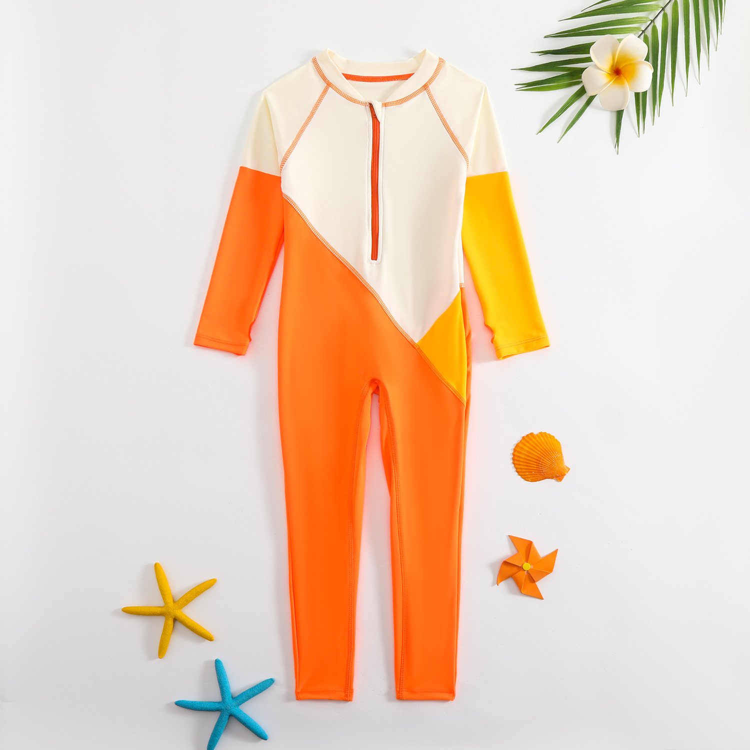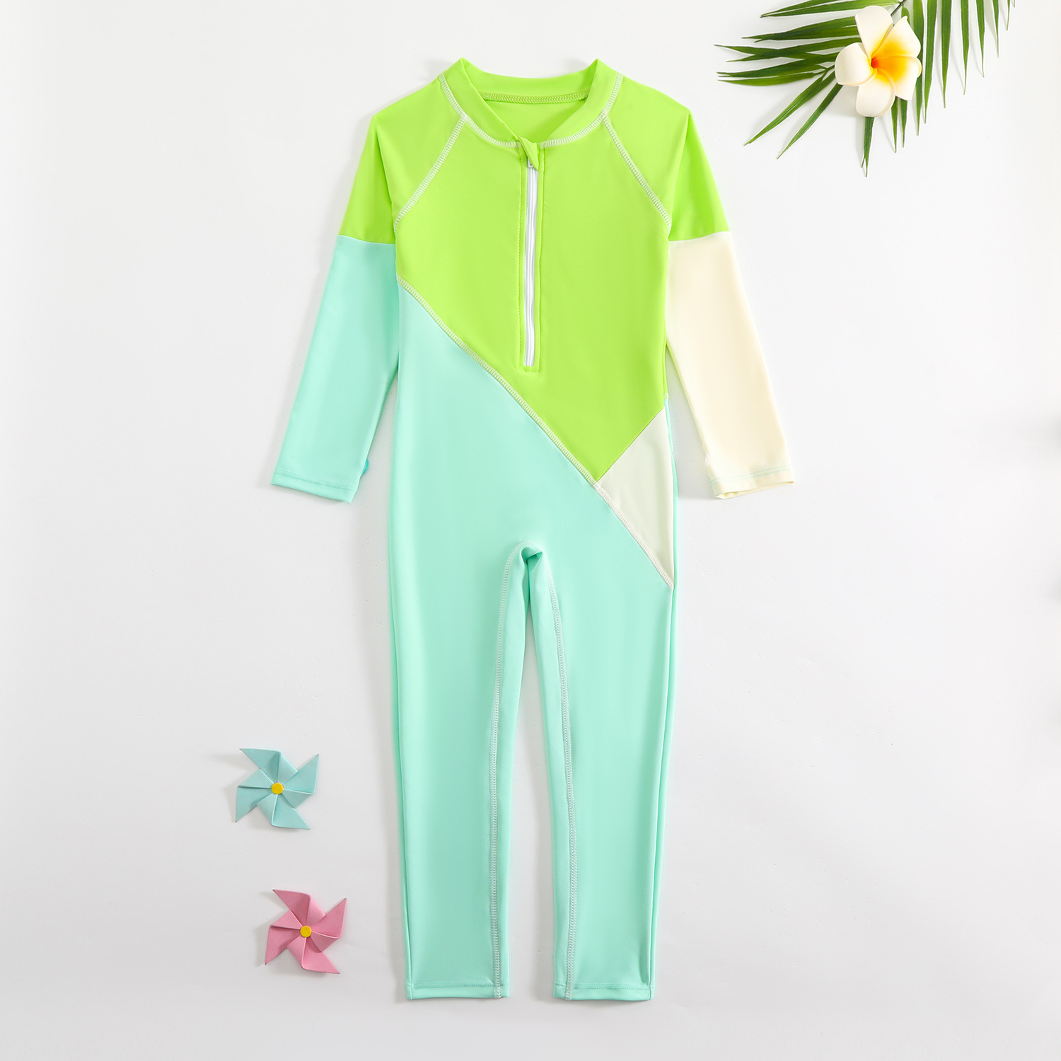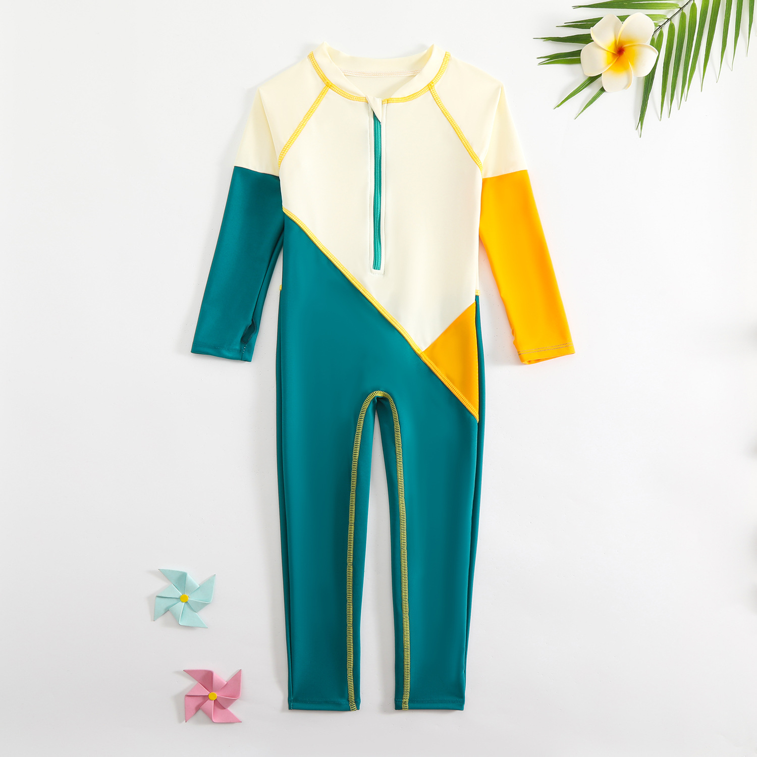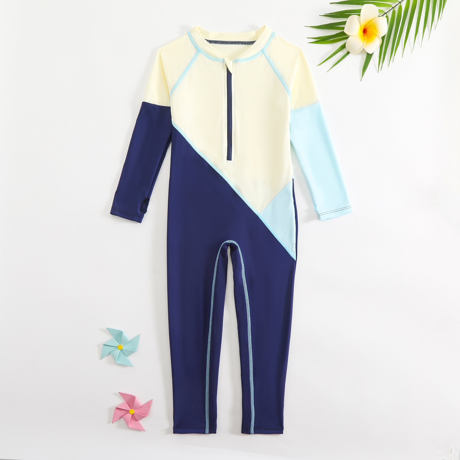 새로운 대비 색상 수영복 접합 디자인 소년 야외 태양 보호 원피스 수영복 속건성 긴팔 소년 수영복스토어 가기