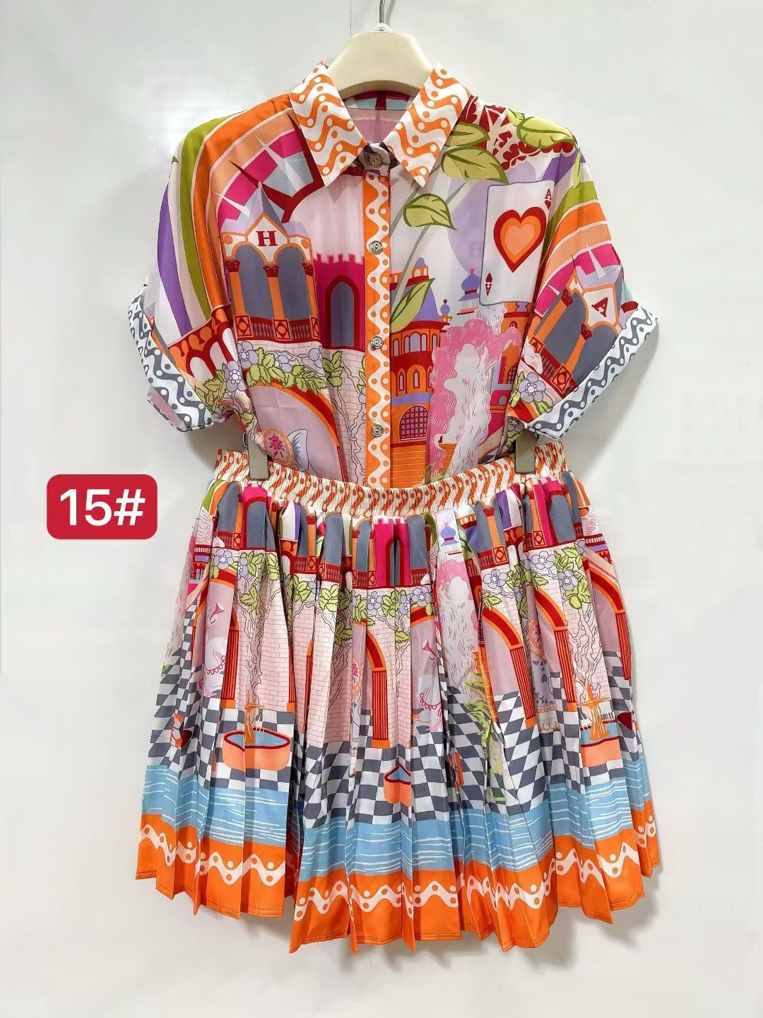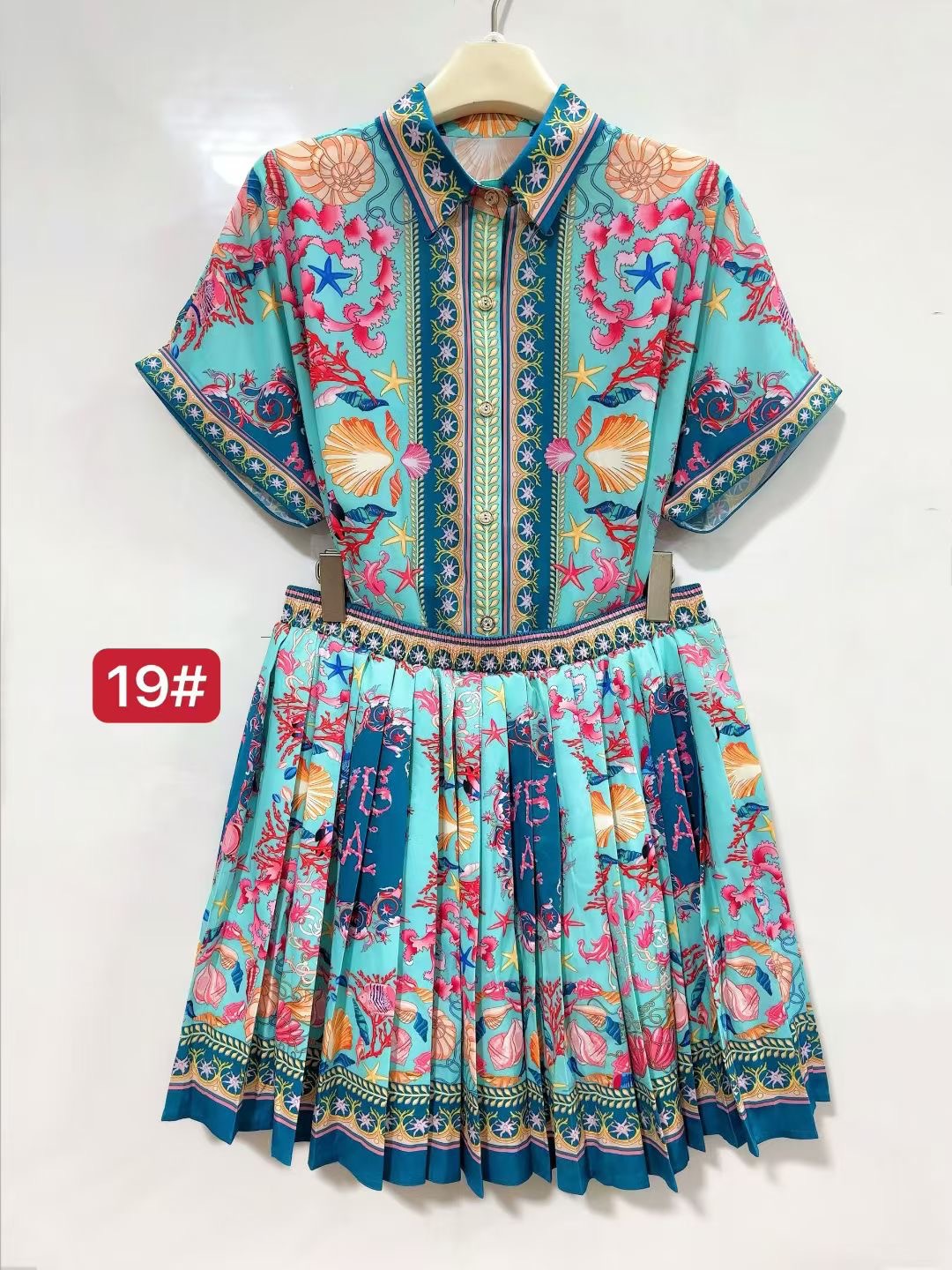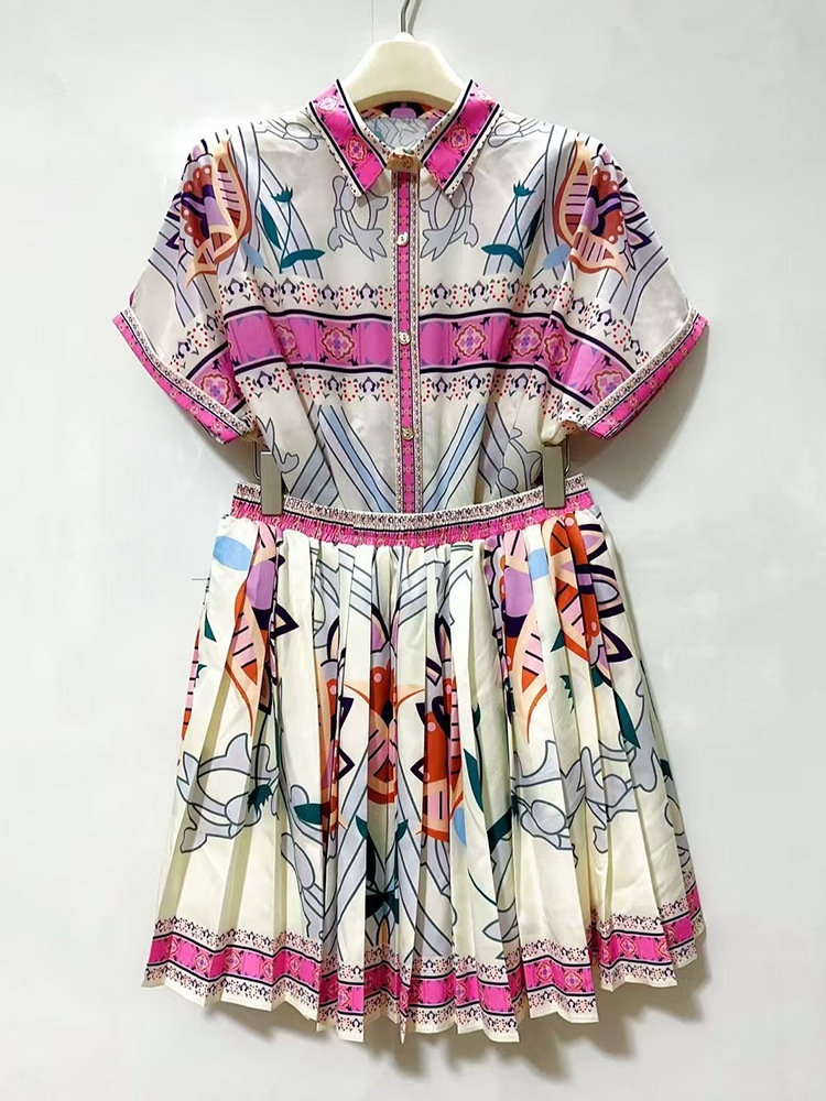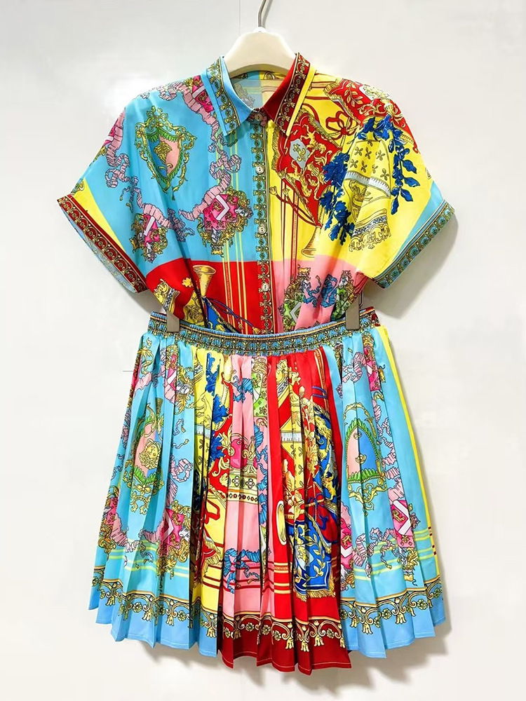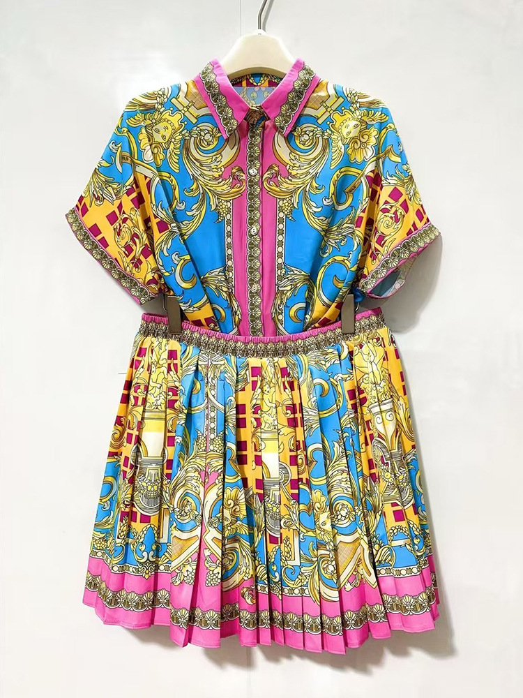 2026년 해외 무역 여성복 레트로 기하학적 프린트 반팔 셔츠 투피스 세트 + 루즈핏 짧은 치마 세트