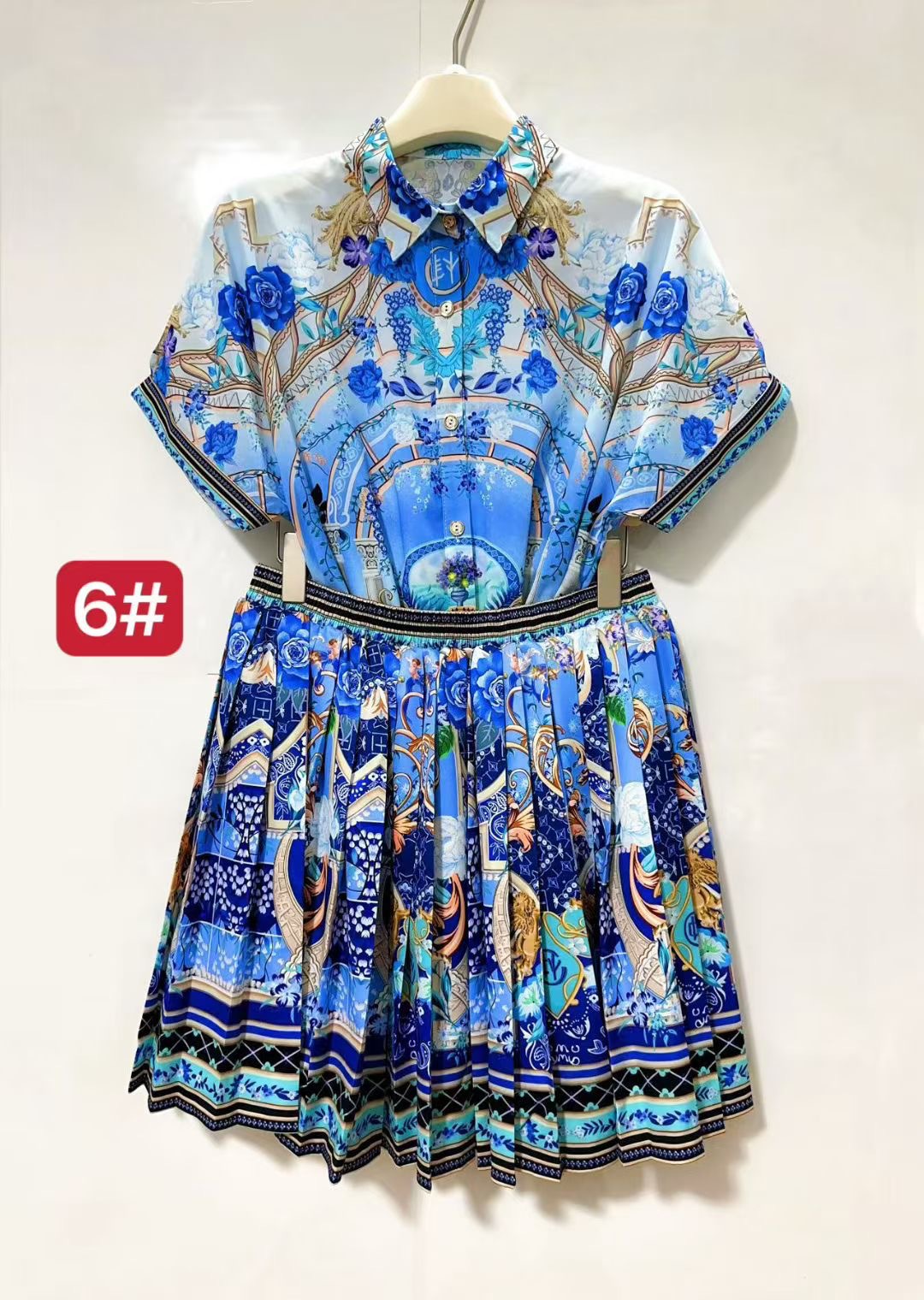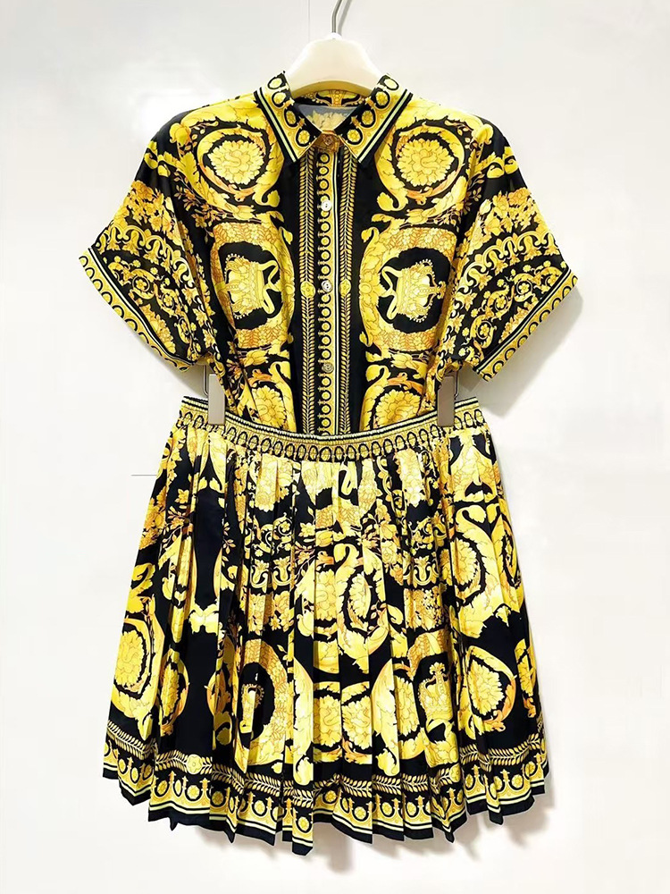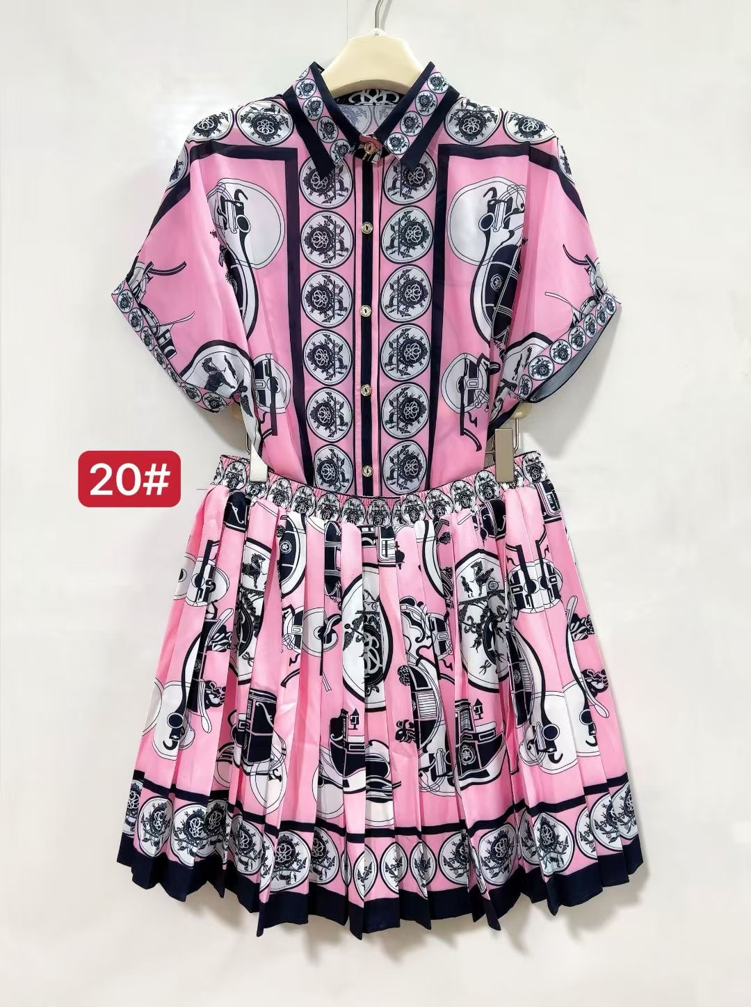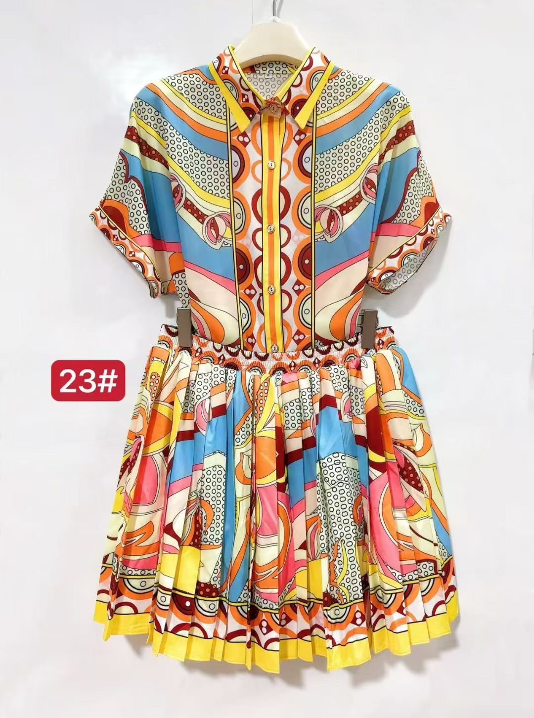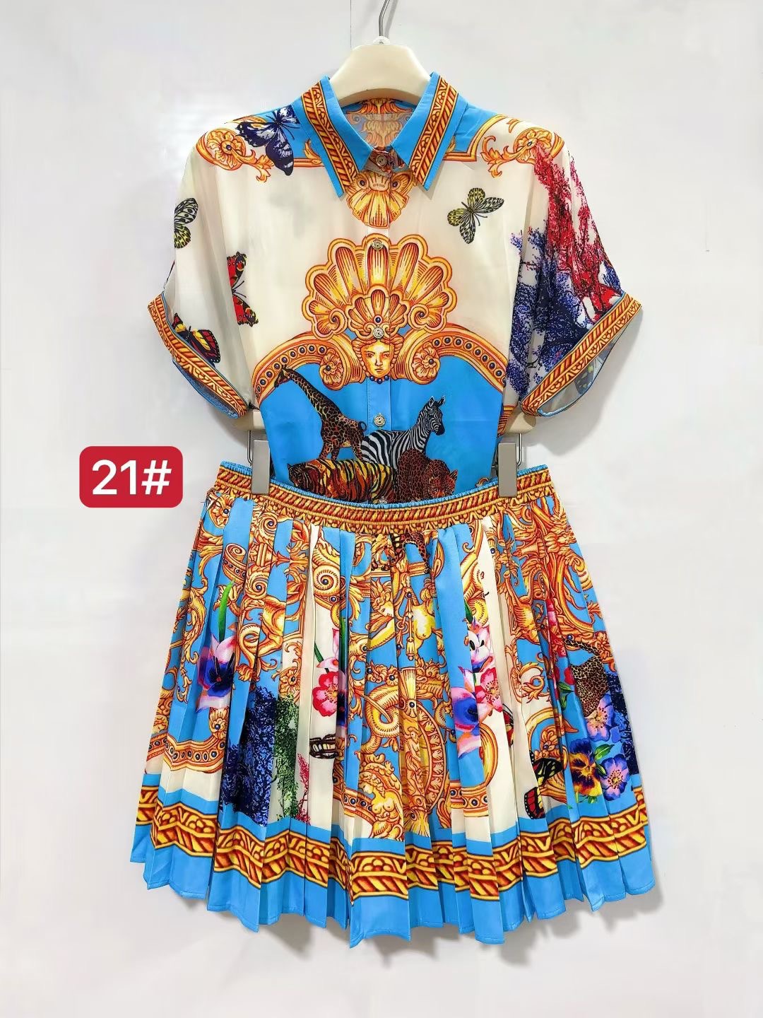 2026년 해외 무역 여성복 레트로 기하학적 프린트 반팔 셔츠 투피스 세트 + 루즈핏 짧은 치마 세트