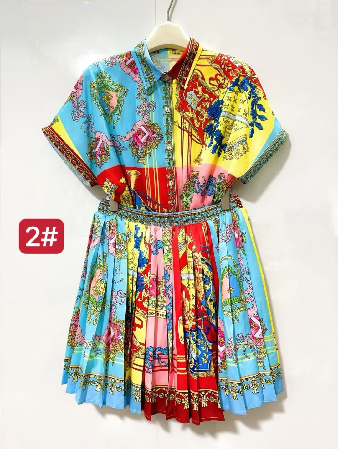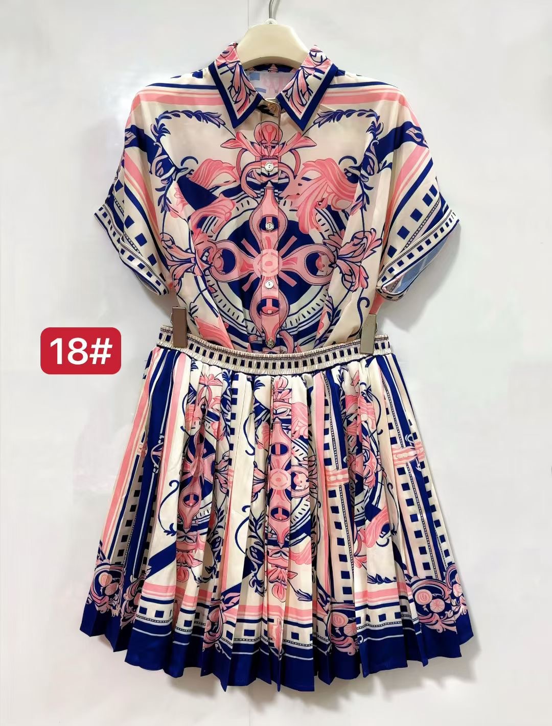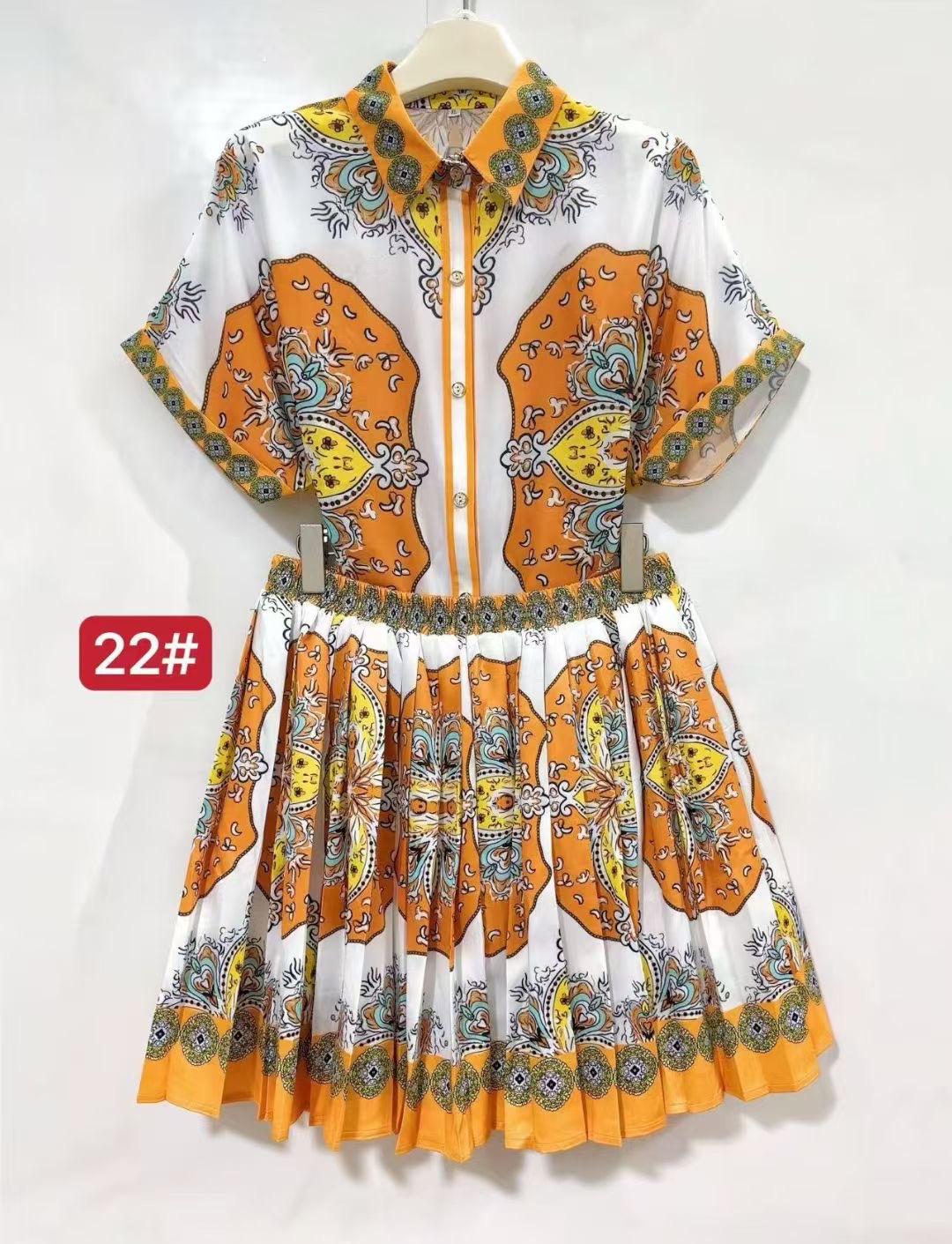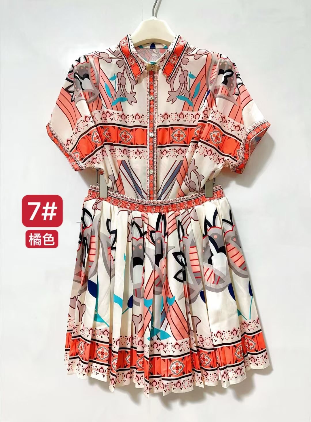2026년 해외 무역 여성복 레트로 기하학적 프린트 반팔 셔츠 투피스 세트 + 루즈핏 짧은 치마 세트