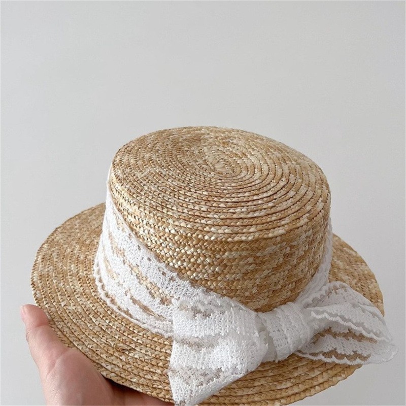 한펑 어린이 밀짚 모자 패션 레이스 활 플랫 탑 모자 여름 소녀 빅 림 햇살 비치 모자