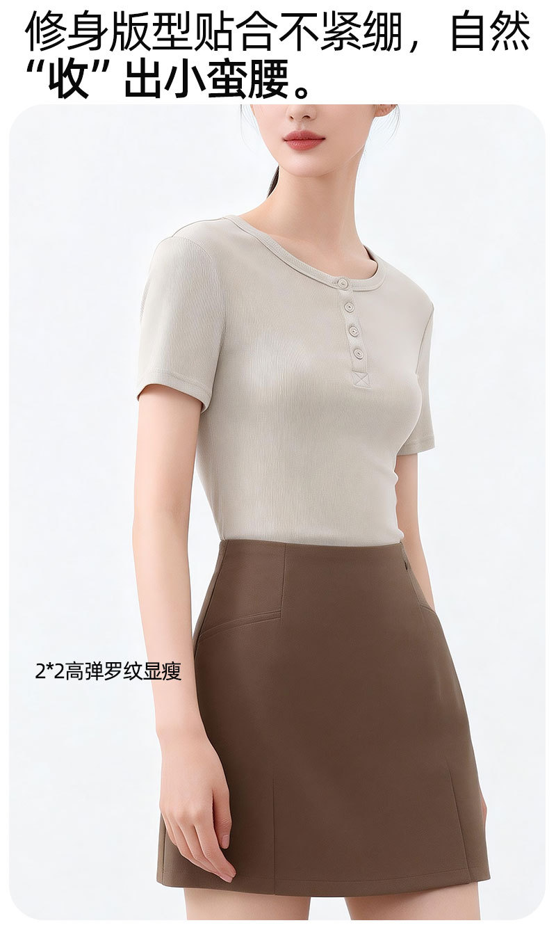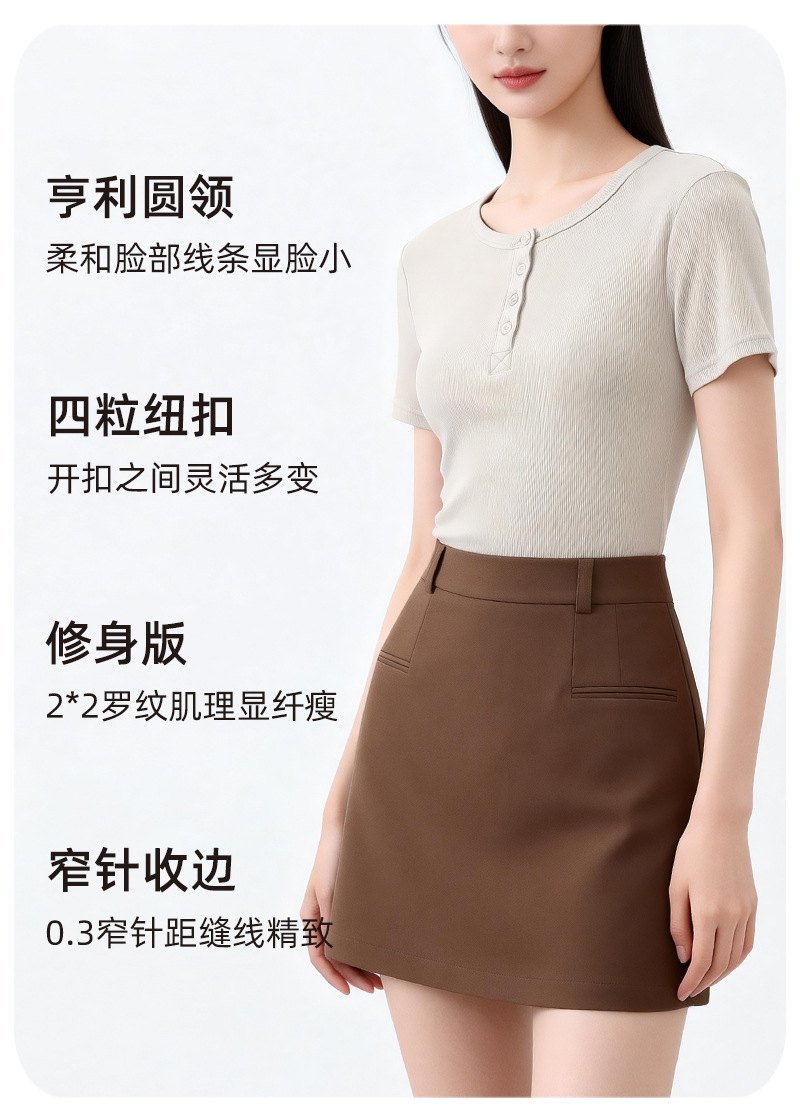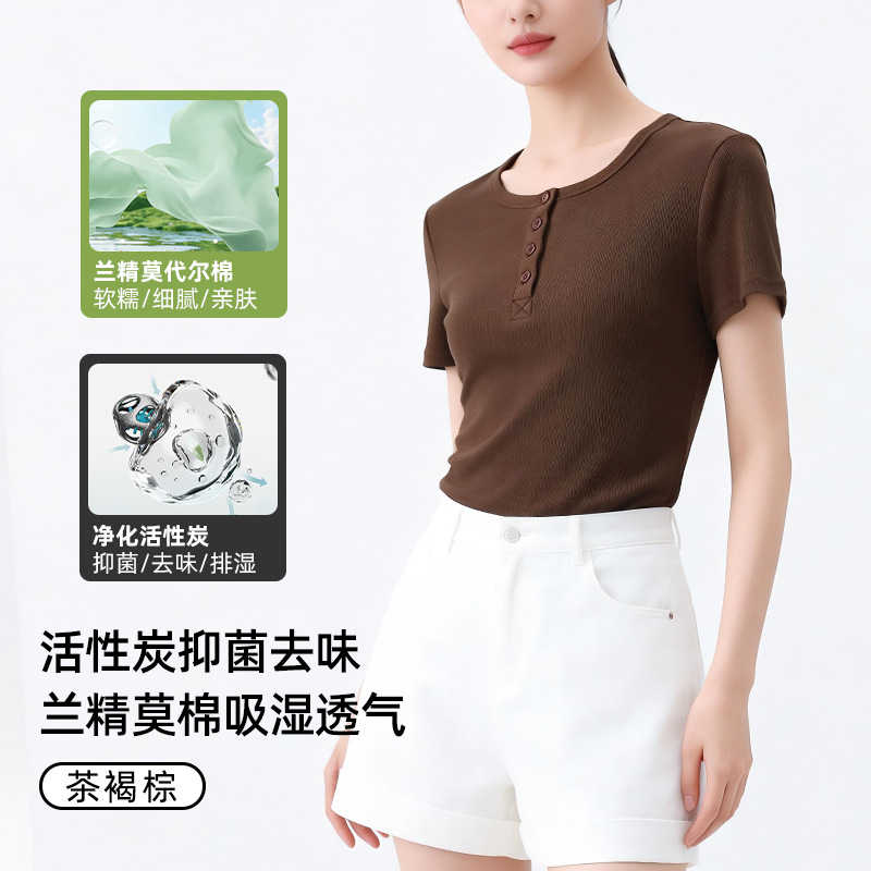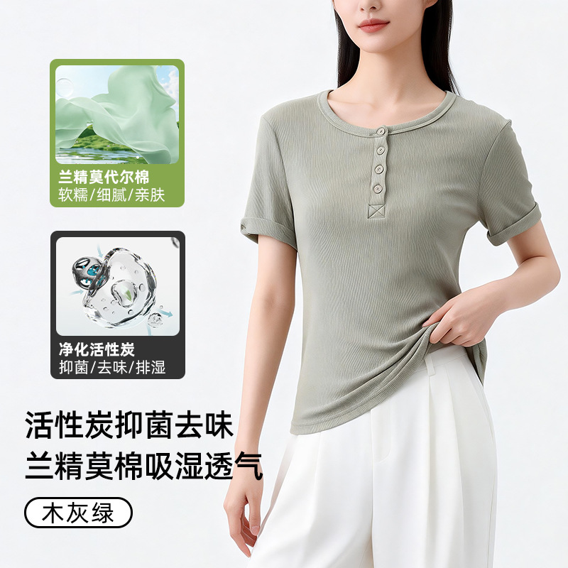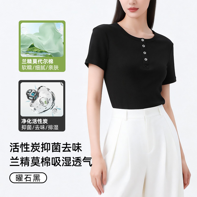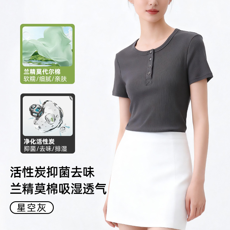 [란징 모달] 여성용 헨리넥 골지 버튼 티셔츠 한국 스타일 패션 슬림핏 핫걸 반팔탑