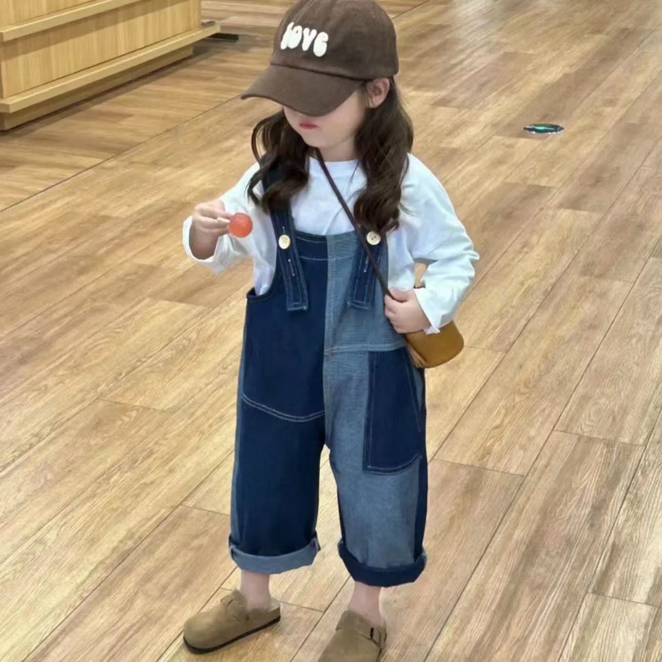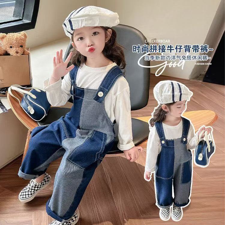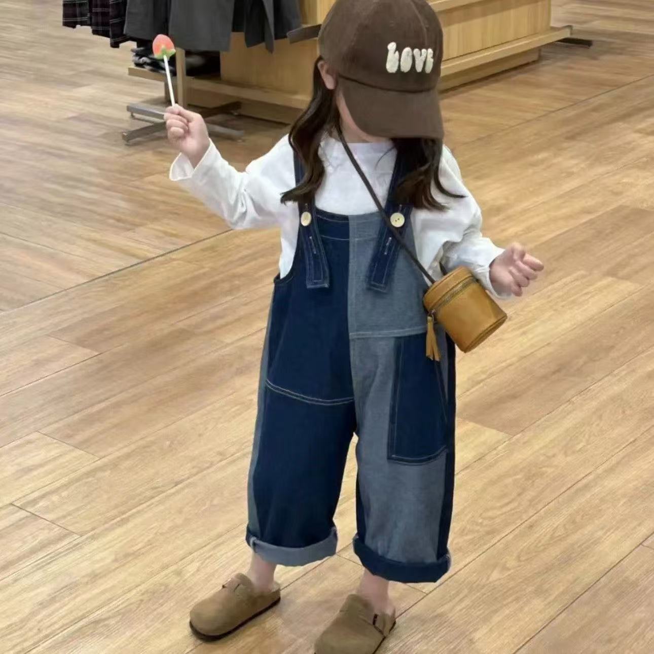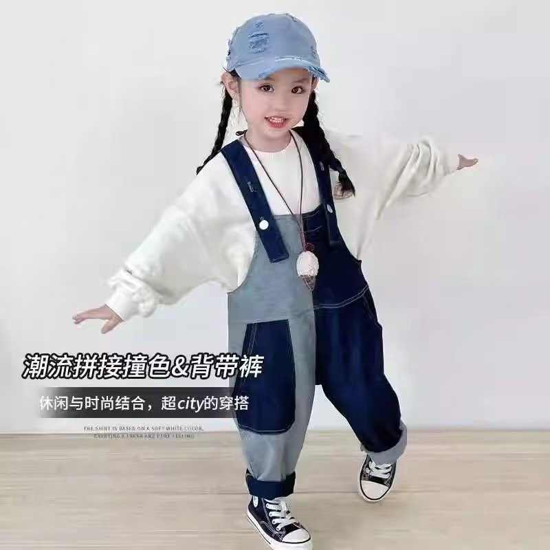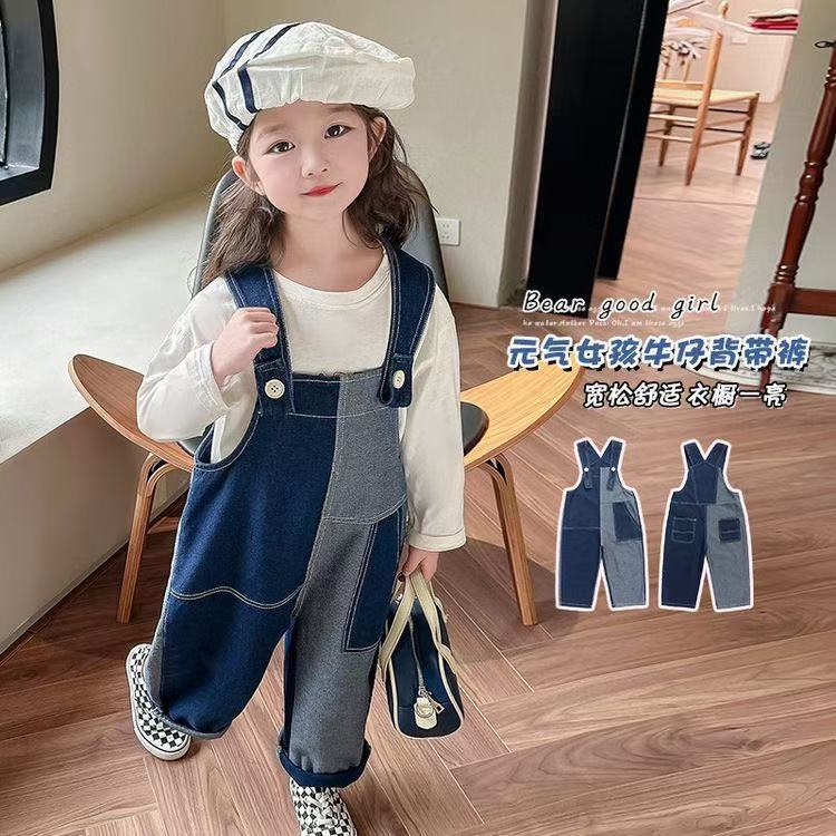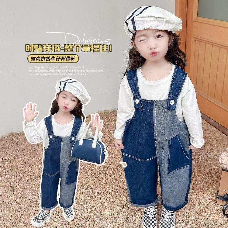 봄 가을 한국판 아동복 여아 가을 신상 작업복 스타일 부드러운 데님 긴바지 불규칙 배색 바지 중소형 아동용스토어 가기