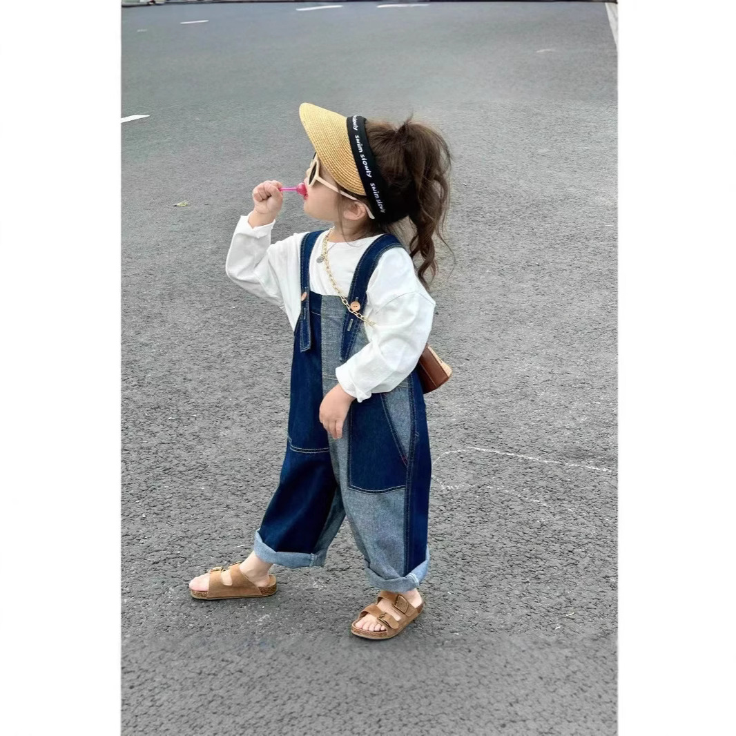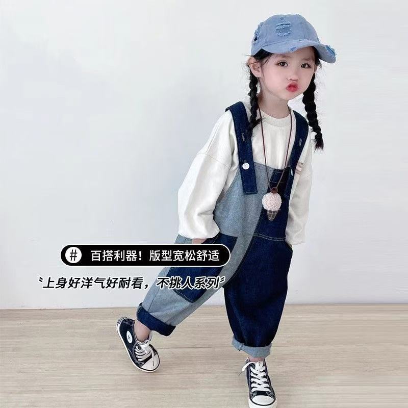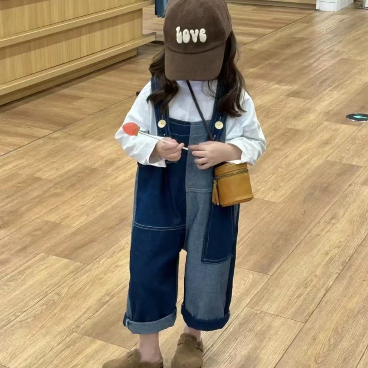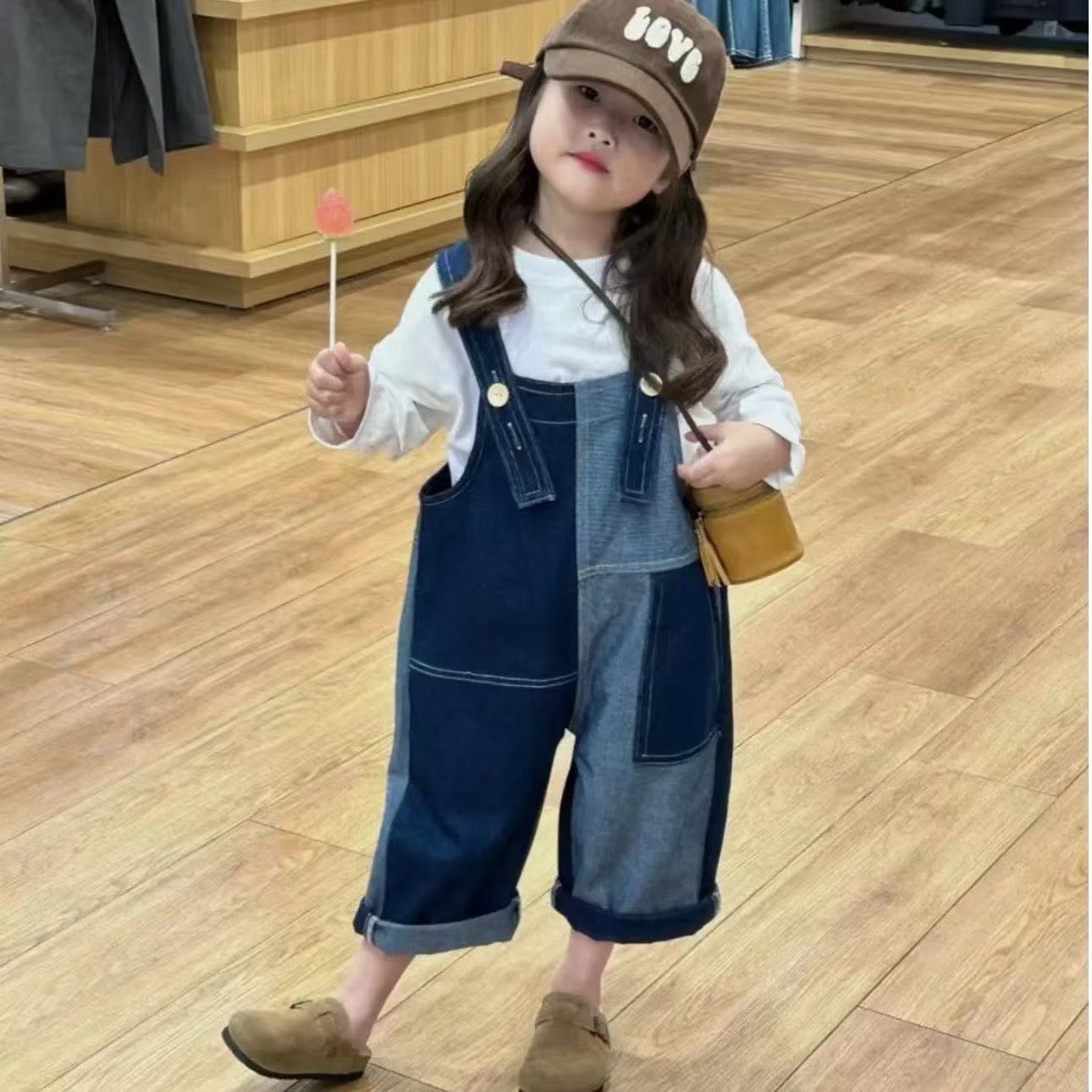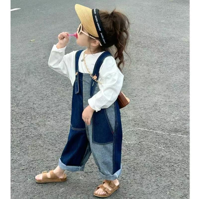 봄 가을 한국판 아동복 여아 가을 신상 작업복 스타일 부드러운 데님 긴바지 불규칙 배색 바지 중소형 아동용스토어 가기