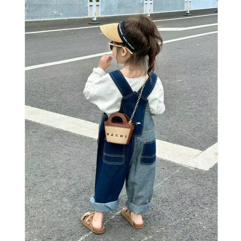 봄 가을 한국판 아동복 여아 가을 신상 작업복 스타일 부드러운 데님 긴바지 불규칙 배색 바지 중소형 아동용