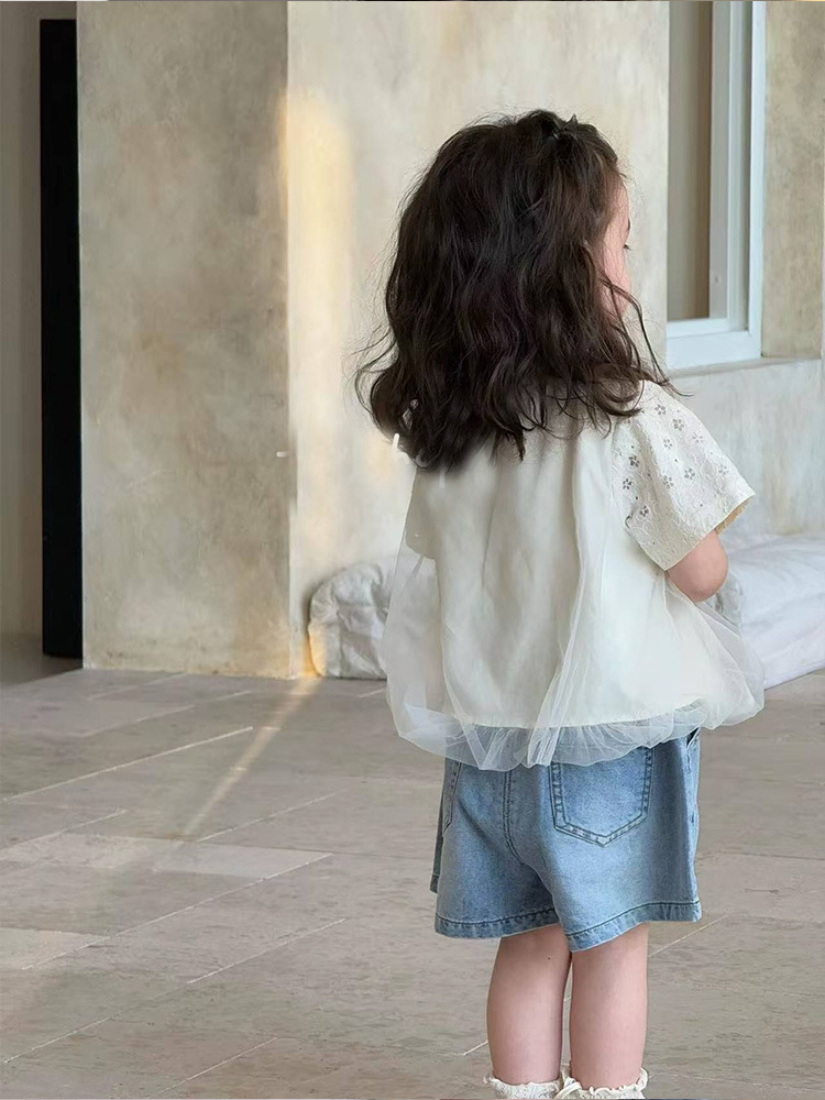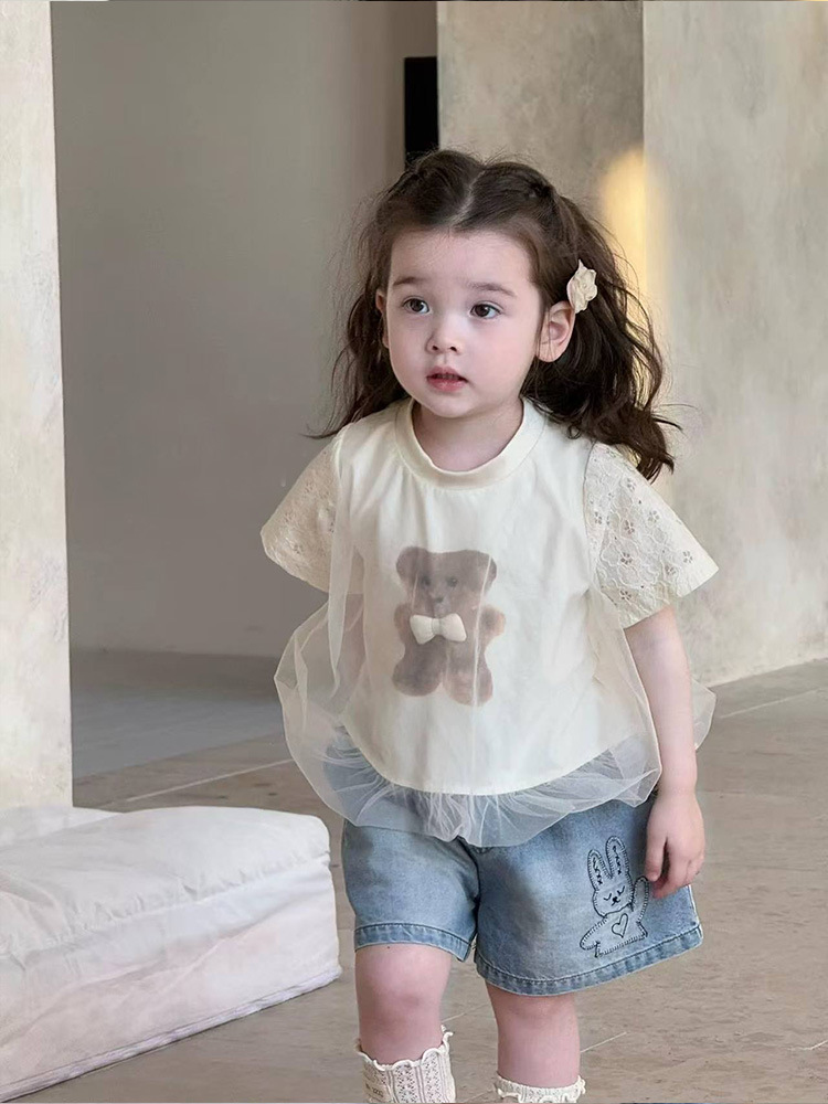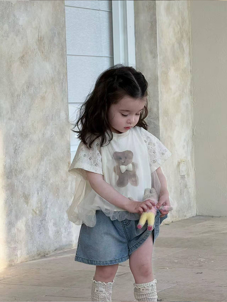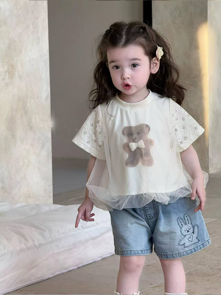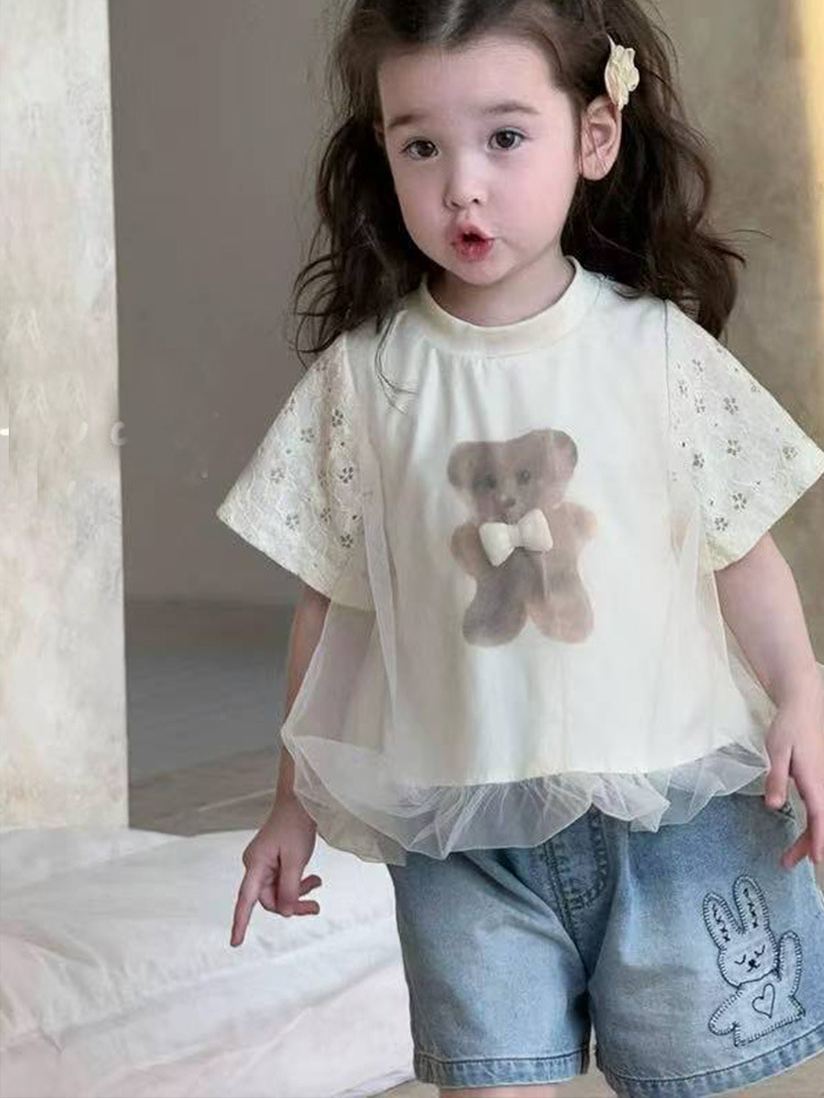2025 년 여름 새로운 어린이 귀여운 곰 인쇄 탑 아기 소녀의 반소매 베이스 셔츠 소녀의 반소매 티셔츠