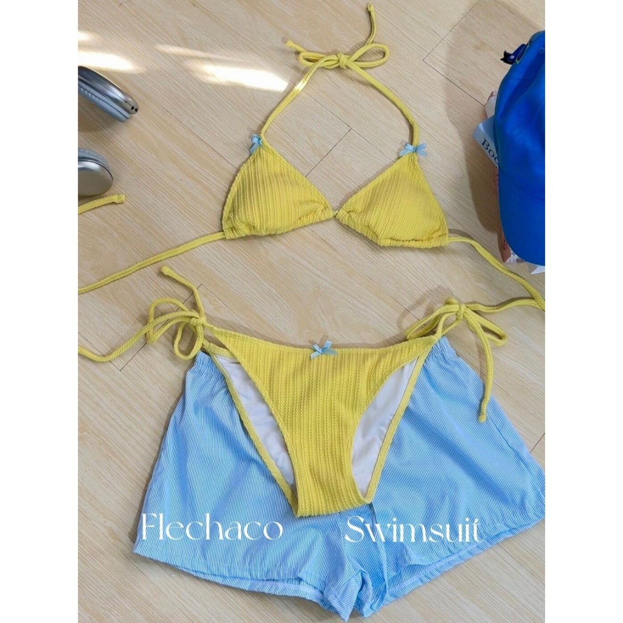 • 노란색 비키니 + 파란색 줄무늬 반바지