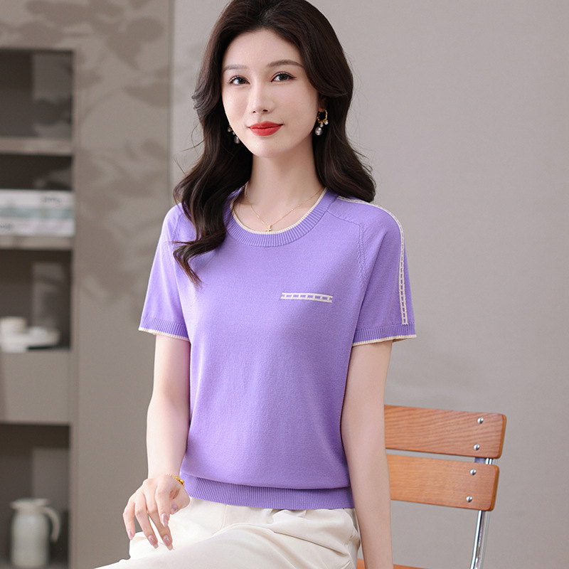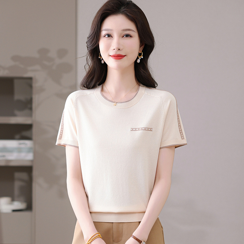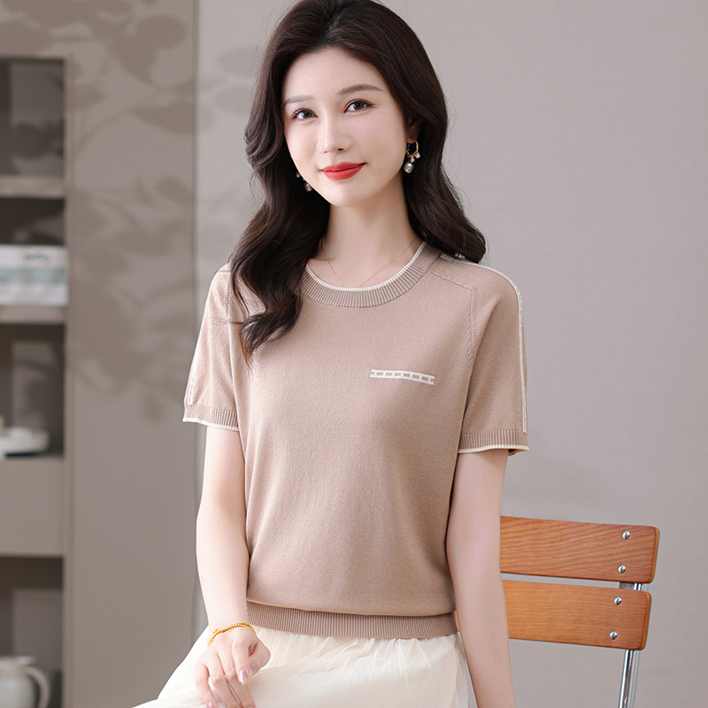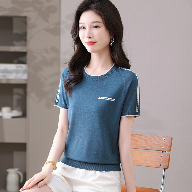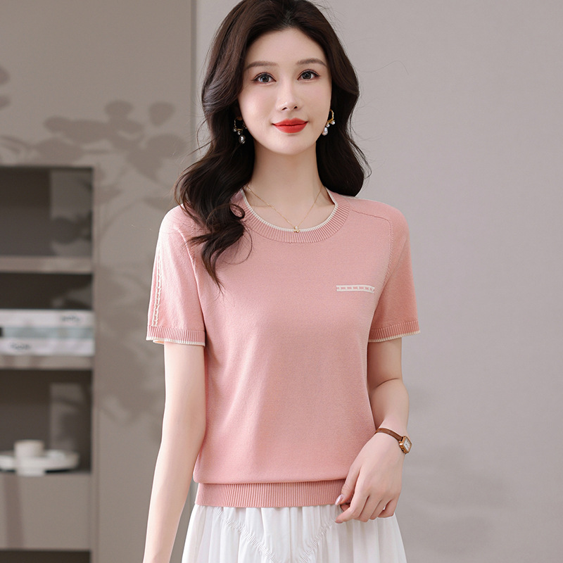 여름 아이스 실크 반팔 티셔츠 여성용 여름 얇은 니트 스웨터 반소매 라운드 넥 탑 서양식 슬리밍베이스 셔츠스토어 가기