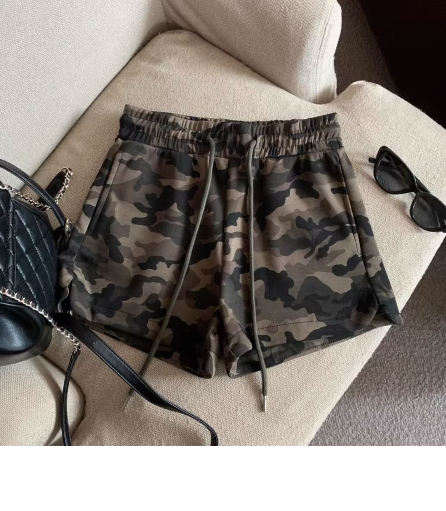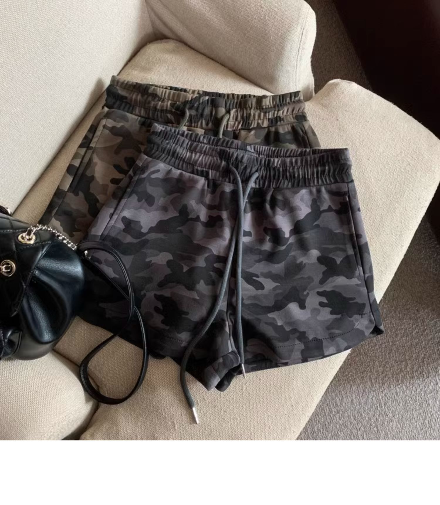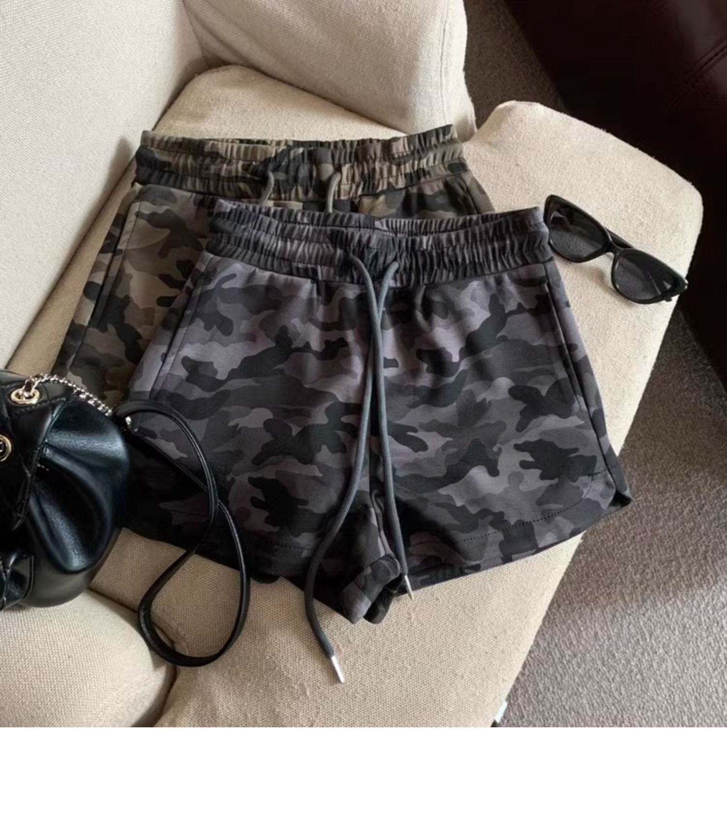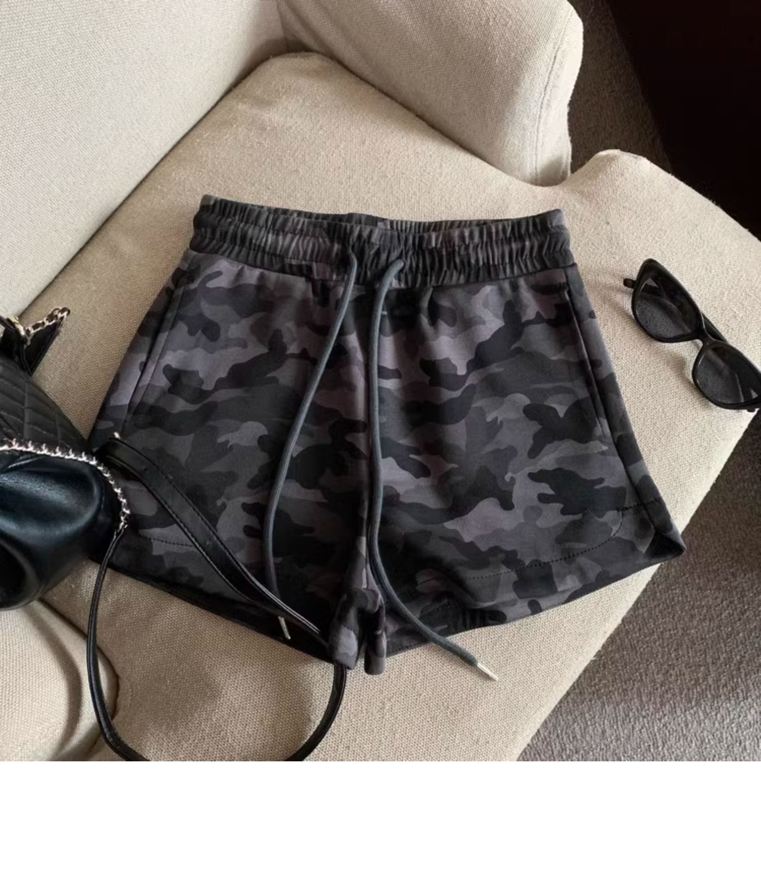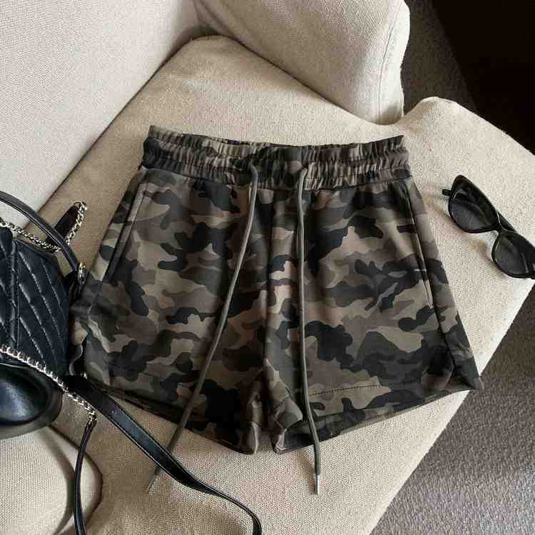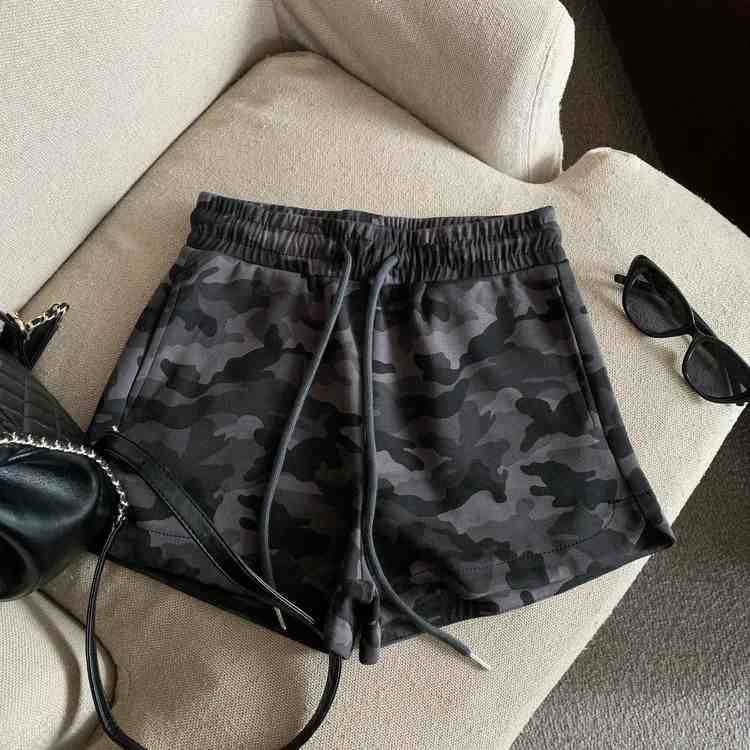 여름 여성을 위한 미국 복고풍 드로스트링 위장 캐주얼 반바지 새로운 디자인 틈새 루즈하고 다재다능한 와이드 레그 핫팬츠스토어 가기