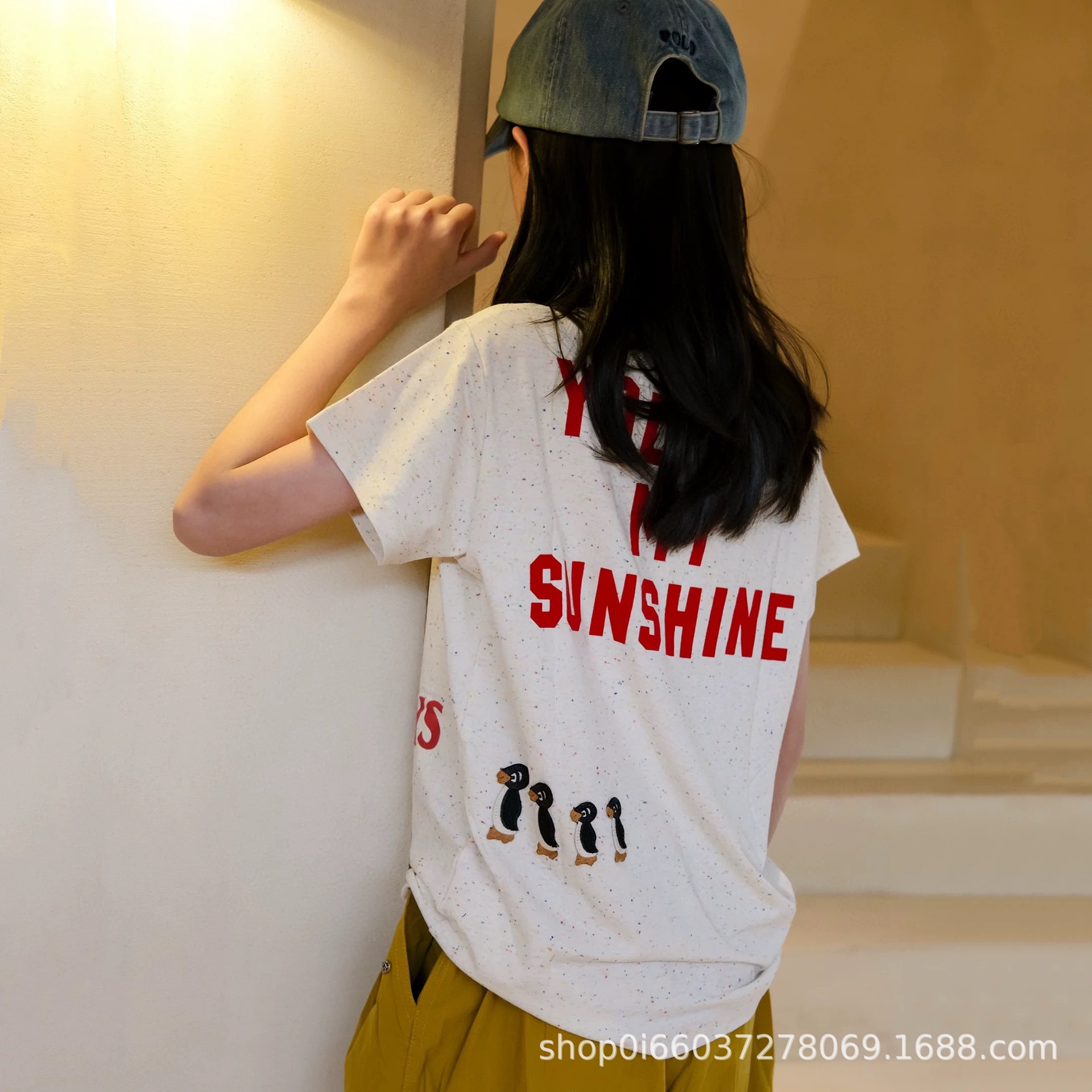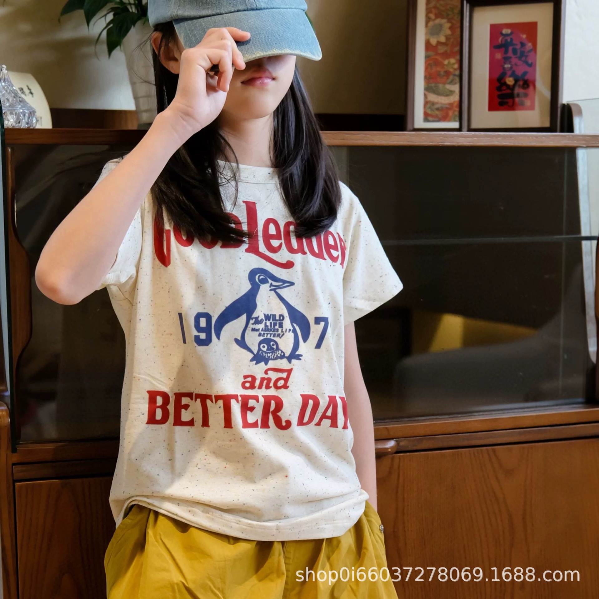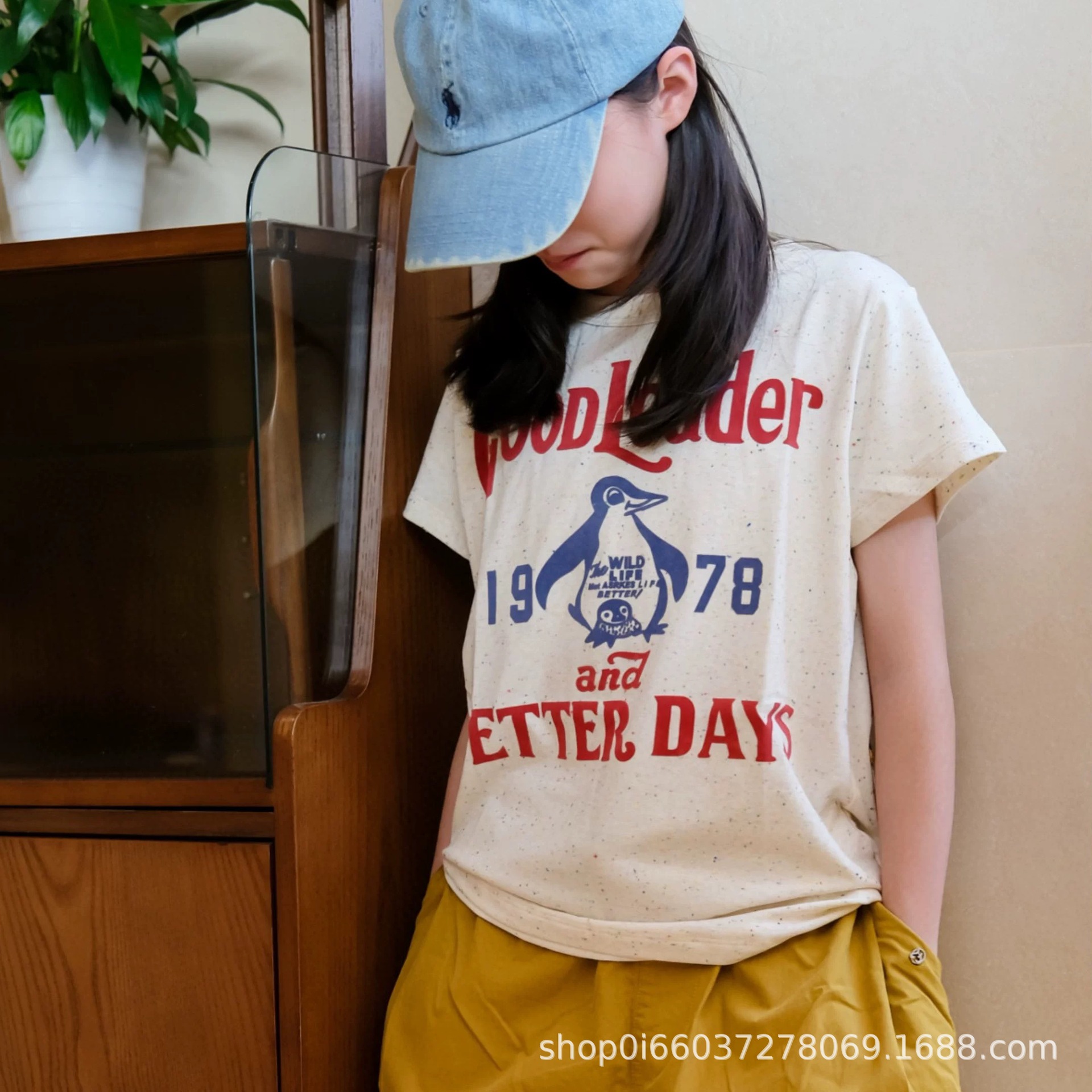 소년과 소녀 여름 반팔 티셔츠 DD 같은 스타일 일본 유행 브랜드 어린이 알파벳 플록 1978 펭귄 자수 티셔츠스토어 가기