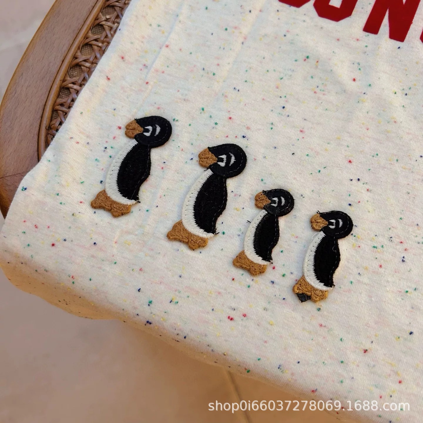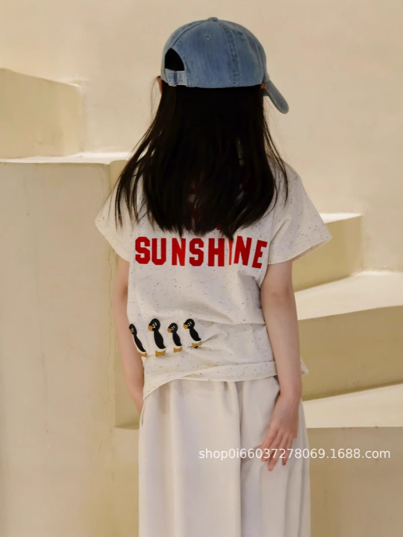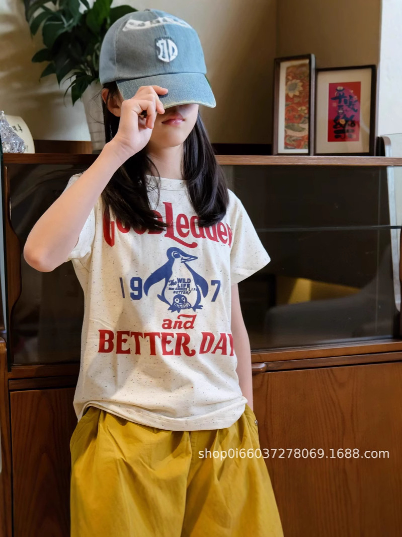 소년과 소녀 여름 반팔 티셔츠 DD 같은 스타일 일본 유행 브랜드 어린이 알파벳 플록 1978 펭귄 자수 티셔츠