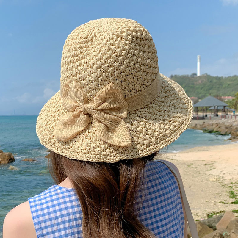 밀짚 모자 여성용 활 짠 해변 어부 모자 한국 스타일 유행 얼굴 덮은 태양 모자 인터넷 인기