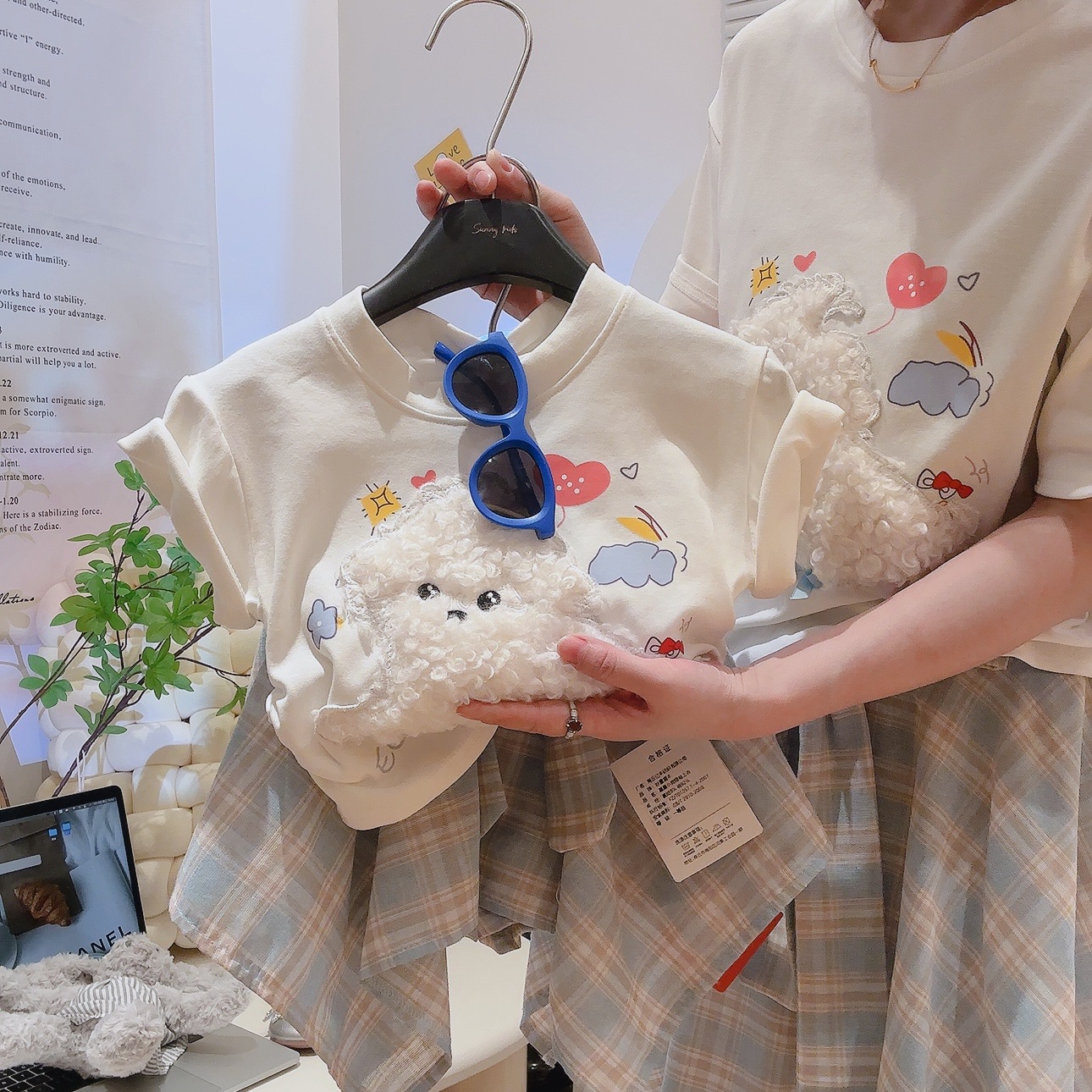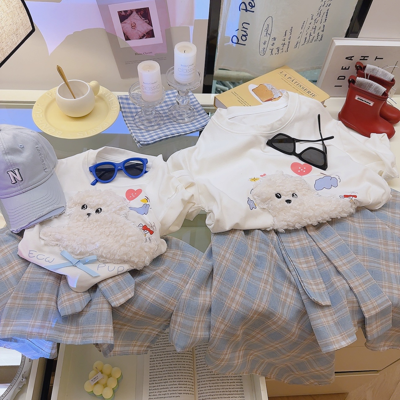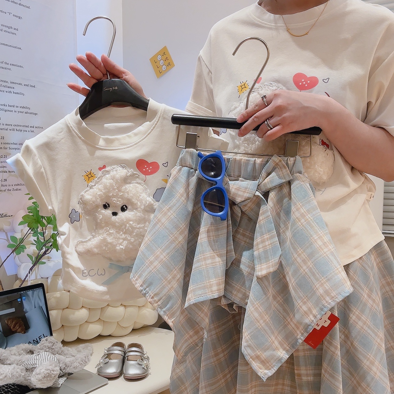 부모-자식 소녀 2025 여름 폭발 새로운 스타일 만화 짧은 소매 상단 체크 무늬 스커트 투피스 세트스토어 가기