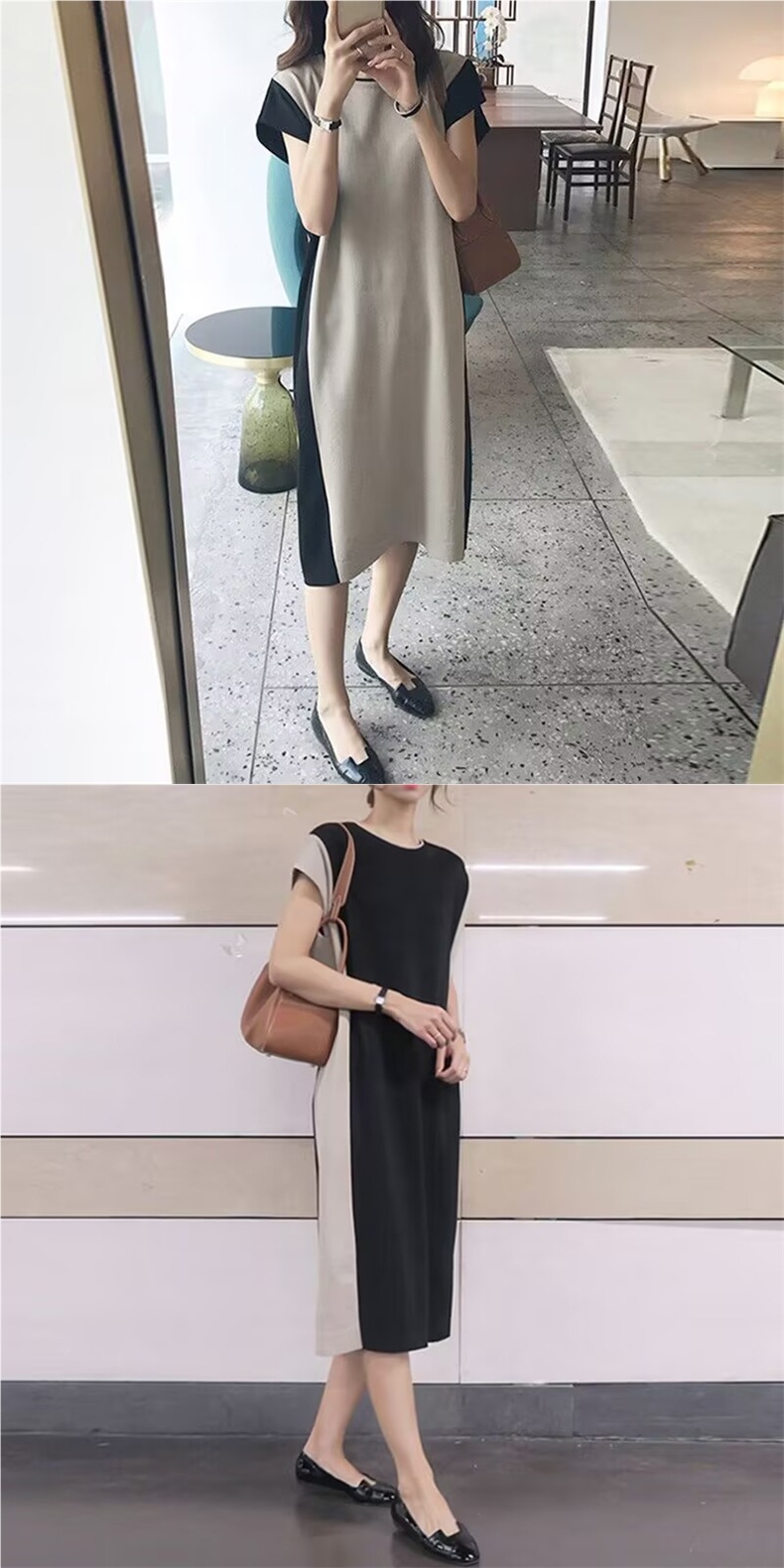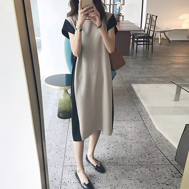 여성용 한국 스플리싱 드레스, 대비색 바닥, 여름 반팔 캐주얼 패션, 루즈한 프렌치 롱 스커트, 여성스러운 기질스토어 가기