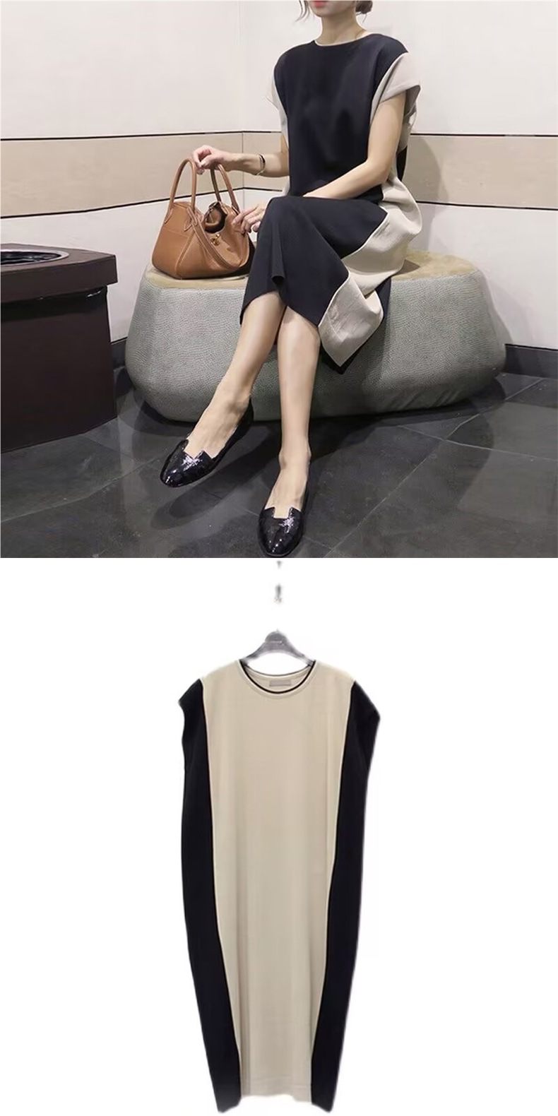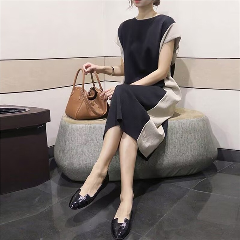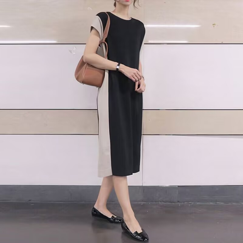 여성용 한국 스플리싱 드레스, 대비색 바닥, 여름 반팔 캐주얼 패션, 루즈한 프렌치 롱 스커트, 여성스러운 기질