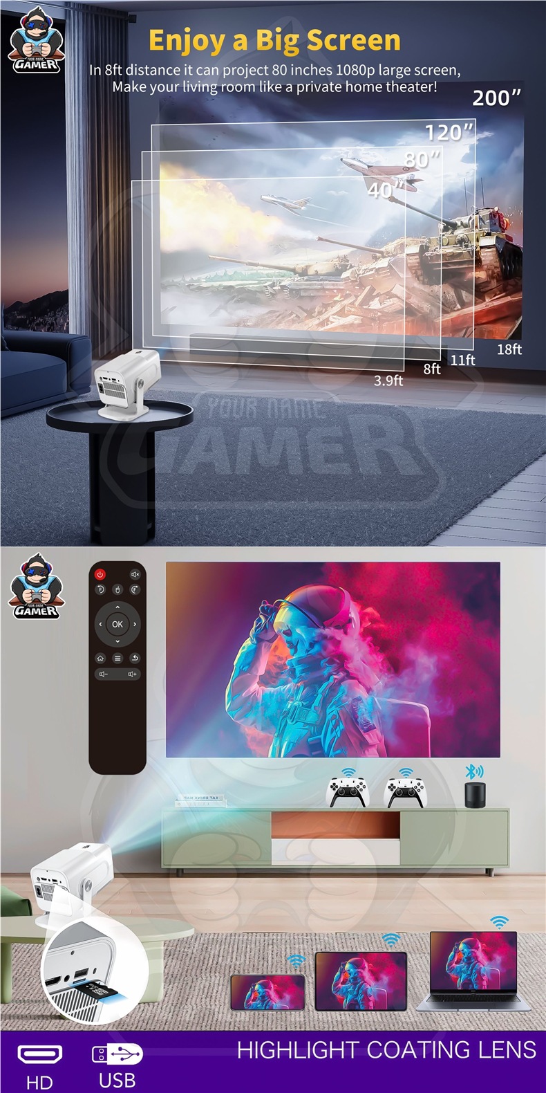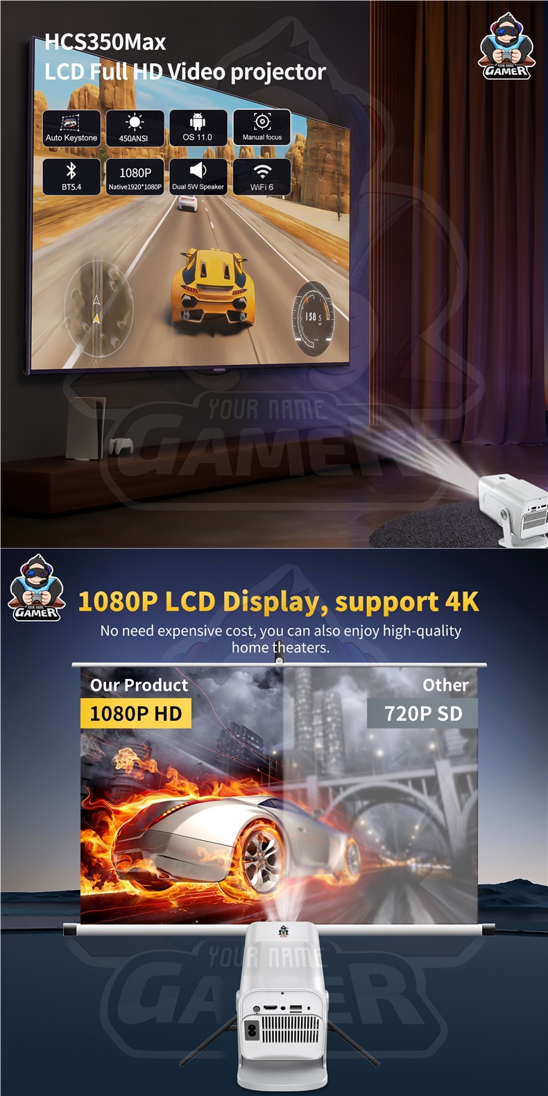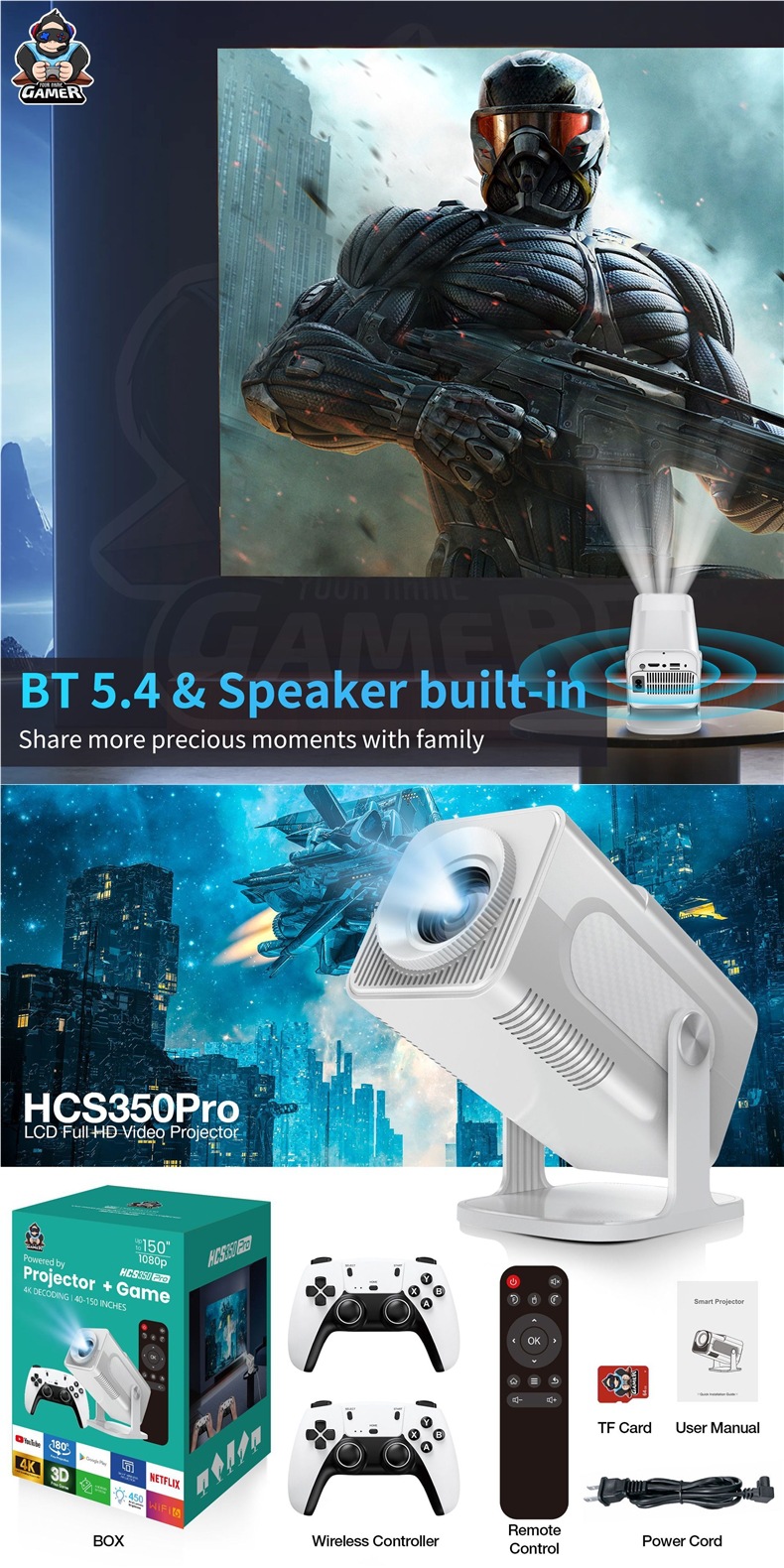 국경 간 HCS350PRO 안드로이드 게임 프로젝터 WiFi6G 게임 콘솔 아케이드 무선 고화질 홈 시어터