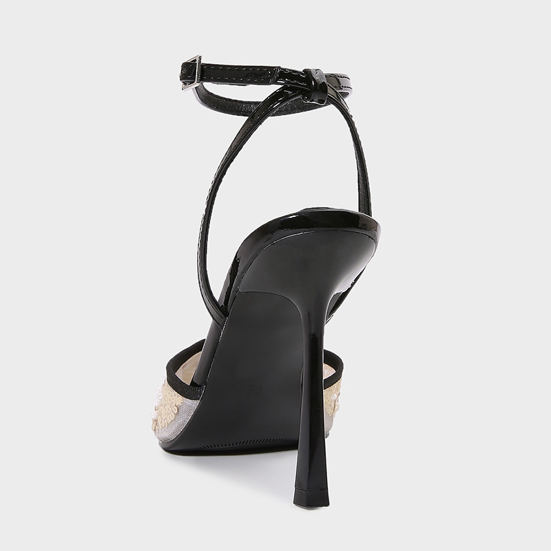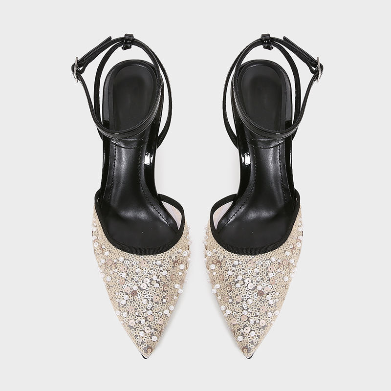ZA2025 여름 새로운 여성 신발 Lustre Mesh 뾰족한 하이힐 뮬러 신발 여성용 얇은 굽 샌들