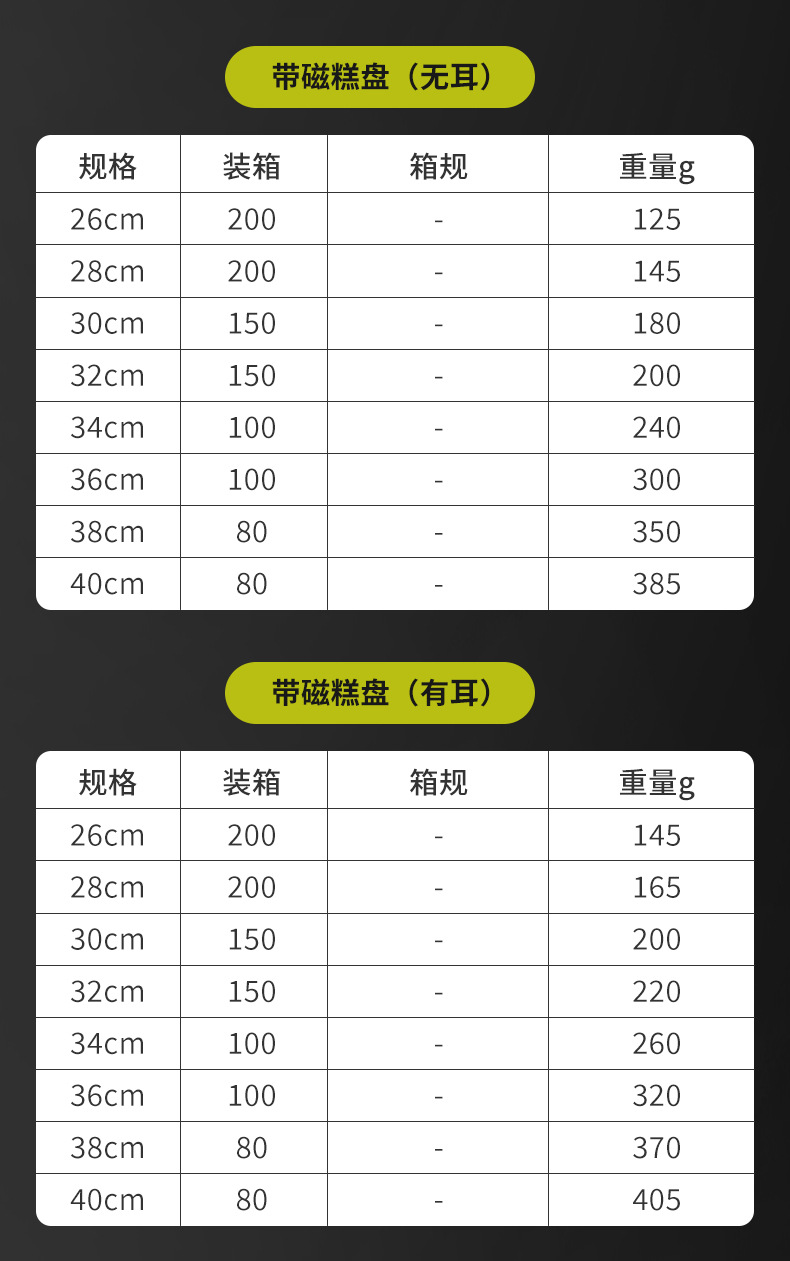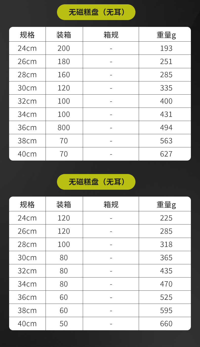 | 糕盘 | 26cm | 带磁410 | 2.3 | 200 | 125 |