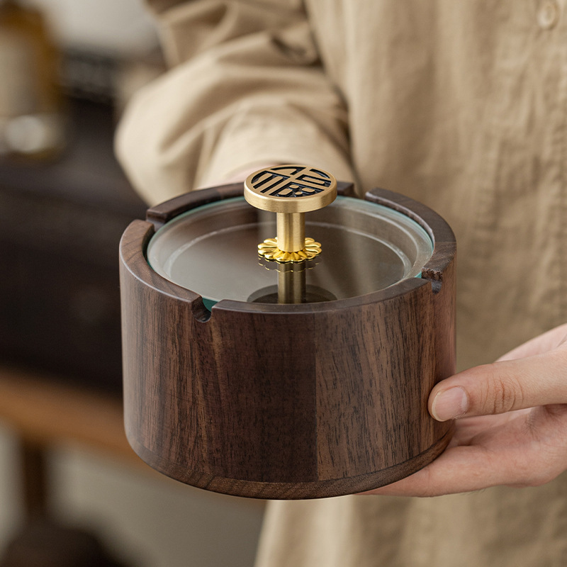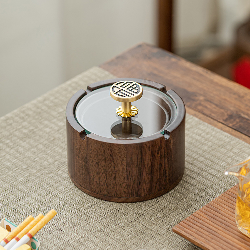 • 검은 호두나무 유리 뚜껑이 달린 내부 원형 재떨이