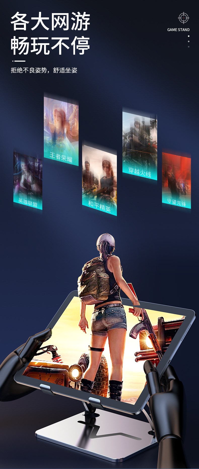 打游戏人群-可搭配半导体散热器使用,支架自带线槽不卡充电线,加大加宽面板,放平板更稳固。