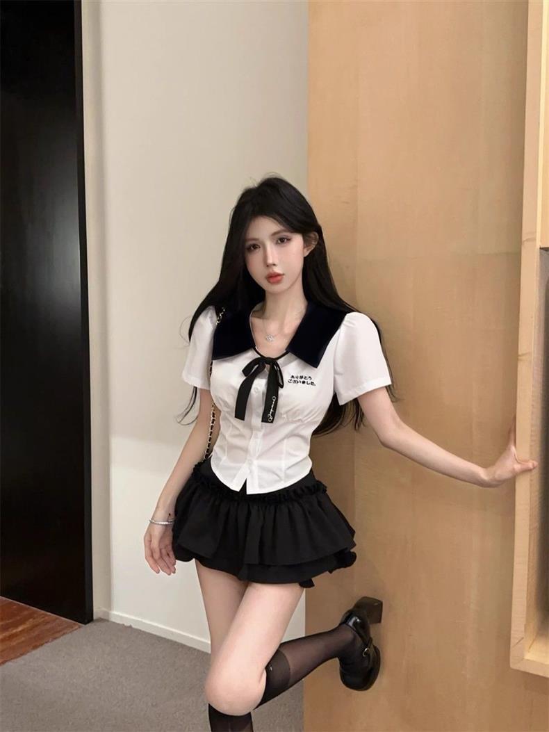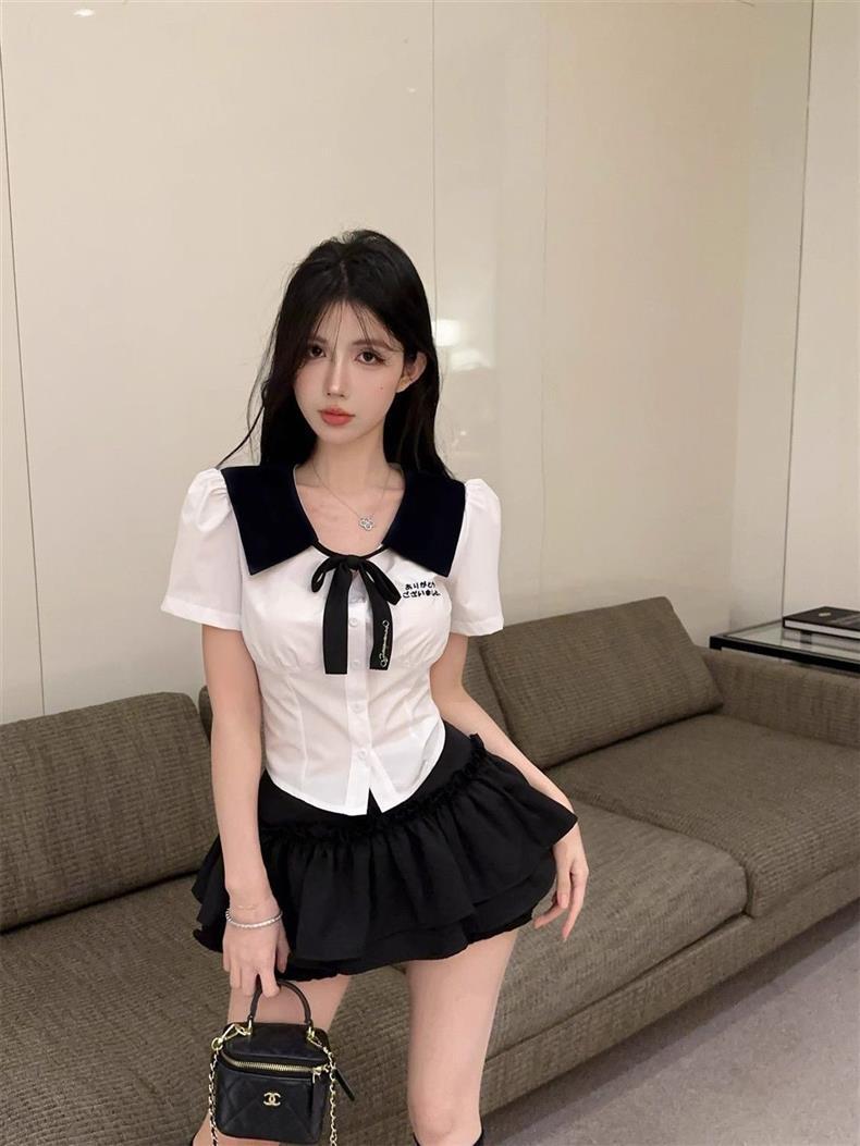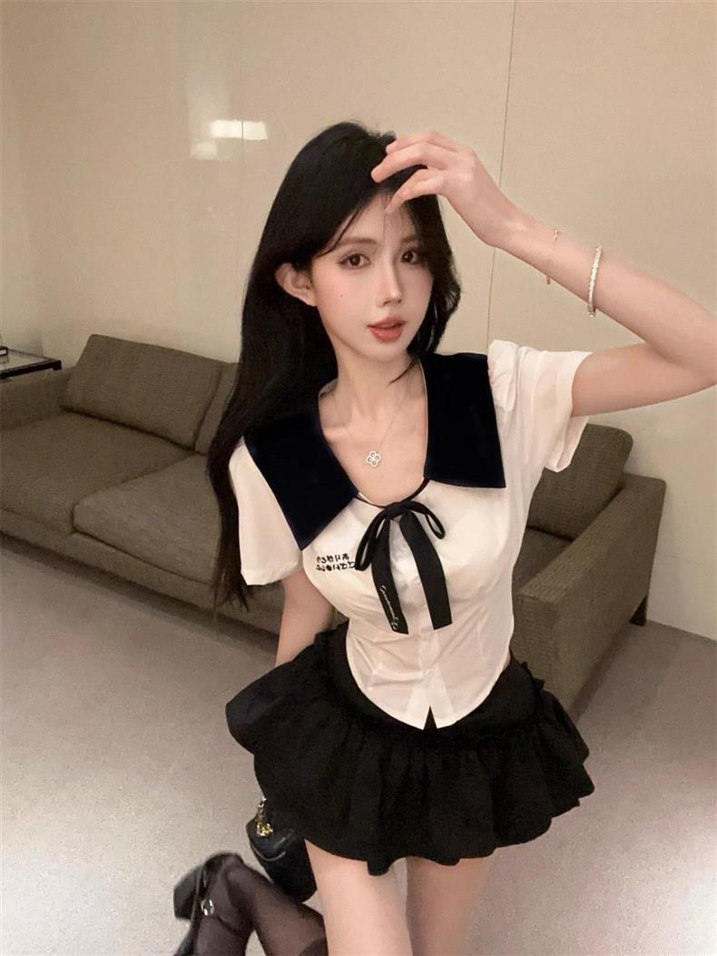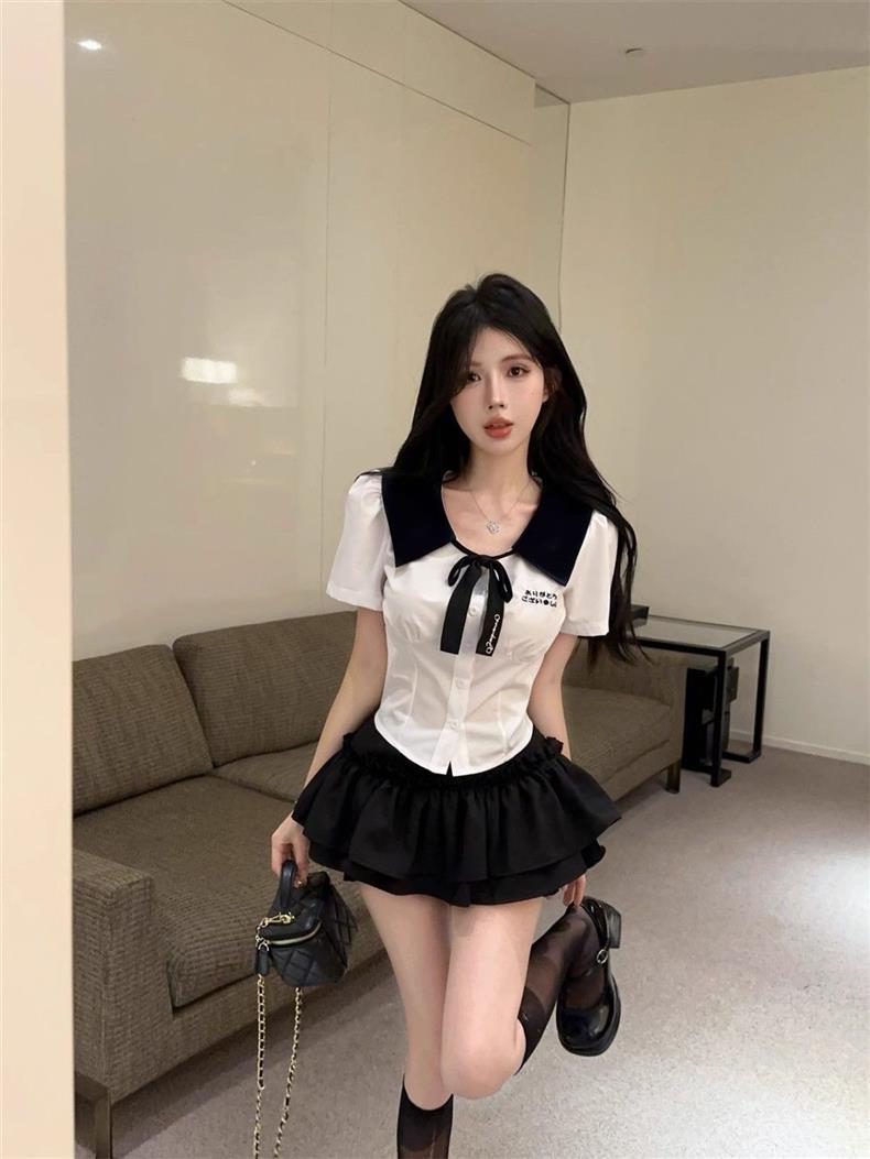 순수 욕망 대학 스타일 JK 유니폼 세트 여성 여름 쇼트 탑 하이 허리 케이크 바지 스커트 나비 넥타이 3 피스 세트