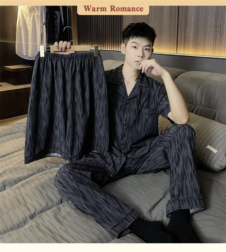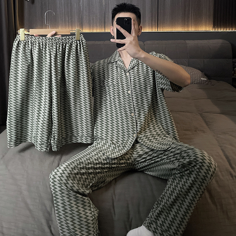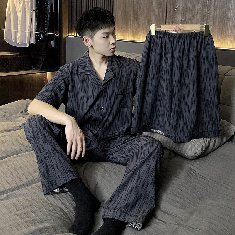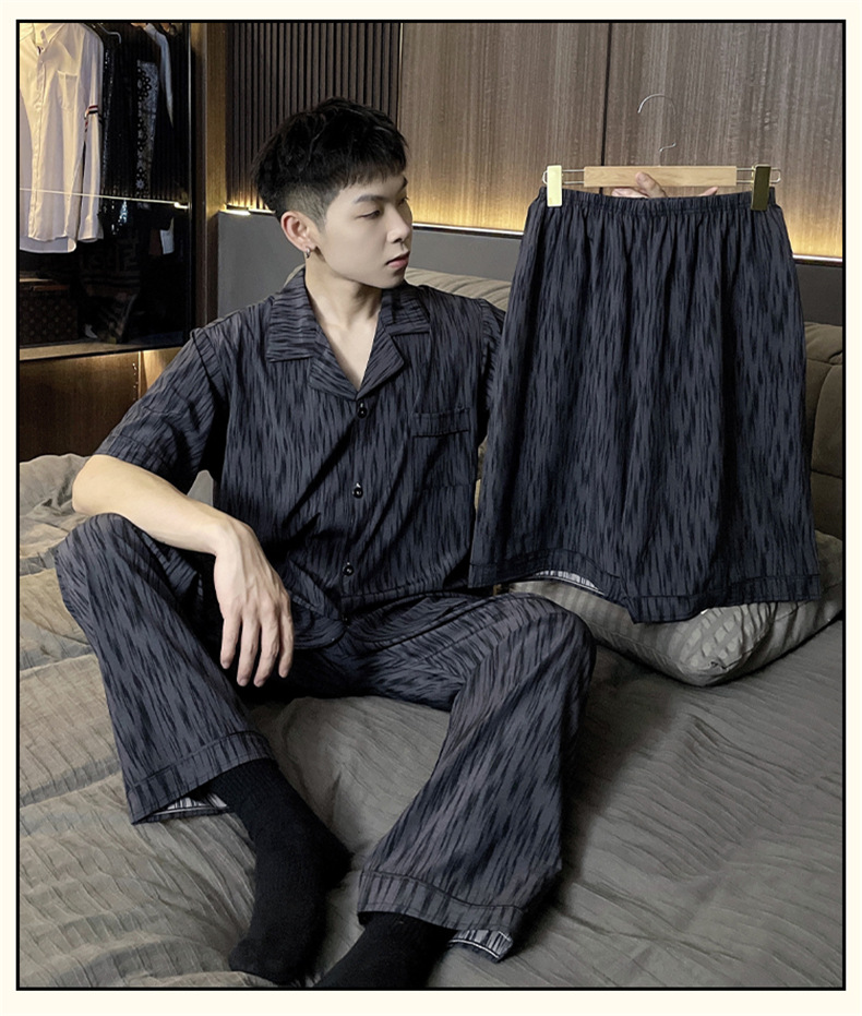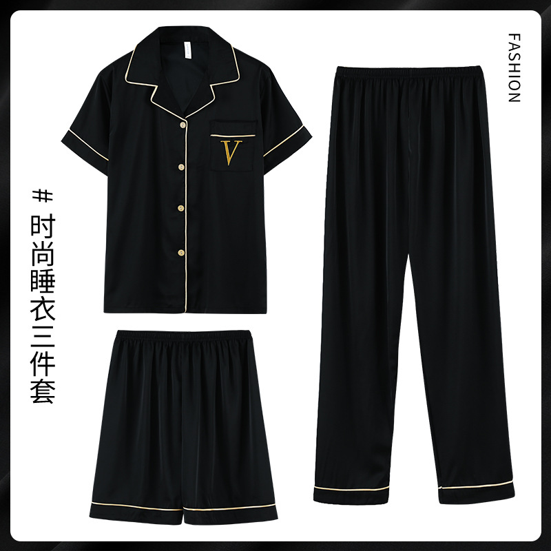 남성용 여름 잠옷, 얇은 아이스 실크 반팔 긴바지 3종 세트, 2026년 신상, 큰 사이즈 남성 홈웨어, 고급스러운 느낌