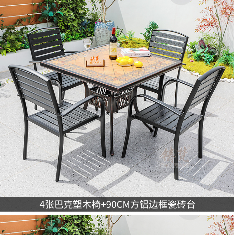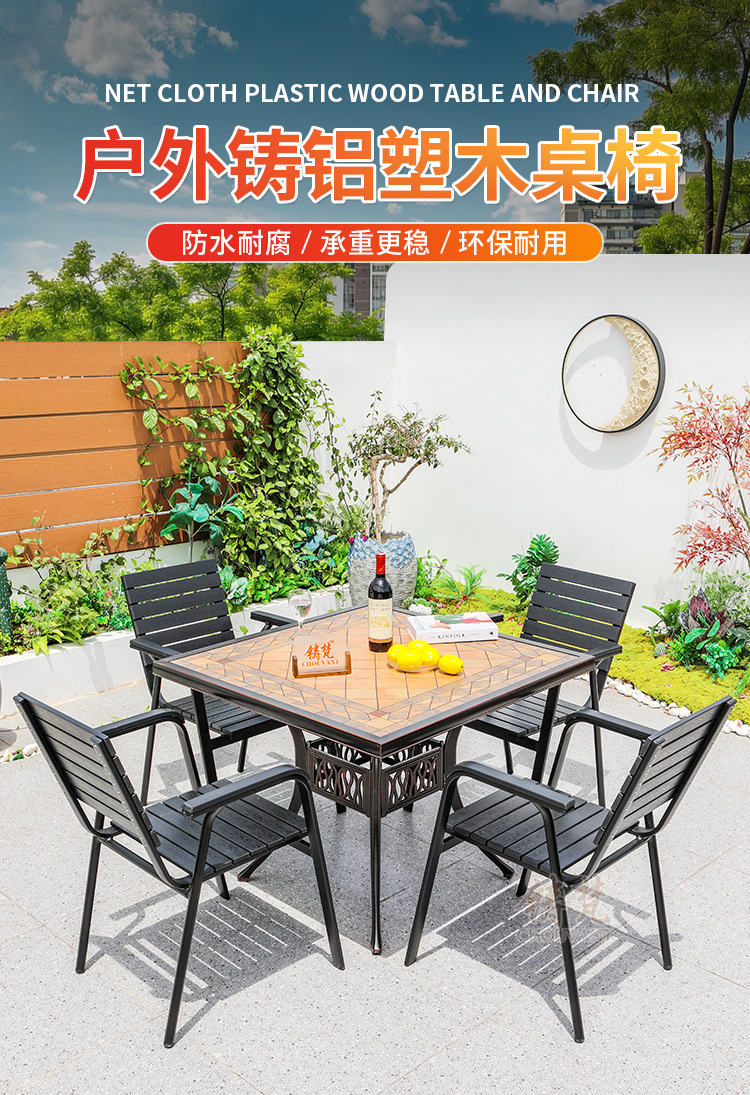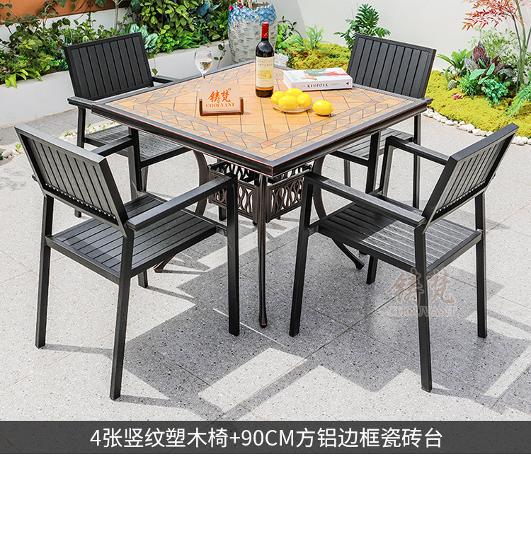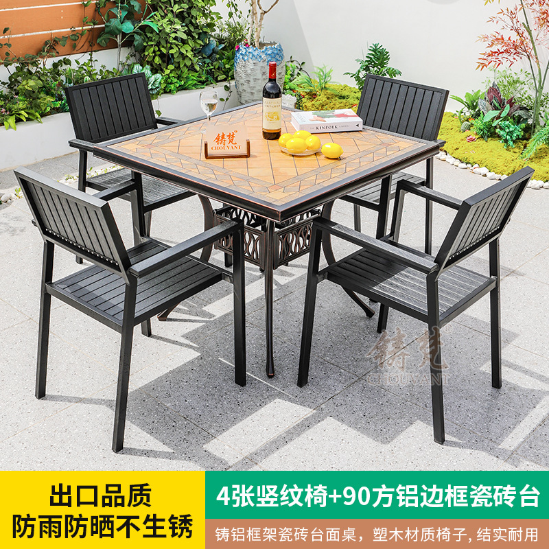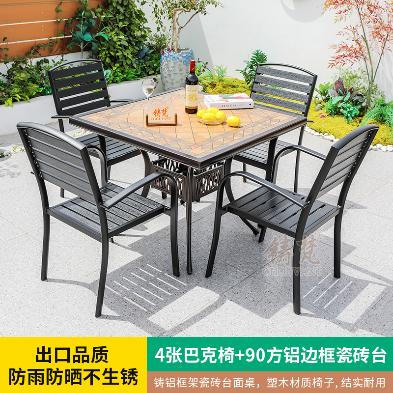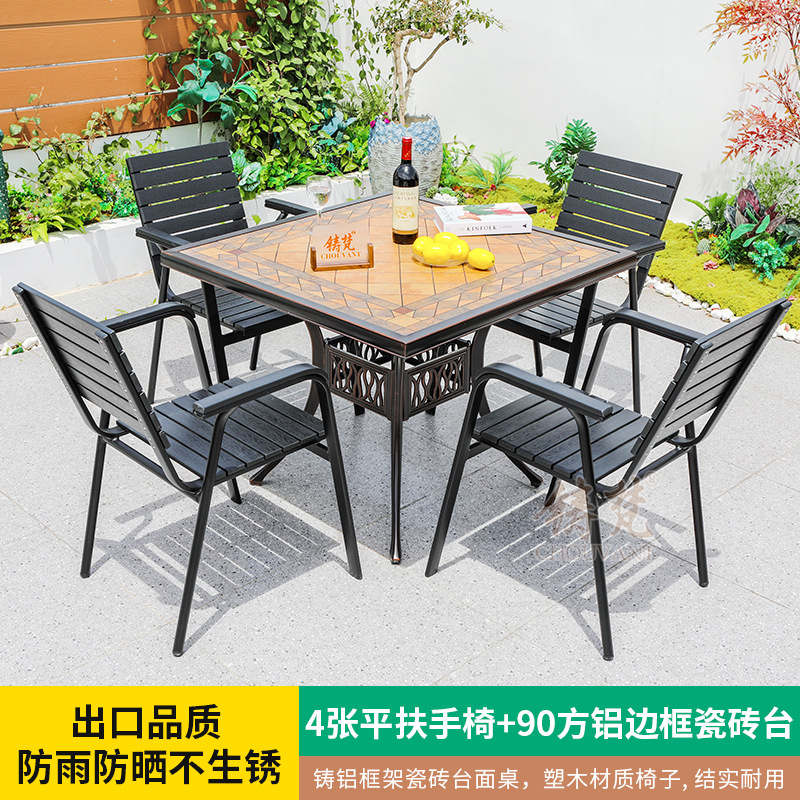 야외 플라스틱 목재 타일 테이블과 의자 안뜰 야외 레저 식탁 정원 야외 발코니 카페 테이블과 의자 조합