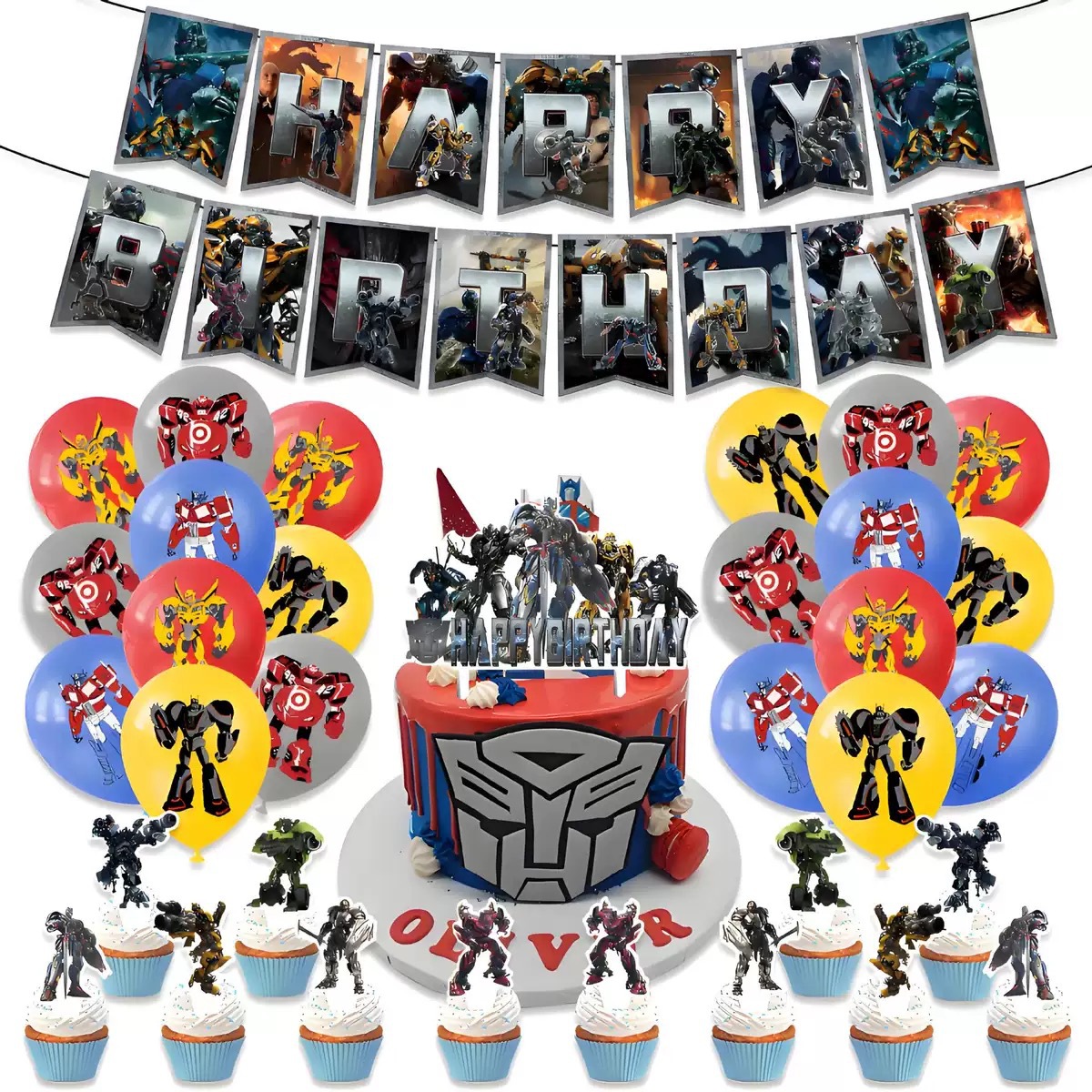 트랜스포머 테마 생일 파티 배경 장식 세트, 깃발, 라텍스 풍선, 애니메이션 스타일 케이크