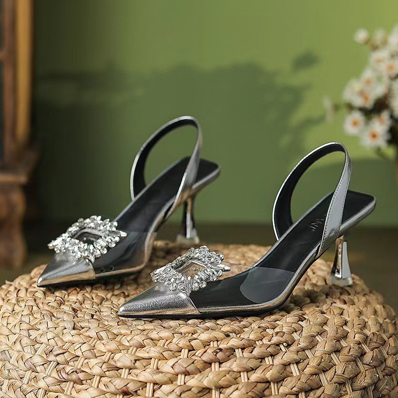 2025 새로운 대형 라인스톤 스퀘어 버클 하이힐, 여성용 페어리 스타일 투명 토캡 샌들, 여성용 스틸레토 힐, 포인티드 토, 여성용 백스토어 가기