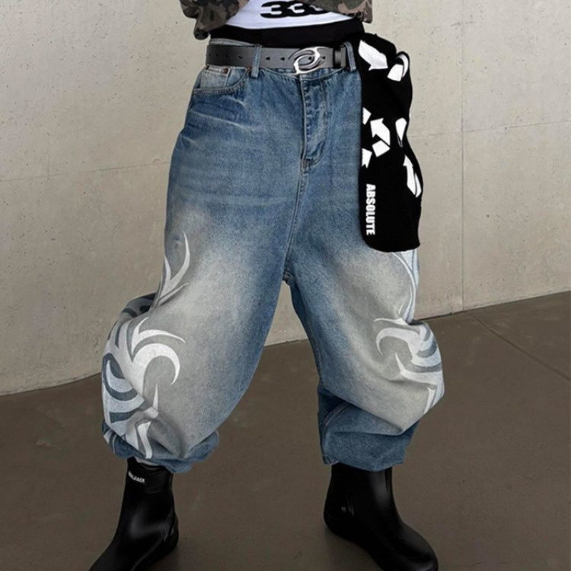 美式复古大码图腾大印花牛仔裤子女2025春辣妹设计感拖地长裤
