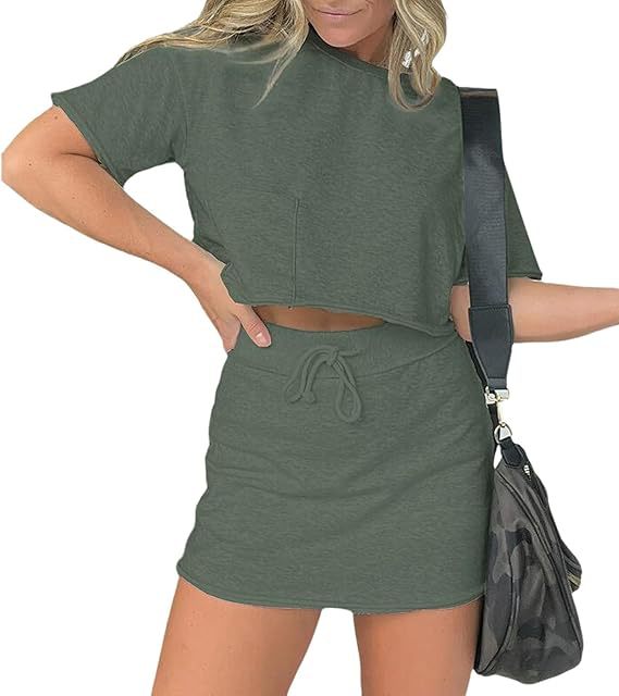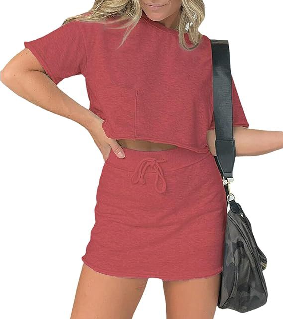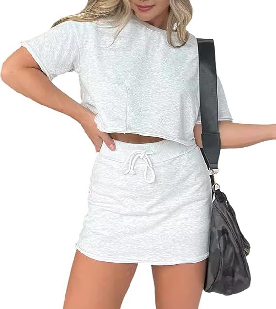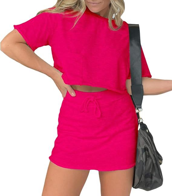 2025 여성 여름 패션 투피스 짧은 소매 크루 넥 티셔츠 및 높은 허리 타이트 짧은 치마 세트스토어 가기