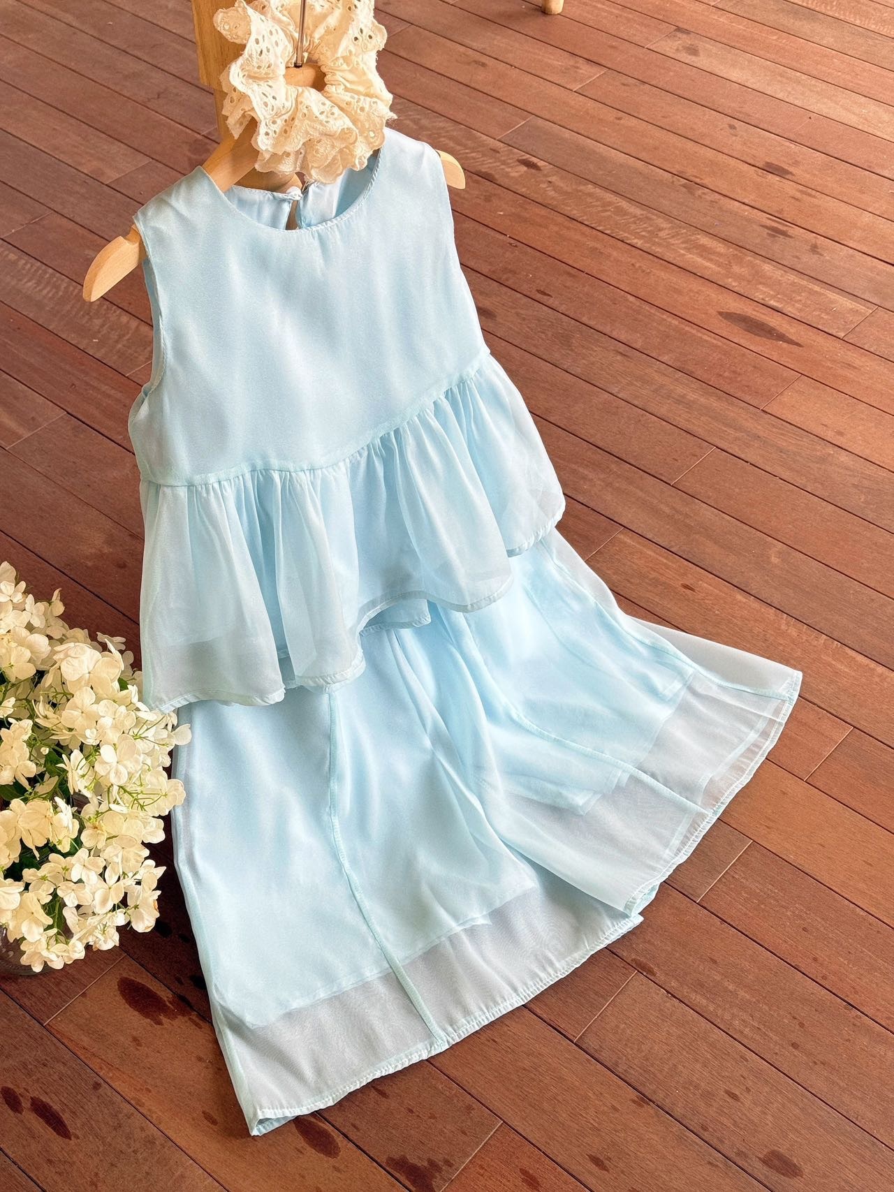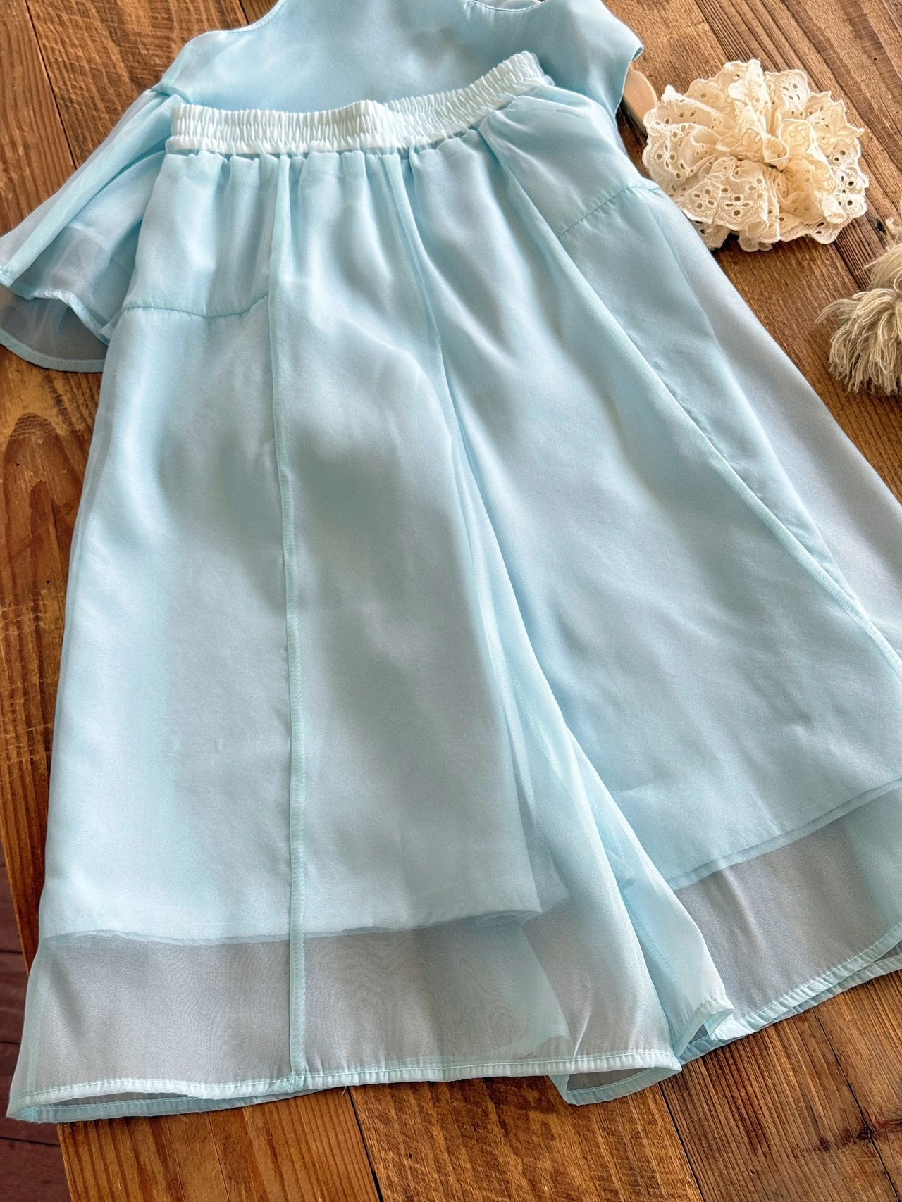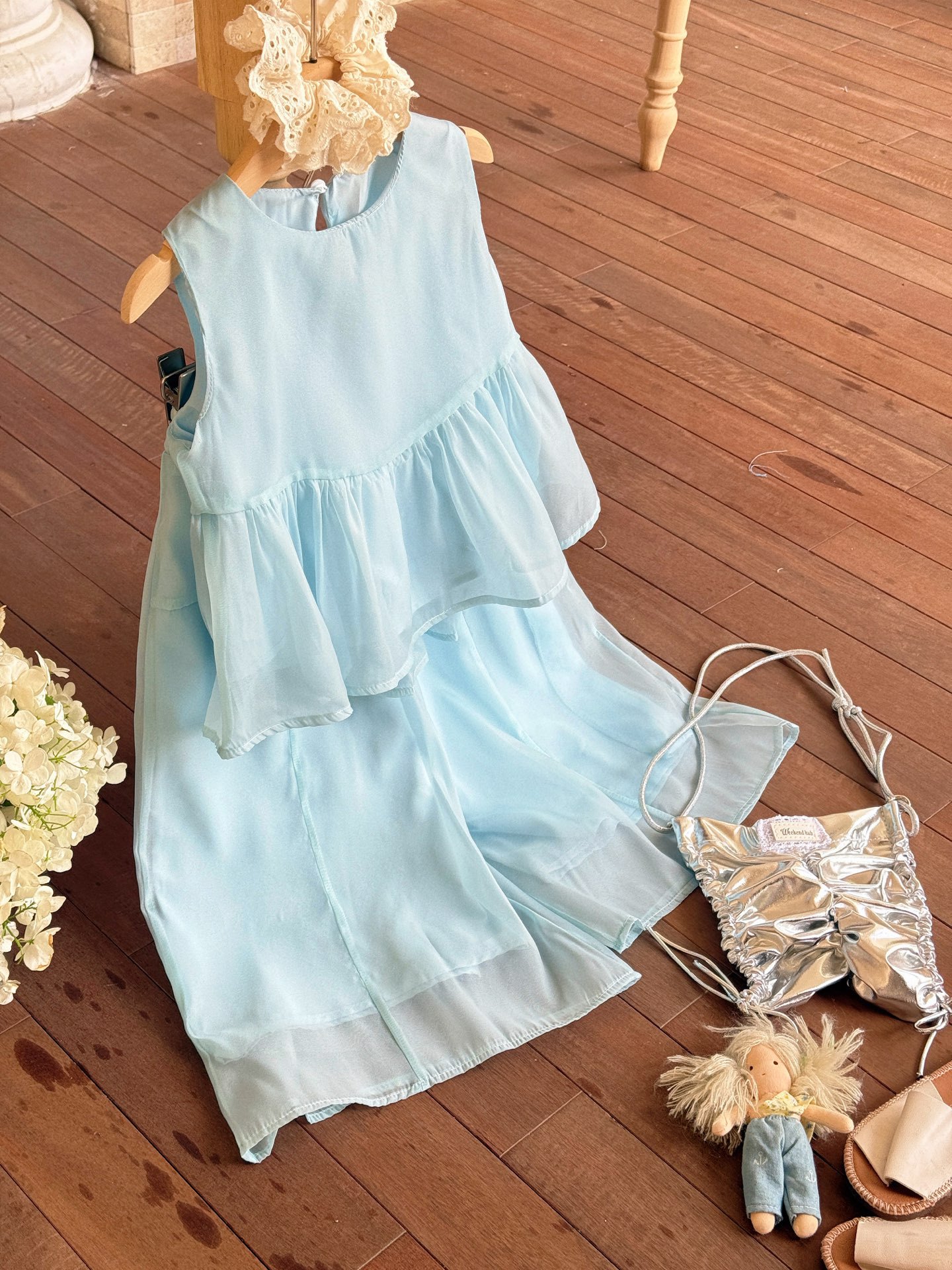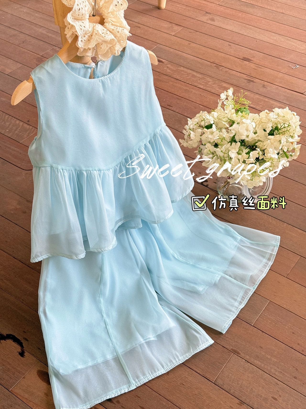 아기 소녀 2025 새로운 얇은 세트 여름 원피스 서양식 민소매 최고 캐주얼 와이드 다리 바지 투피스 세트