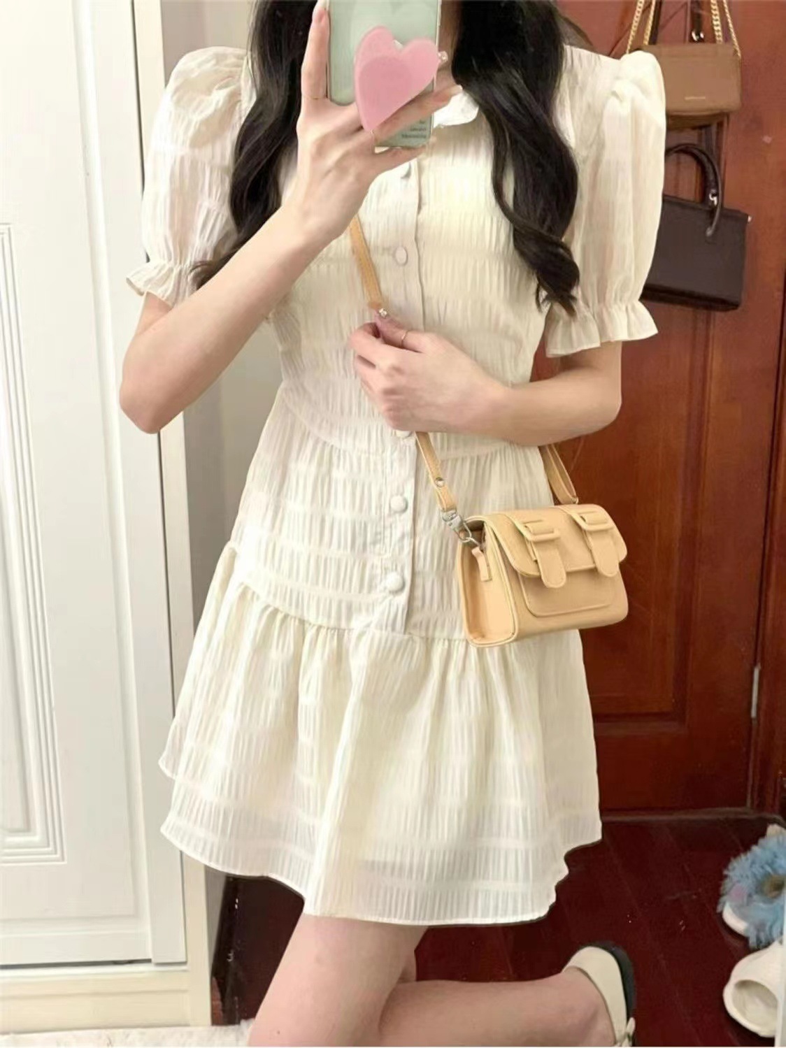 프랑스 스타일 한국 스타일 달콤한 폴로 칼라 원피스 퍼프 소매 쉬폰 여성 여름 디자인 틈새 높은 허리 우아한 스커트