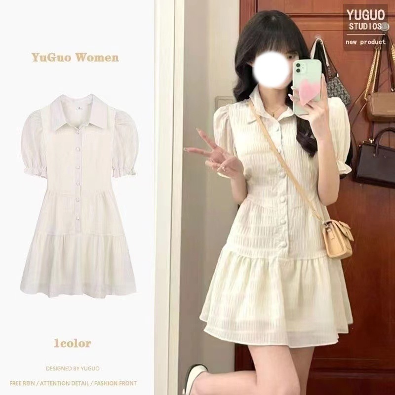 프랑스 스타일 한국 스타일 달콤한 폴로 칼라 원피스 퍼프 소매 쉬폰 여성 여름 디자인 틈새 높은 허리 우아한 스커트스토어 가기
