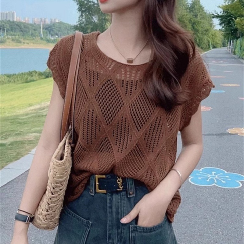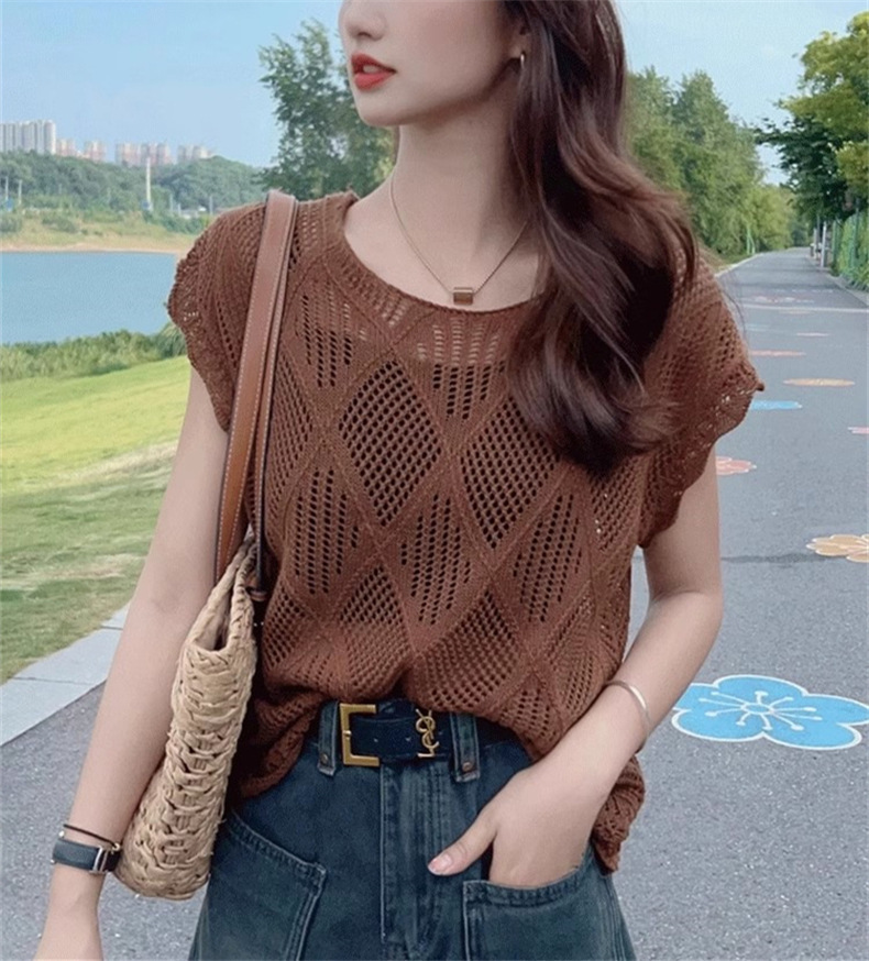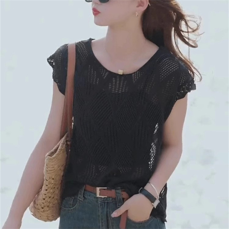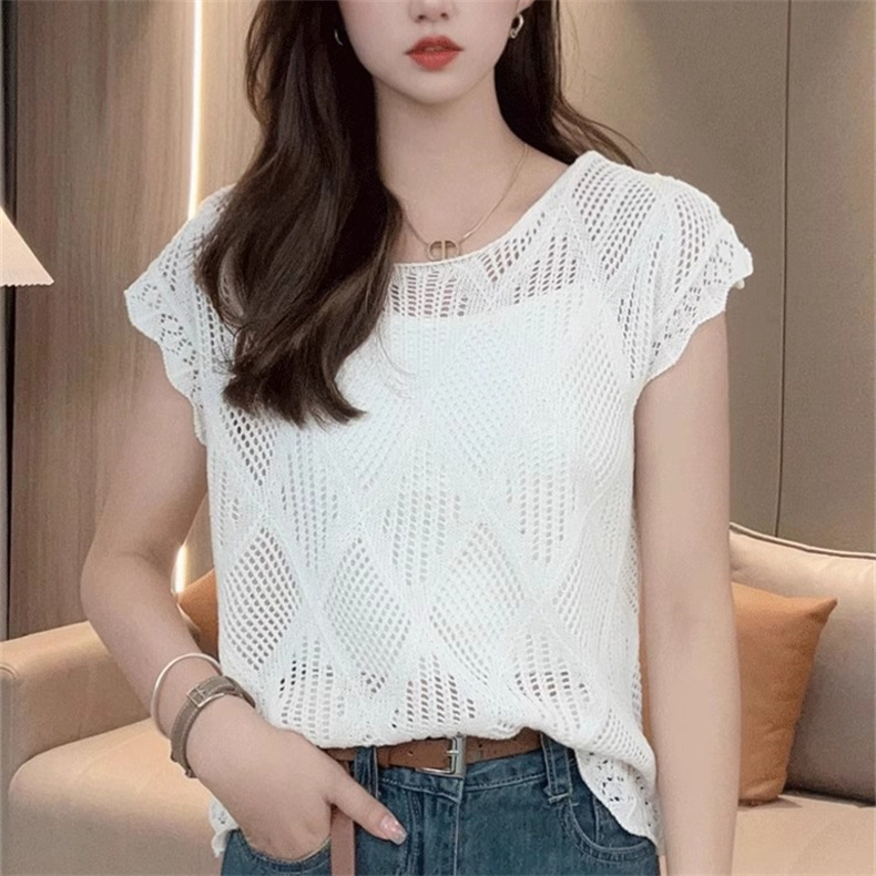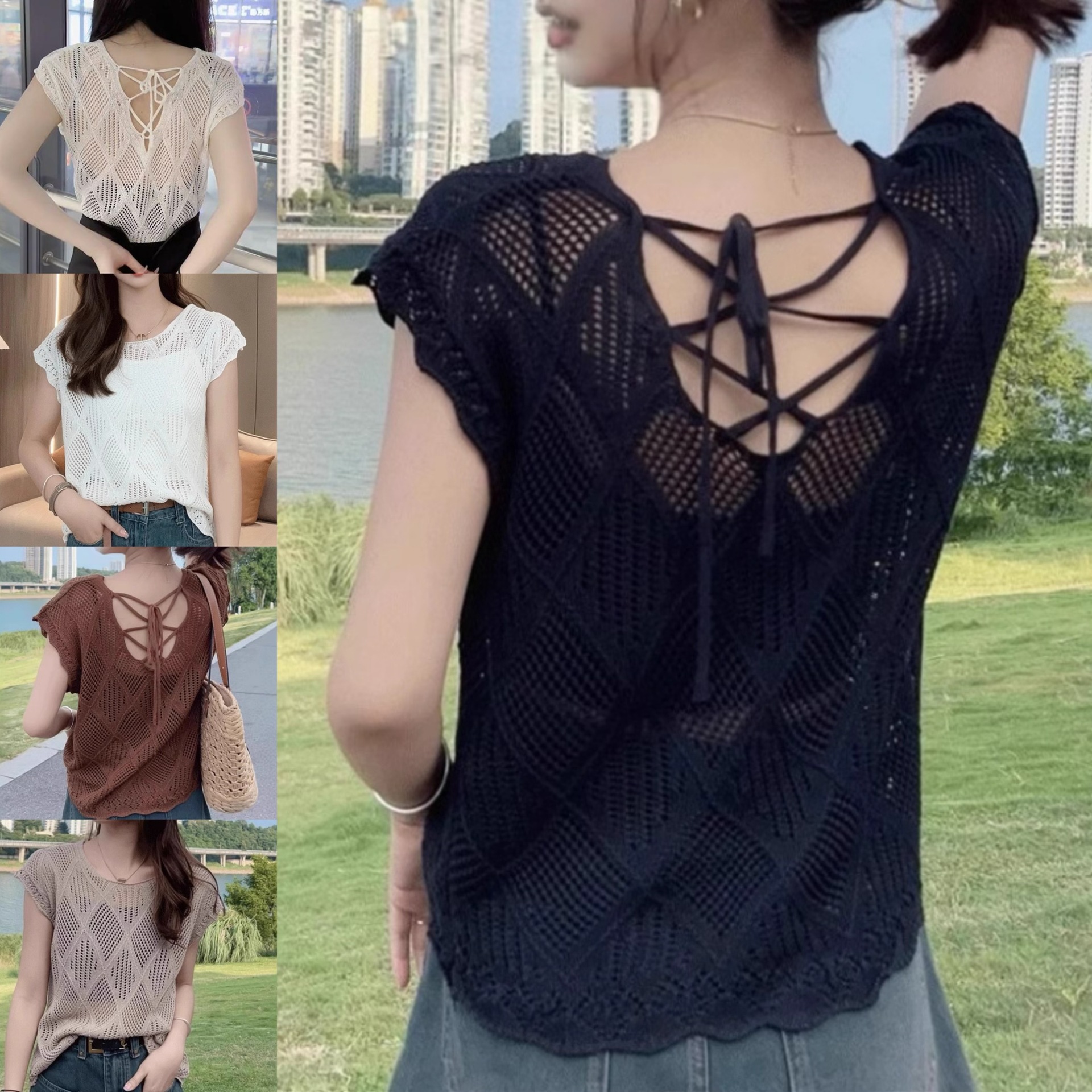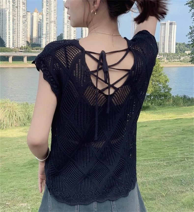 여성을위한 중공 니트 스웨터 2025 여름 새로운 반팔 블라우스 레이스 업 백리스 얇은 티셔츠 핫 소녀 탑스토어 가기
